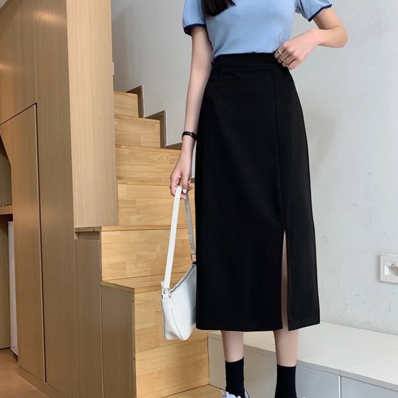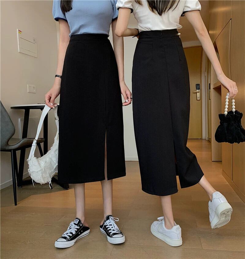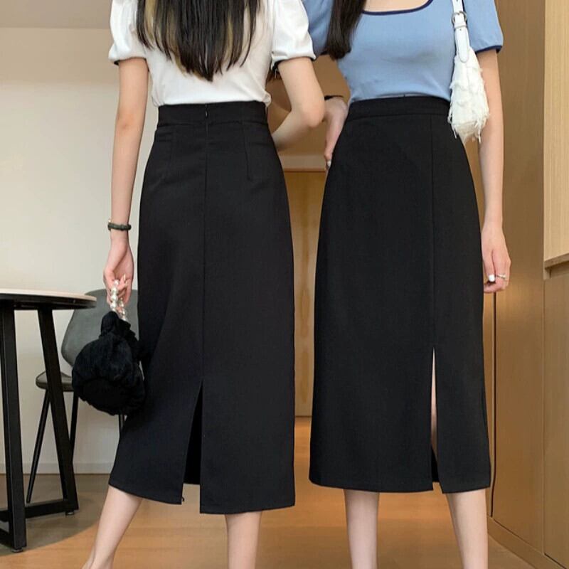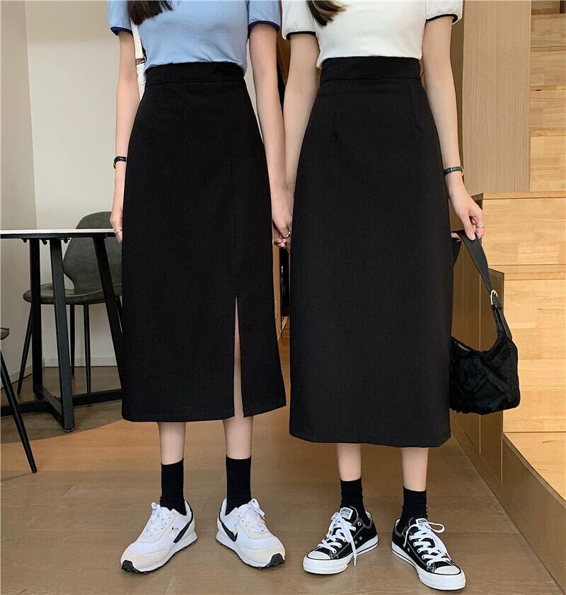 大きいサイズの黒のスーツスカートは夏に太く、ハイウエストとスリムなミモレ丈のスリットヒップカバーAラインスカートです ハイウェスト ブラック 大きめサイズ サマー 夏物 8884135832205477