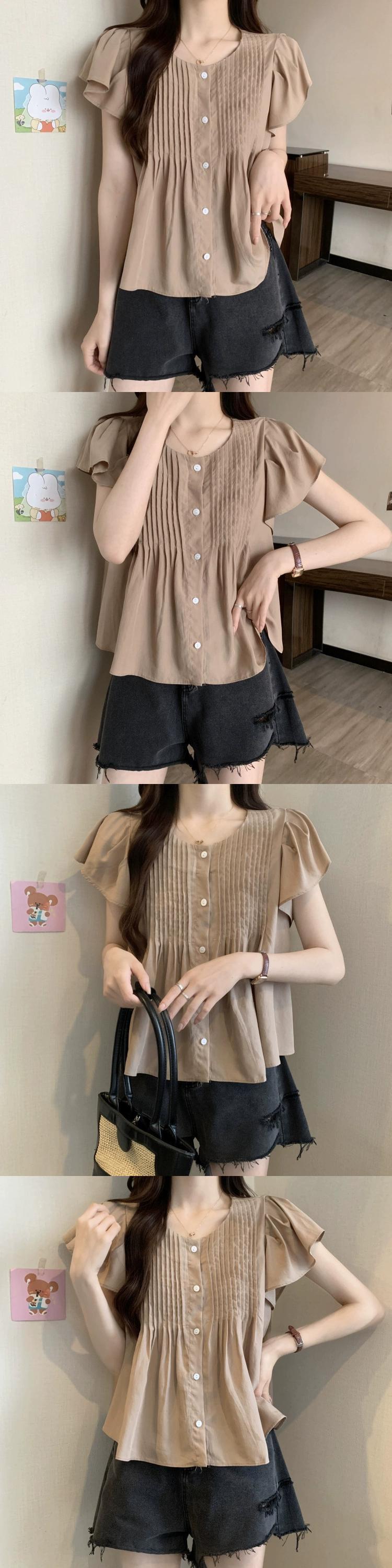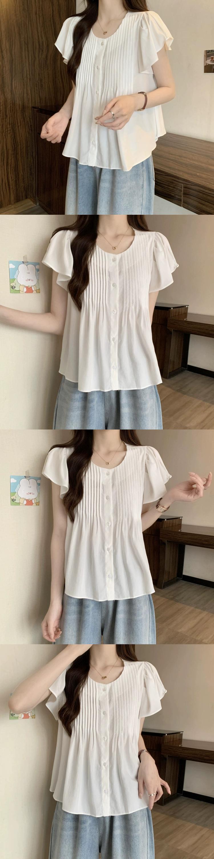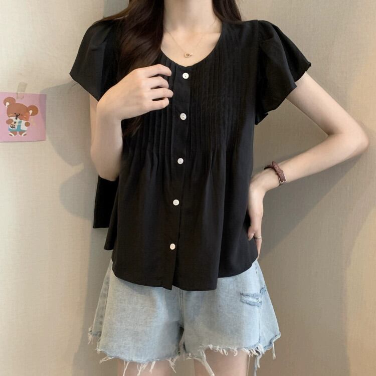プラスサイズの婦人服 2023 ファットシスター夏服新しいラウンドネック甘いプリーツフリルルーズ半袖シャツトップ 大きめサイズ 大人ガーリー スウィート キュート カジュアル サマー 夏物 Oネック 8884138987849751