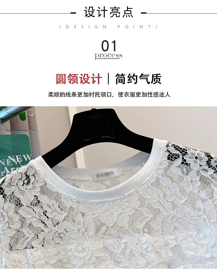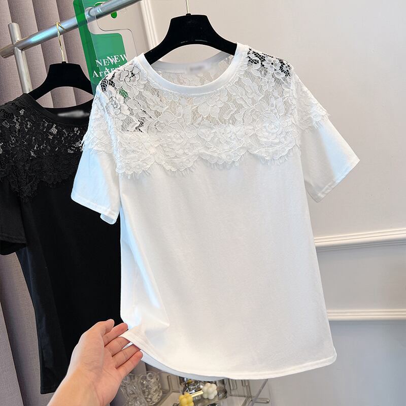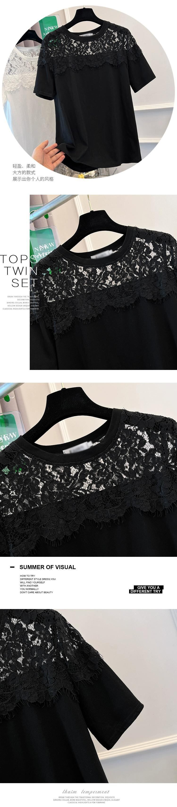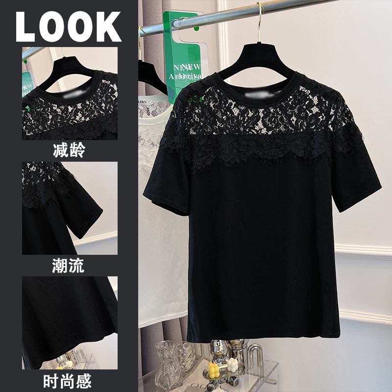 プラスサイズの婦人服 2023 脂肪姉妹夏の新ファッションファッション年齢削減痩身レースステッチ半袖ラウンドネック Tシャツトップ 大きめサイズ サマー 夏物 Oネック 8884128822806897