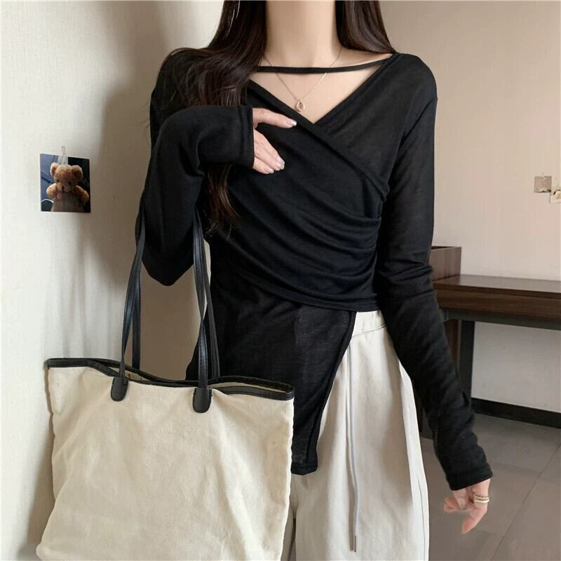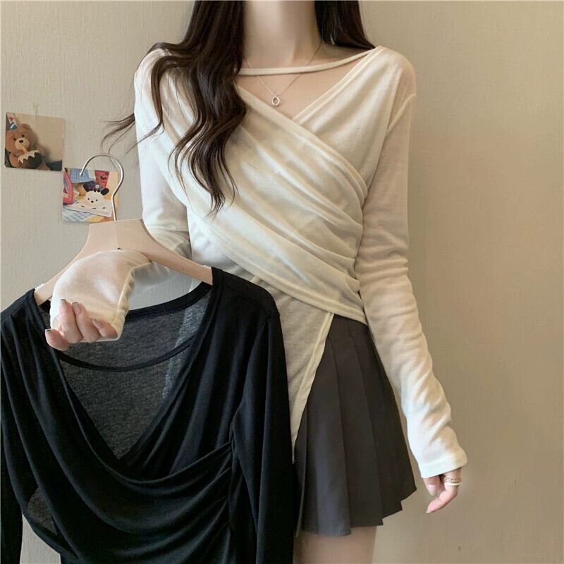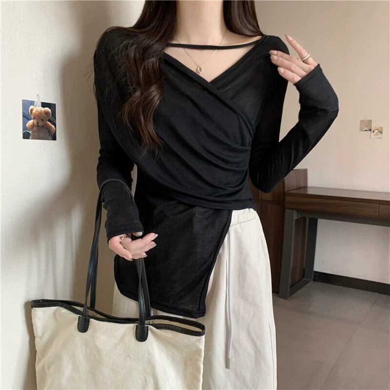 プラスサイズの婦人服 2023 流行の夏の新しいファットシスターファッションハイエンド長袖 Tシャツ不規則な V ネック純粋な欲望日焼け止めシャツ ロング 大きめサイズ サマー 夏物 Vネック ピュア 8884120734603912