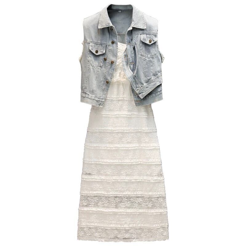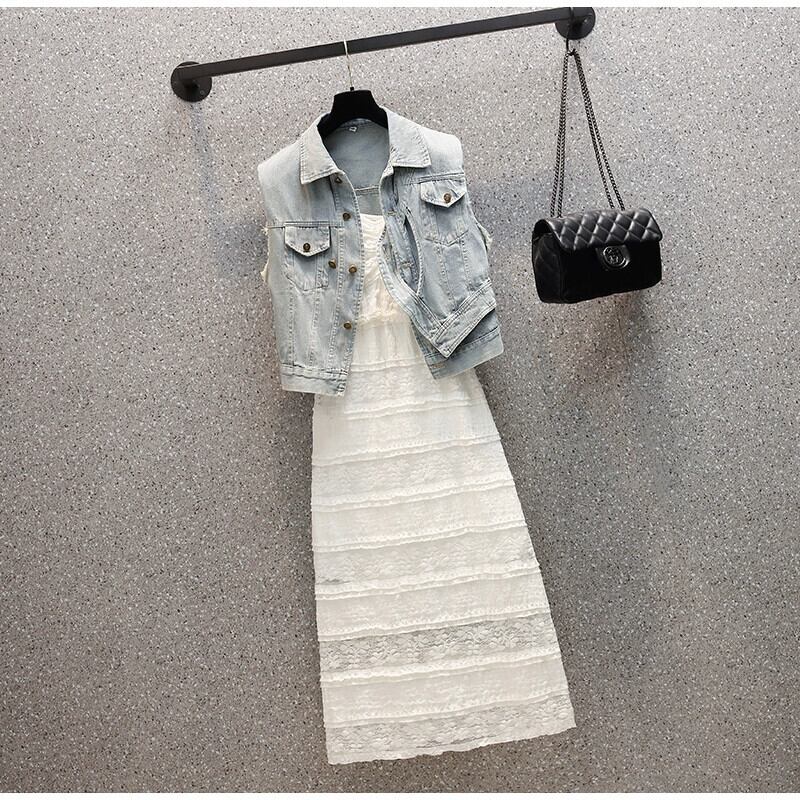 プラスサイズの女性の 2023 夏ファットシスター気質ノースリーブデニムジャケットスリップドレス 2 点セット 大きめサイズ サマー 夏物 8884114001471519