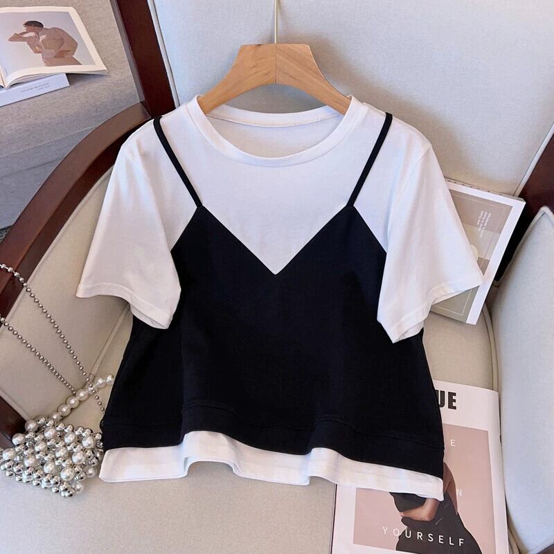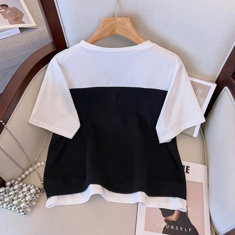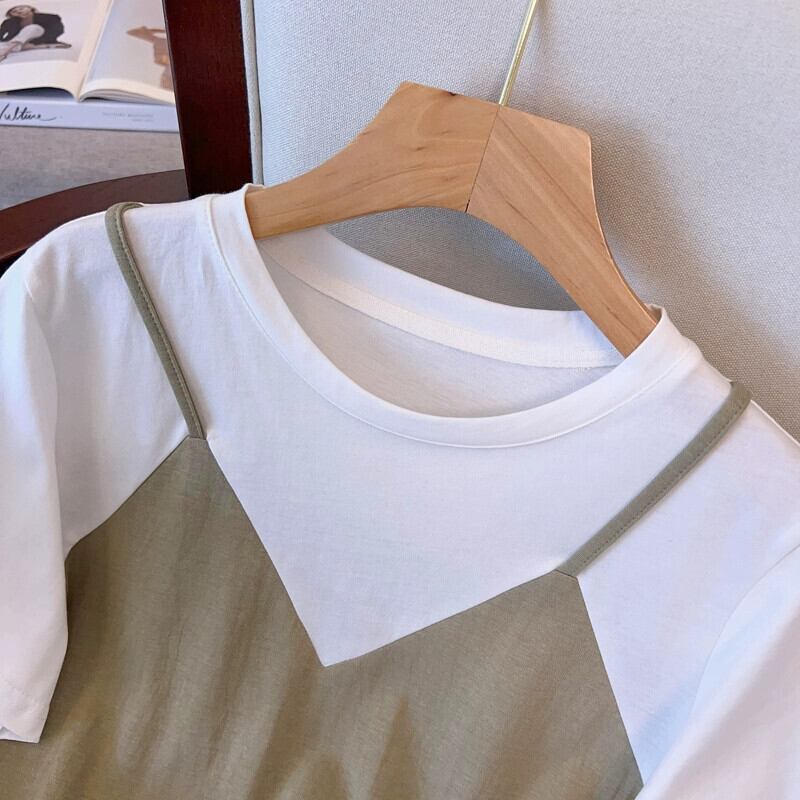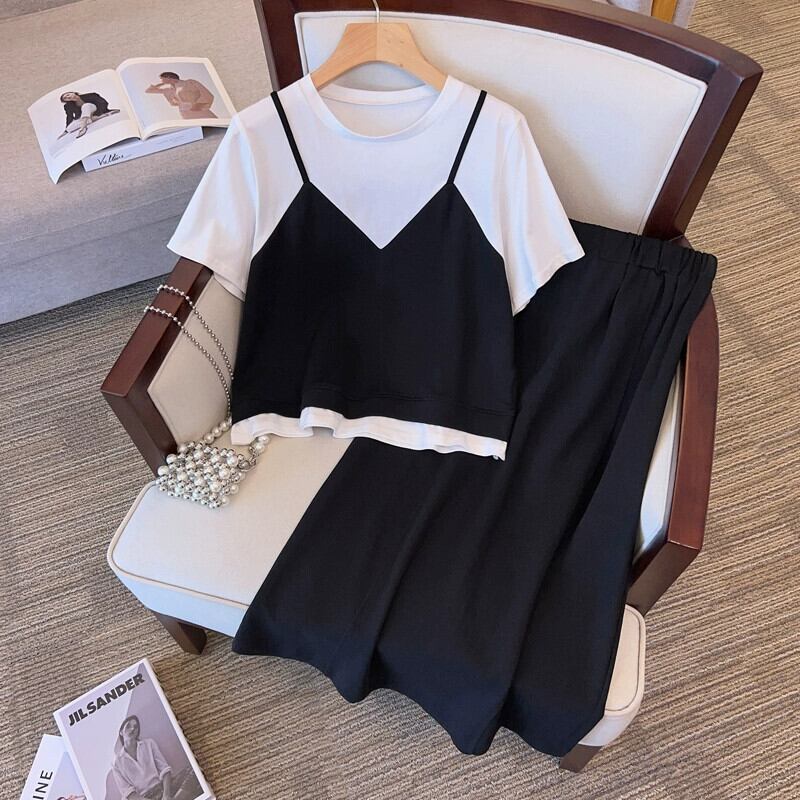 プラスサイズの婦人服 2023 流行の夏の新しいファットシスタースリム多用途スーツ偽ツーピーストップとスカートツーピースセット 大きめサイズ サマー 夏物 8884147136785872