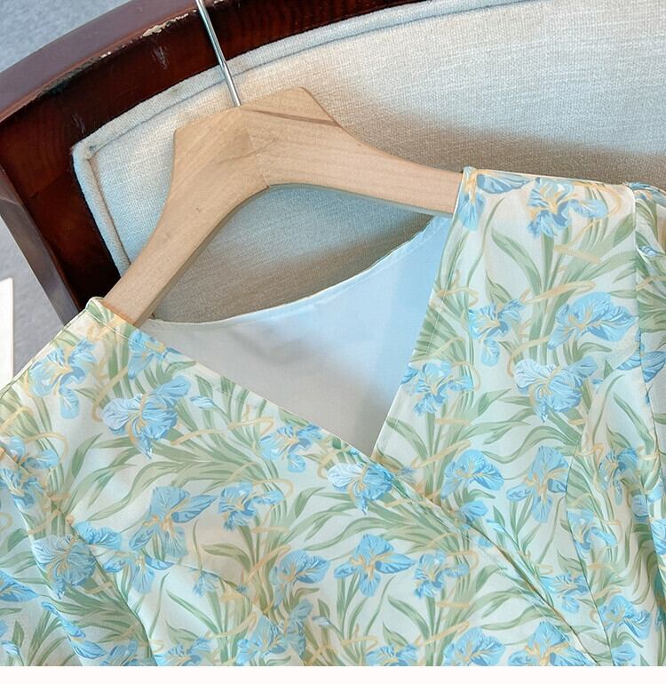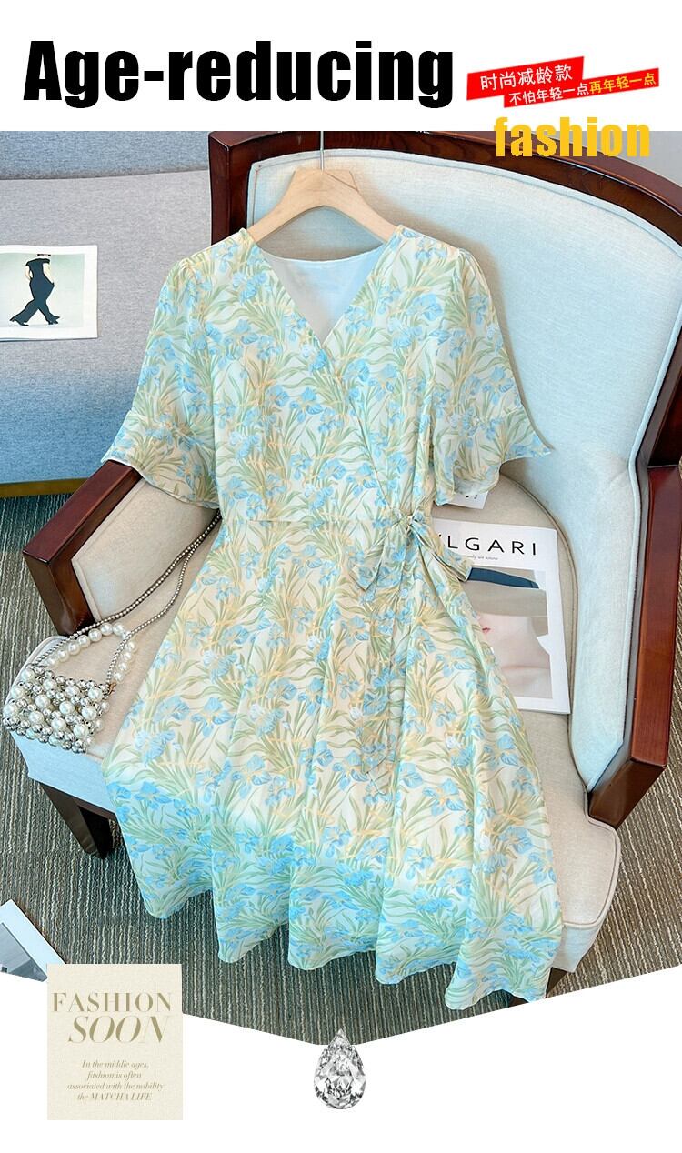 プラスサイズの婦人服 2023 脂肪姉妹夏の新しいスリム花柄スカートエレガントな気質スリム V ネックシックなドレス 大きめサイズ サマー 夏物 Vネック 8884155820951776