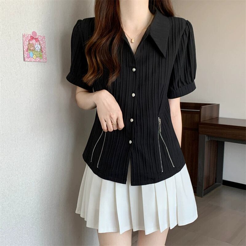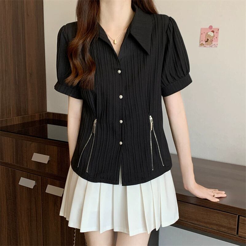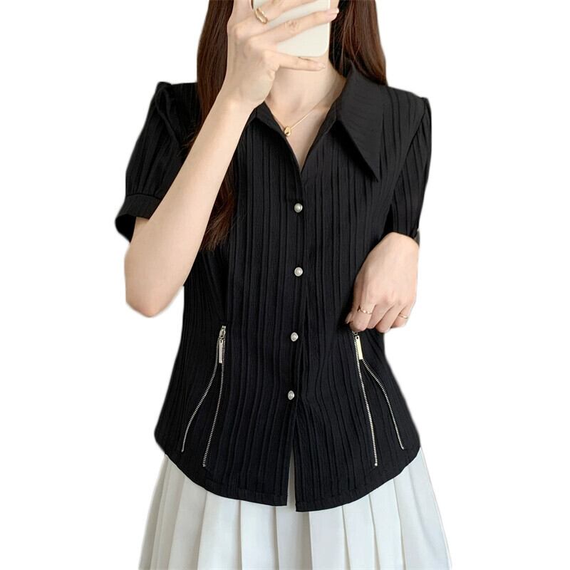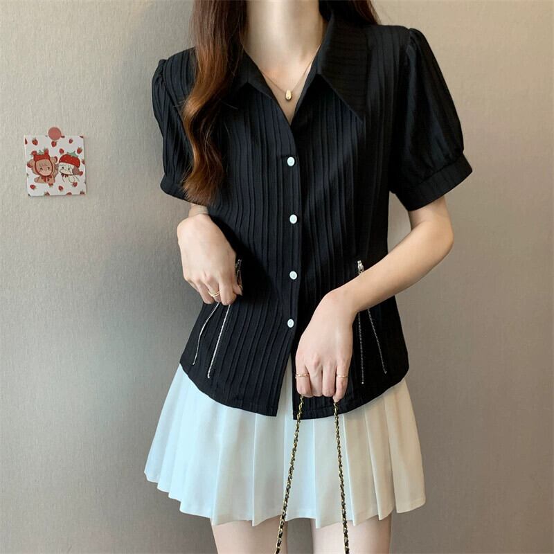 プラスサイズの女性の 2023 夏服脂肪無地ポロ襟ウエスト痩身シャツジッパーシックなニッチトップス 大きめサイズ サマー 夏物 ソリッドカラー 888411487907458