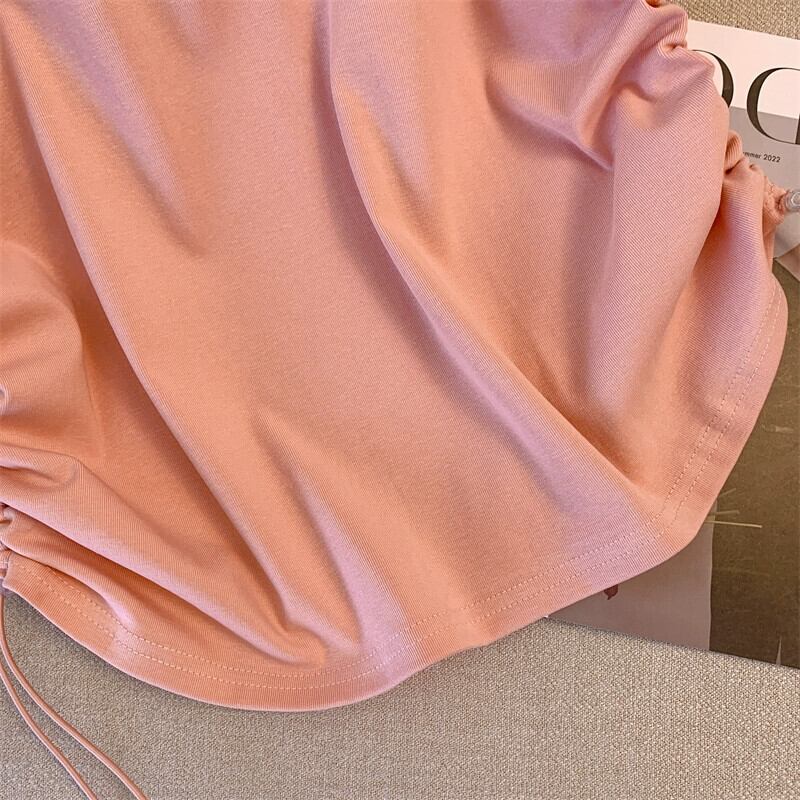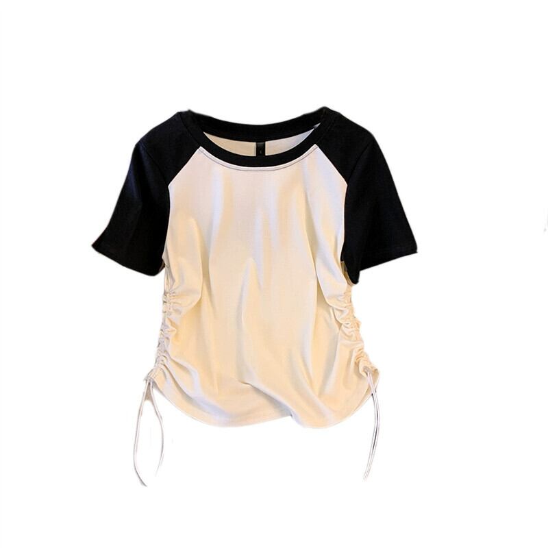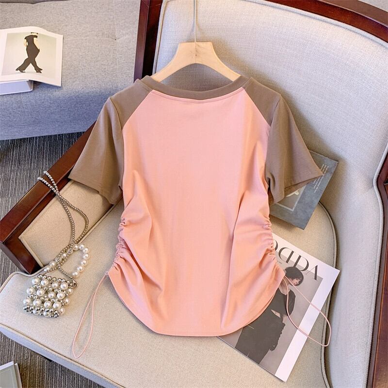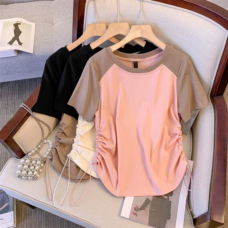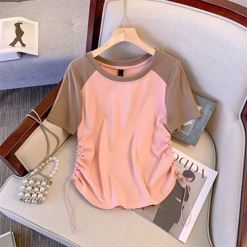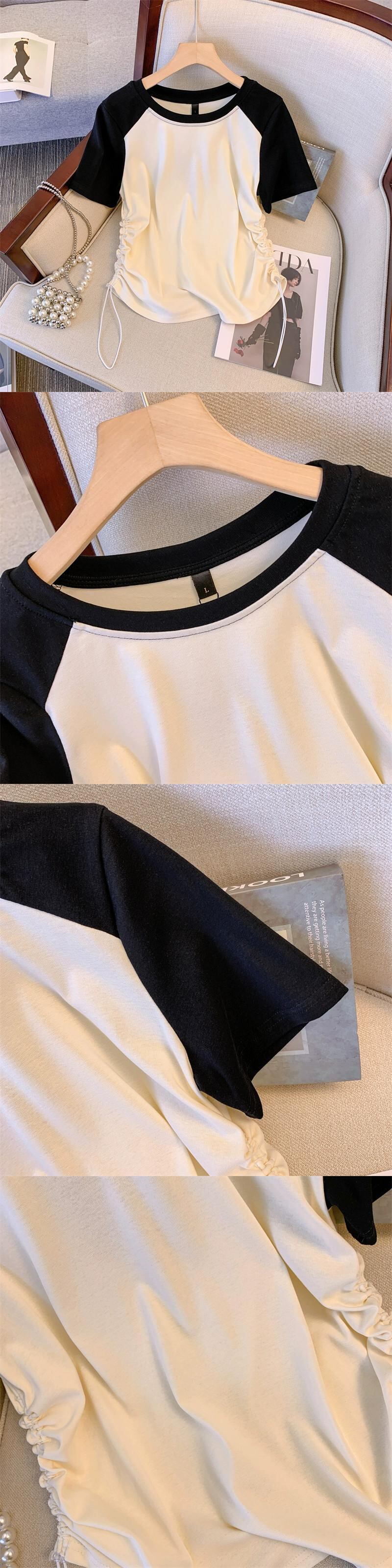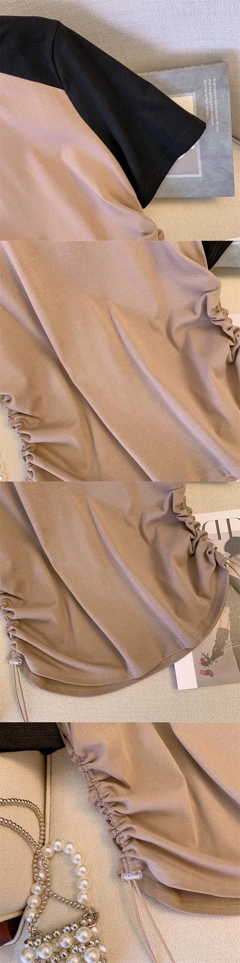 プラスサイズの女性の 2023 夏服、ファッショナブルなコントラストのあるラウンドネック、シックな T シャツ、巾着デザイン、半袖トップス 大きめサイズ サマー 夏物 Oネック Tシャツ 8884168542995164