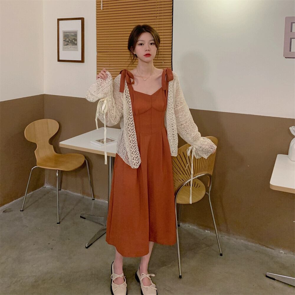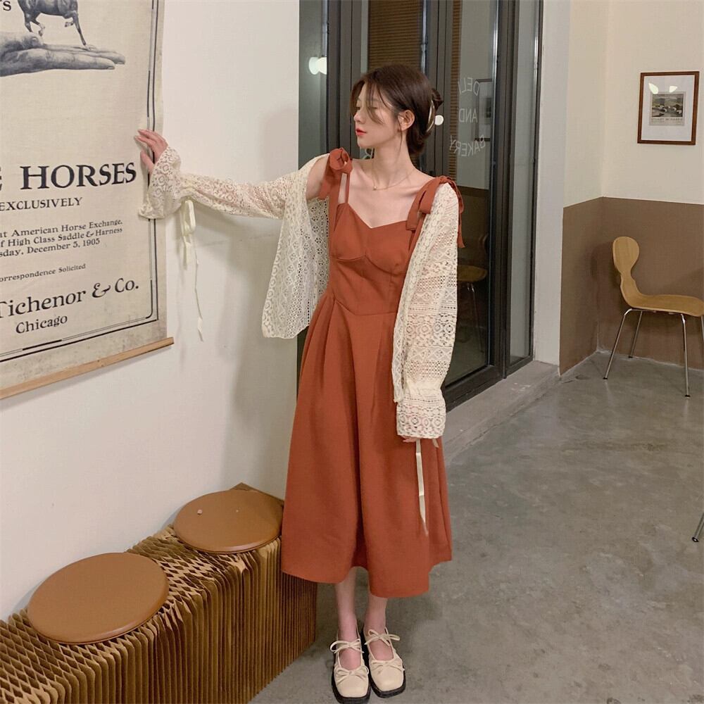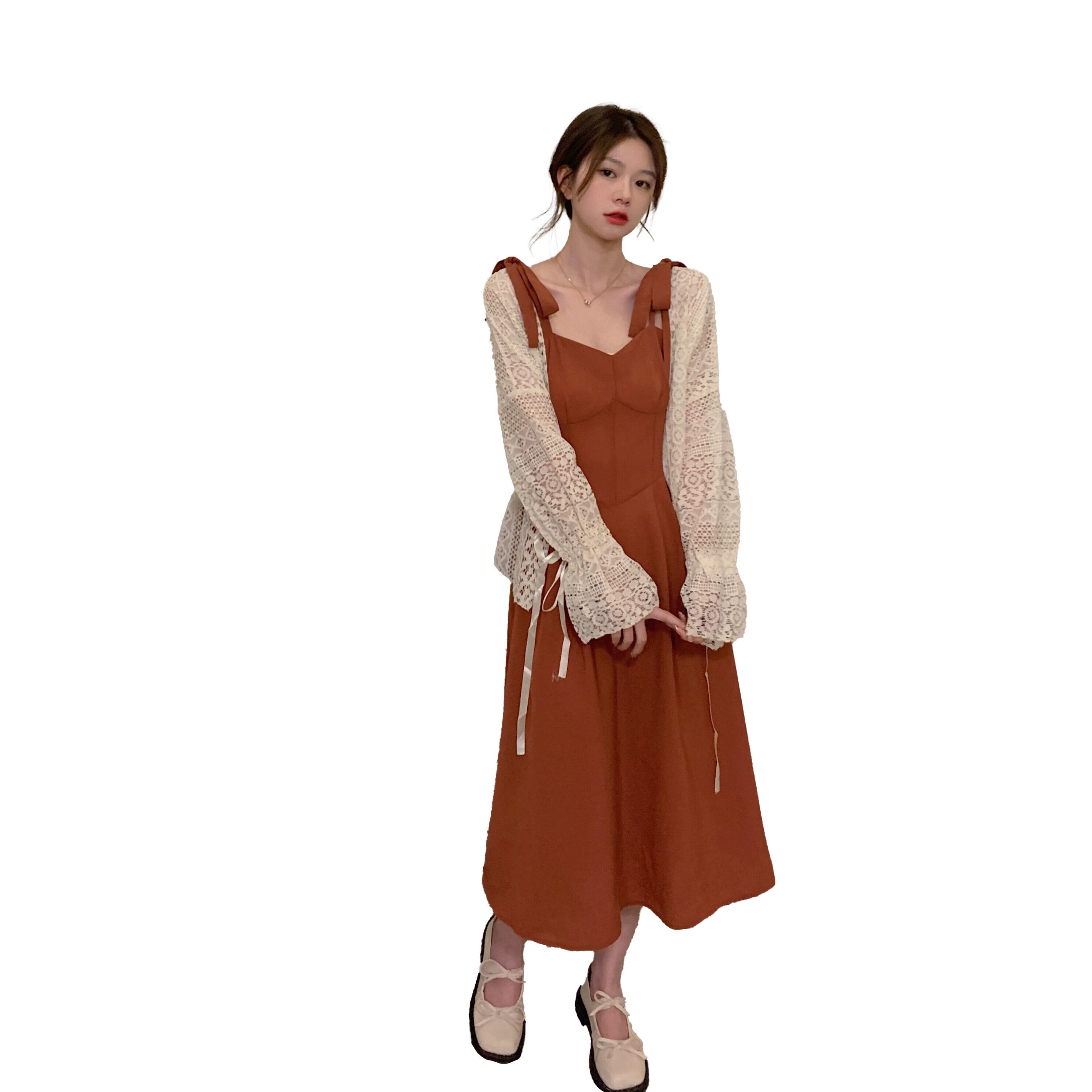 色:ブリックレッドのサスペンダースカート,アプリコットセーター