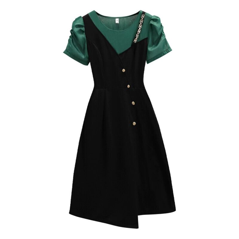 プラスサイズの婦人服 2023 脂肪姉妹夏の新しいスタイルのカラーマッチングファッションチェーン不規則なスカート痩身偽ツーピースドレス 大きめサイズ サマー 夏物 8884148402611274