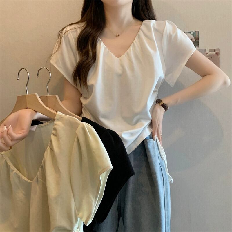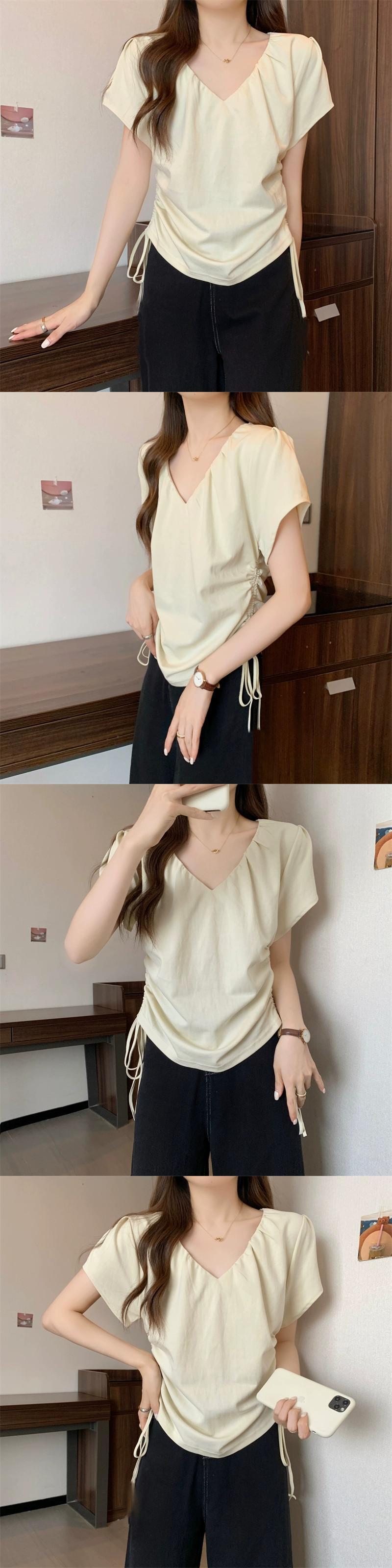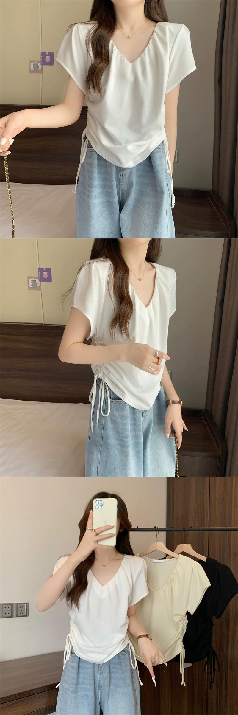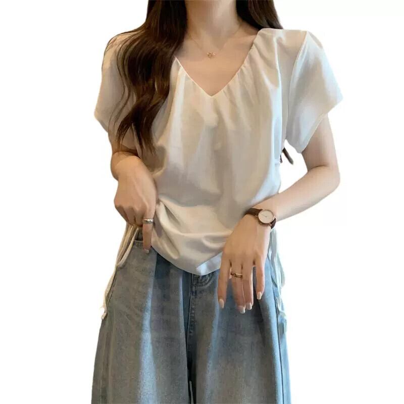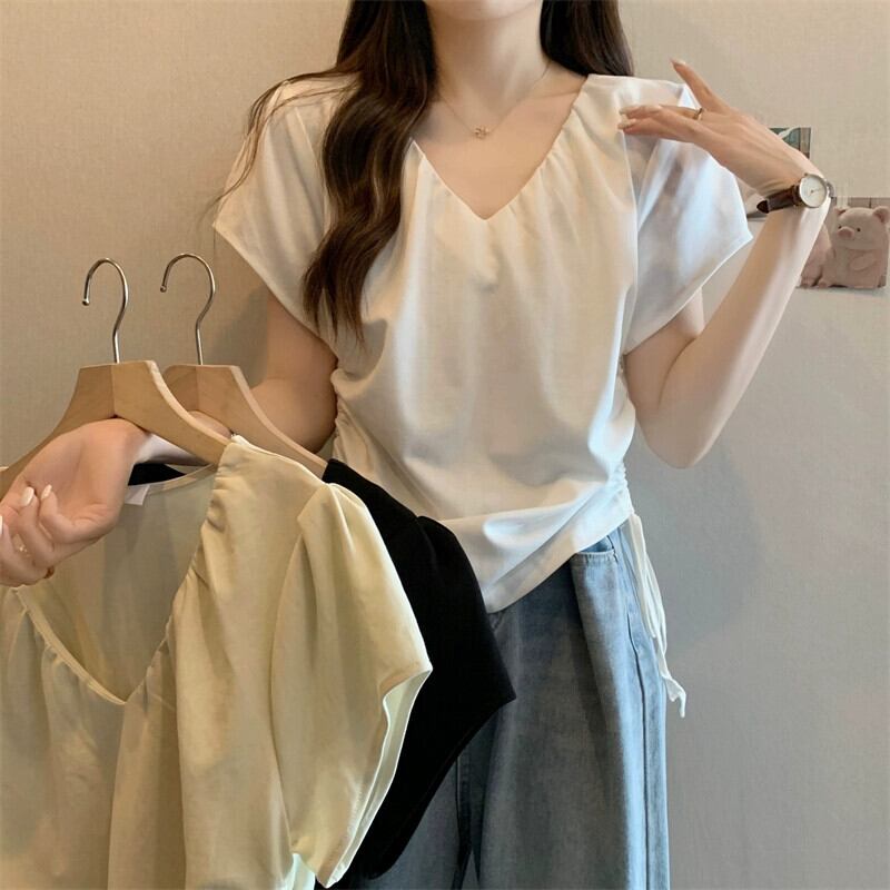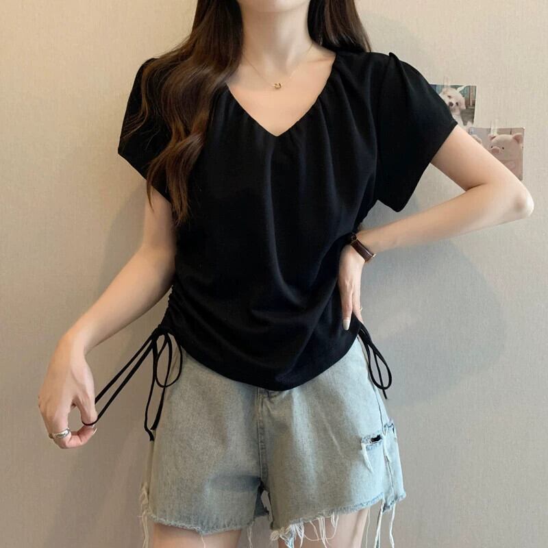 プラスサイズの婦人服 2023 ファットシスター夏の新デザイン V ネック巾着プリーツ痩身右肩半袖 Tシャツトップ 大きめサイズ サマー 夏物 Vネック 8884191604924293