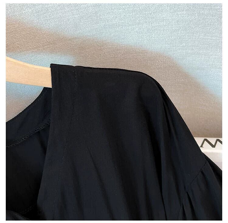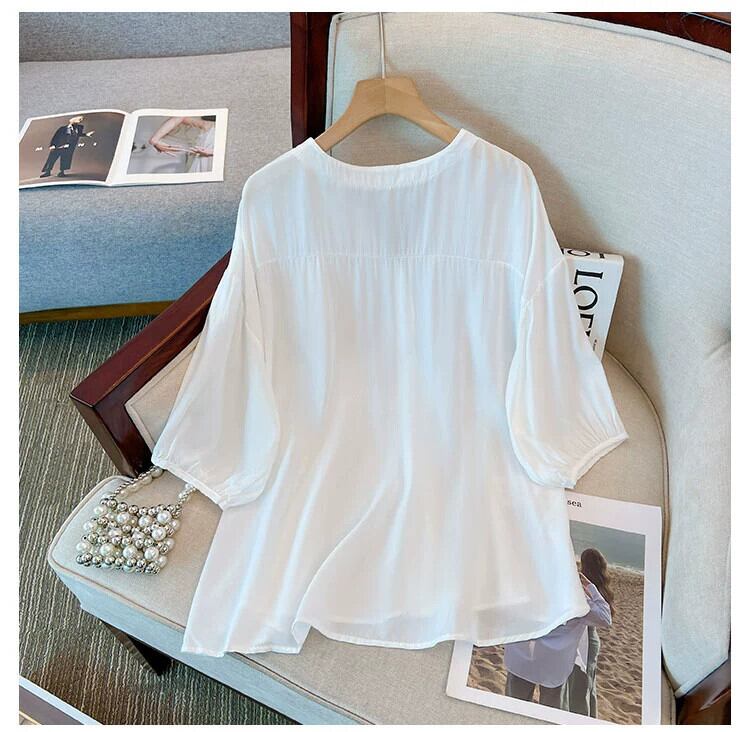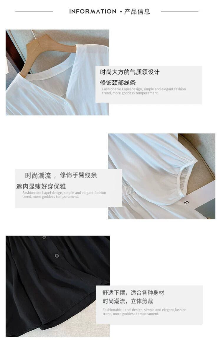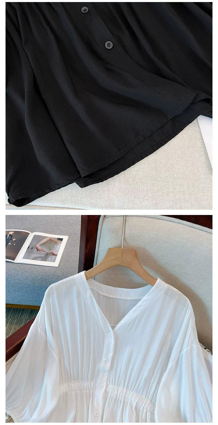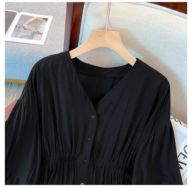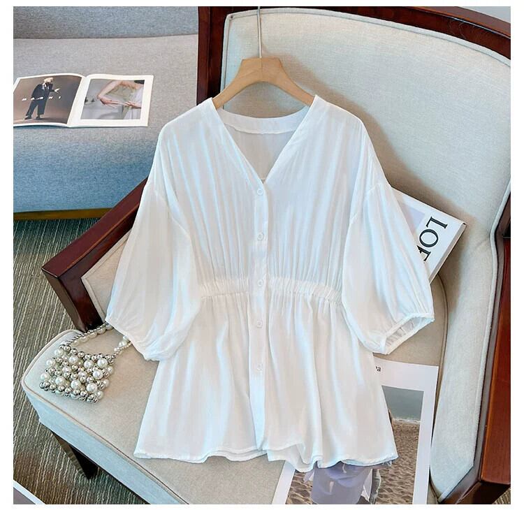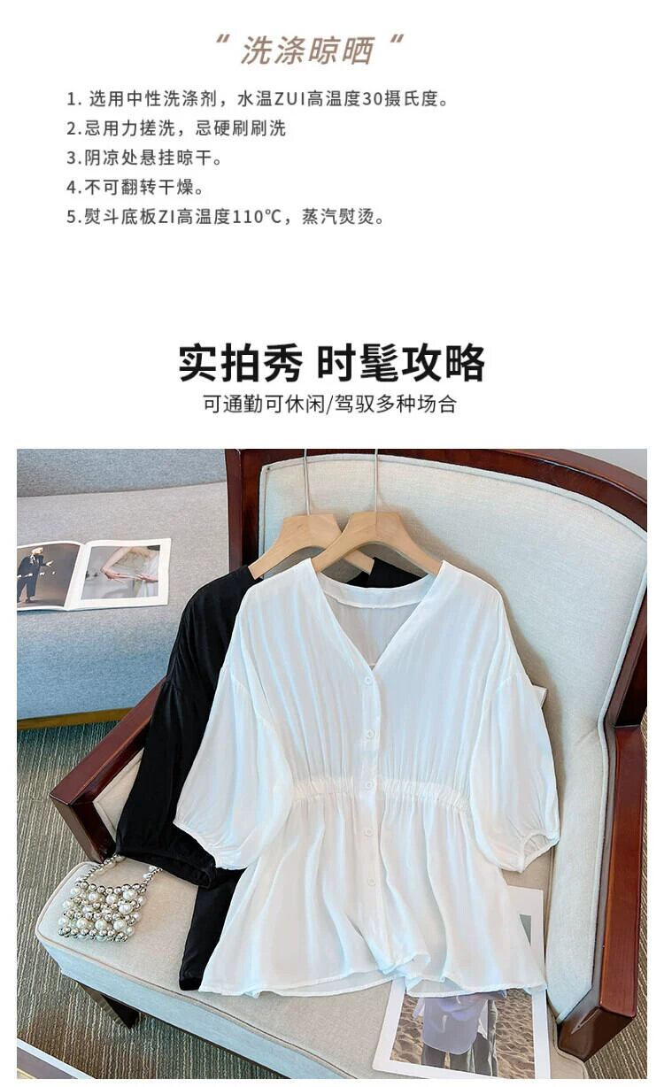 プラスサイズの女性の 2023 夏服脂肪少女ルーズなカバー肉と年齢削減と痩身シャツ弾性ウエストフレンチ無地トップス エラスティック 伸縮 大きめサイズ サマー 夏物 ソリッドカラー 8884156513994040