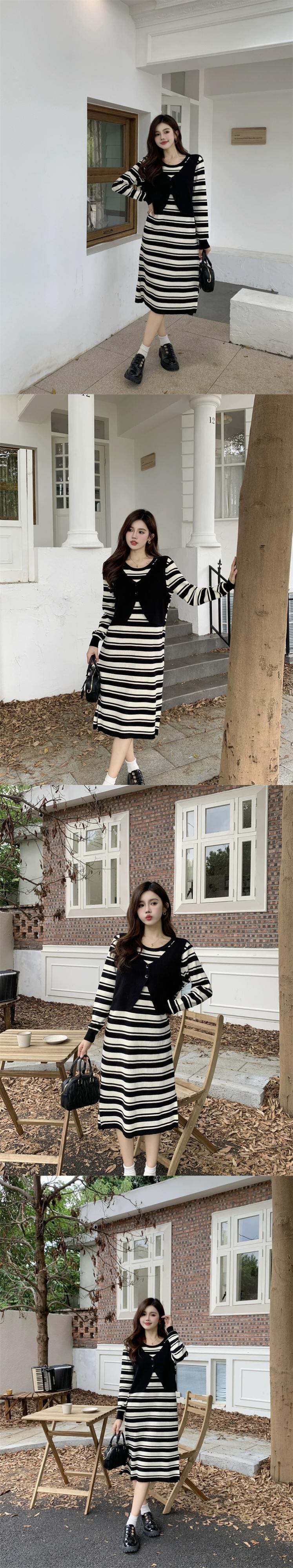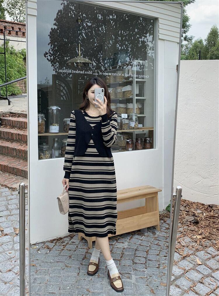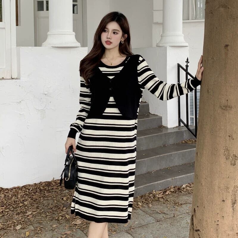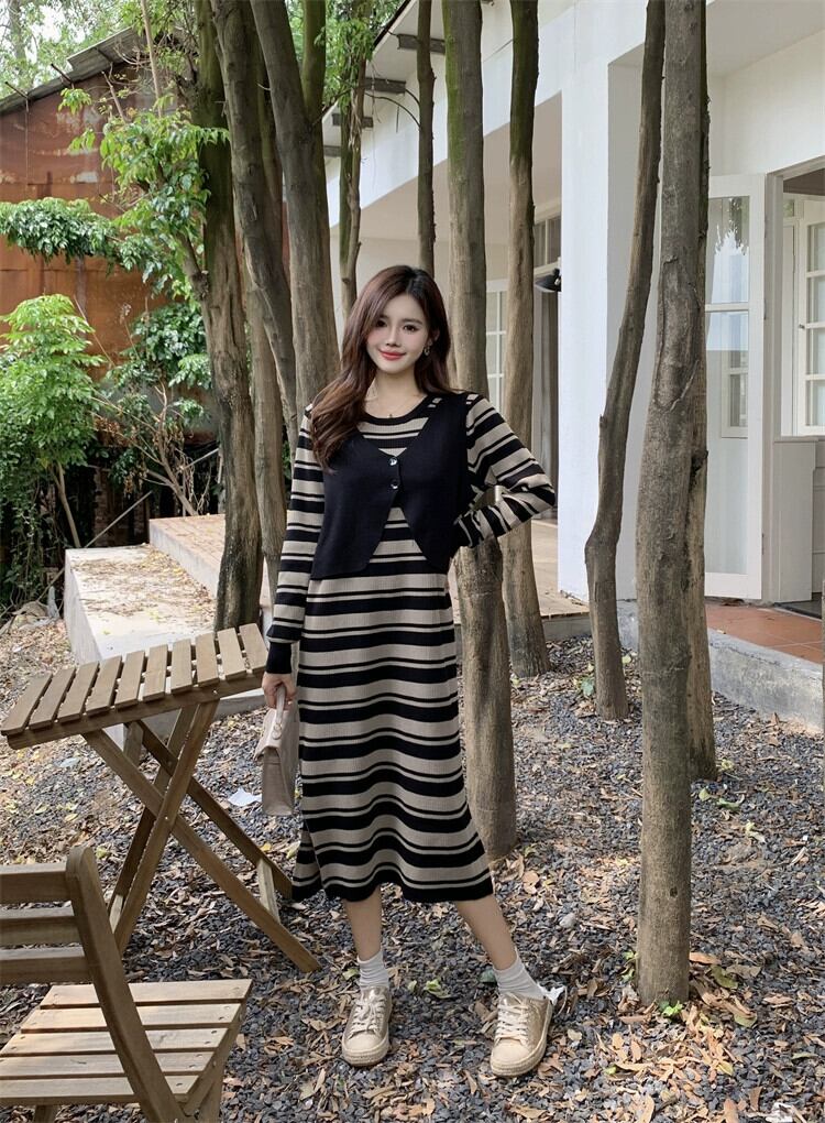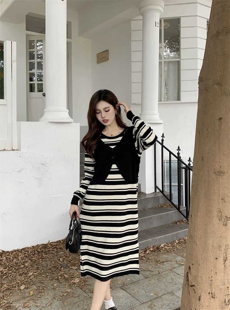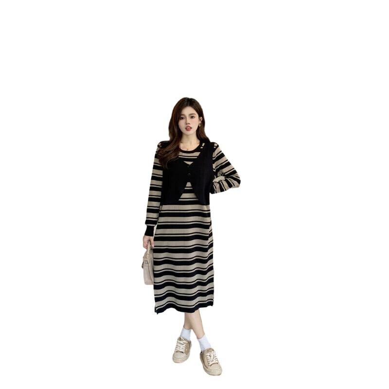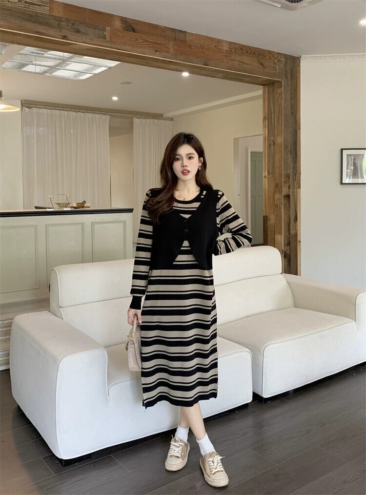 プラスサイズの婦人服 2023 トレンディな秋の新脂肪姉妹ルーズミッドレングススカート偽ツーピースベストニットドレス 大きめサイズ オータム 秋物 888419266573513