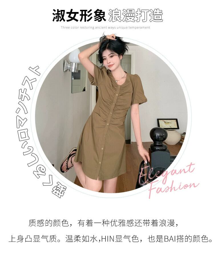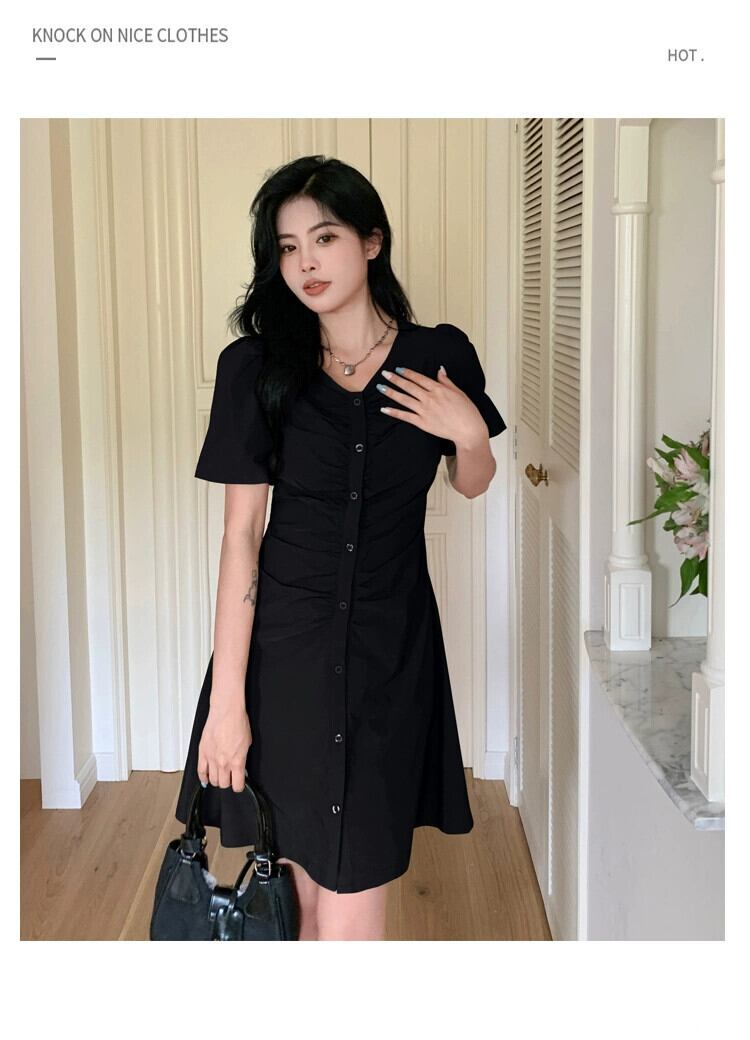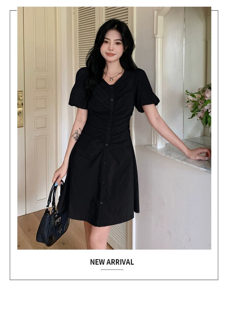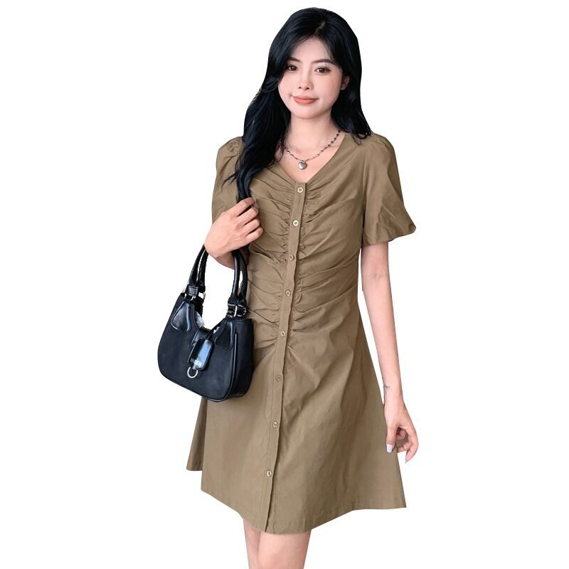 プラスサイズの女性の 2023 夏服ファットニッチデザインフレンチ A ラインスカート V ネックプリーツお腹カバードレス 大きめサイズ サマー 夏物 Vネック Aライン 8884124995555388