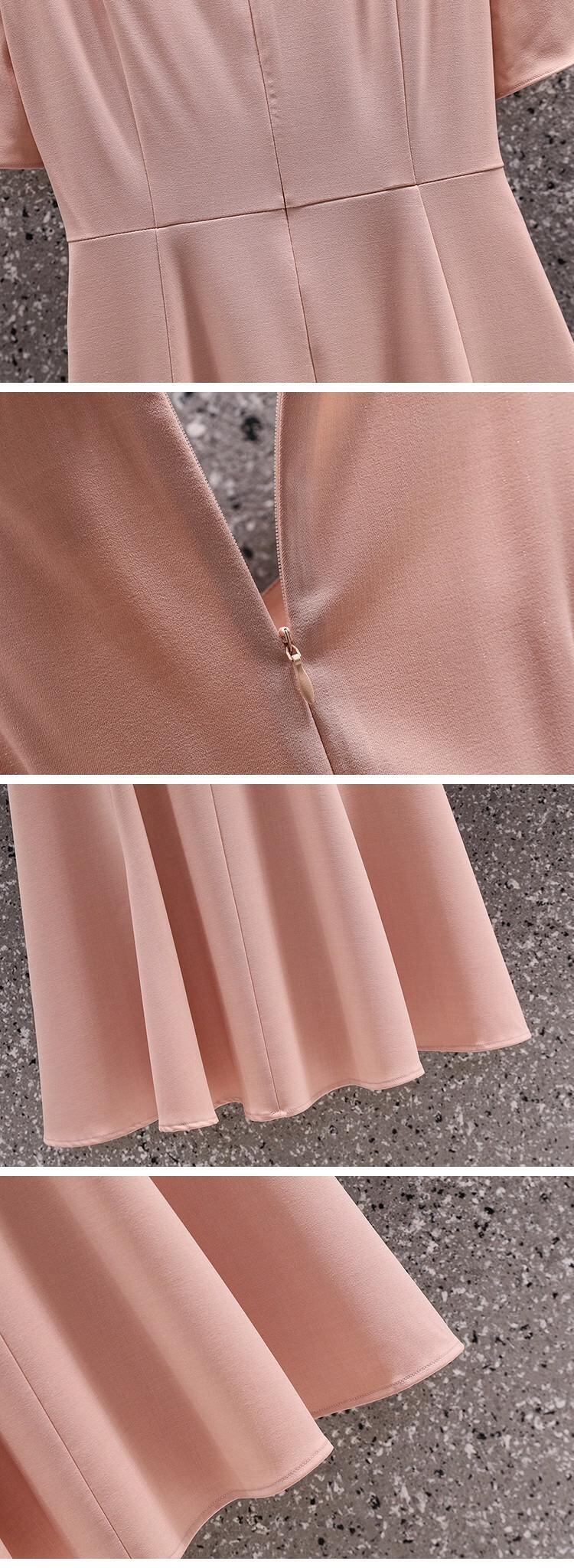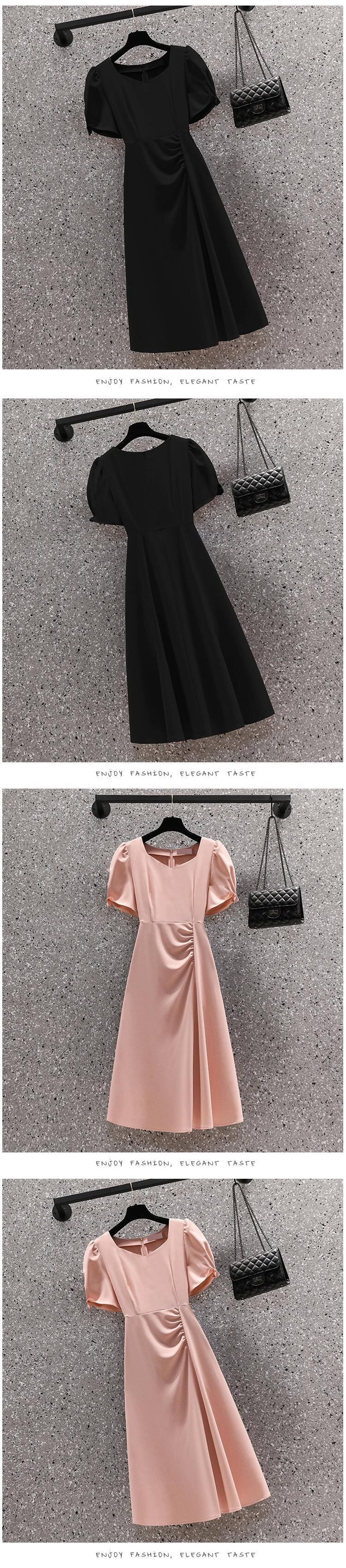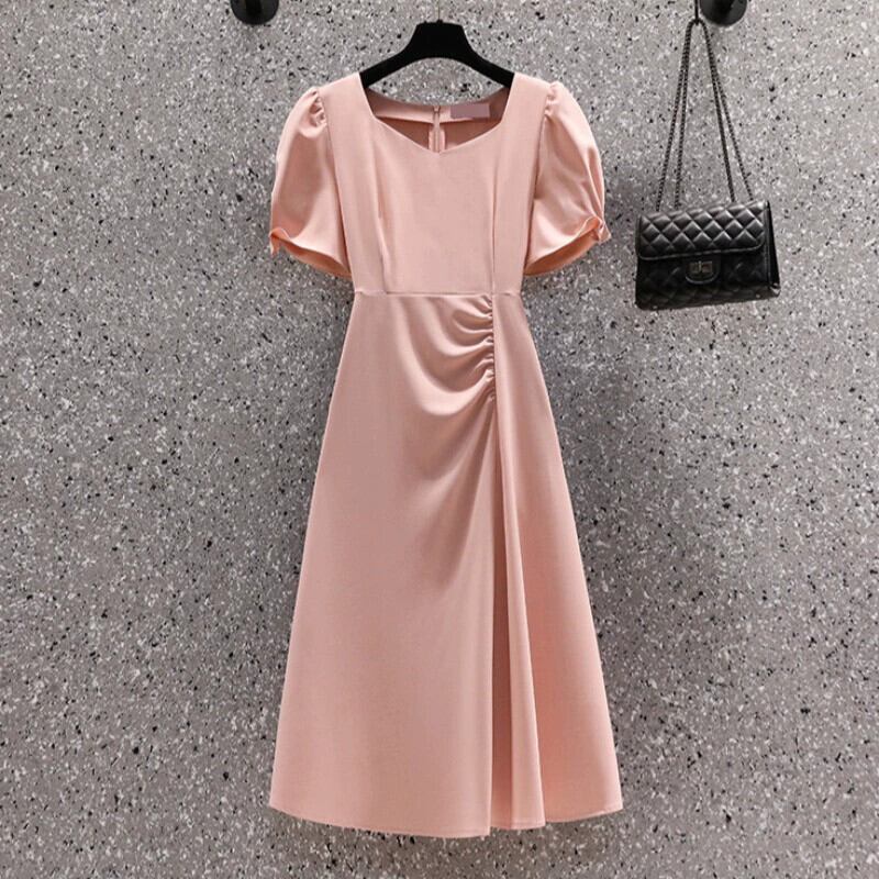 プラスサイズの婦人服 2023 夏の新しいファットシスタースクエアカラー気質無地半袖デザインセンスプリーツドレス 大きめサイズ サマー 夏物 ソリッドカラー スクウェア 8884139533004824