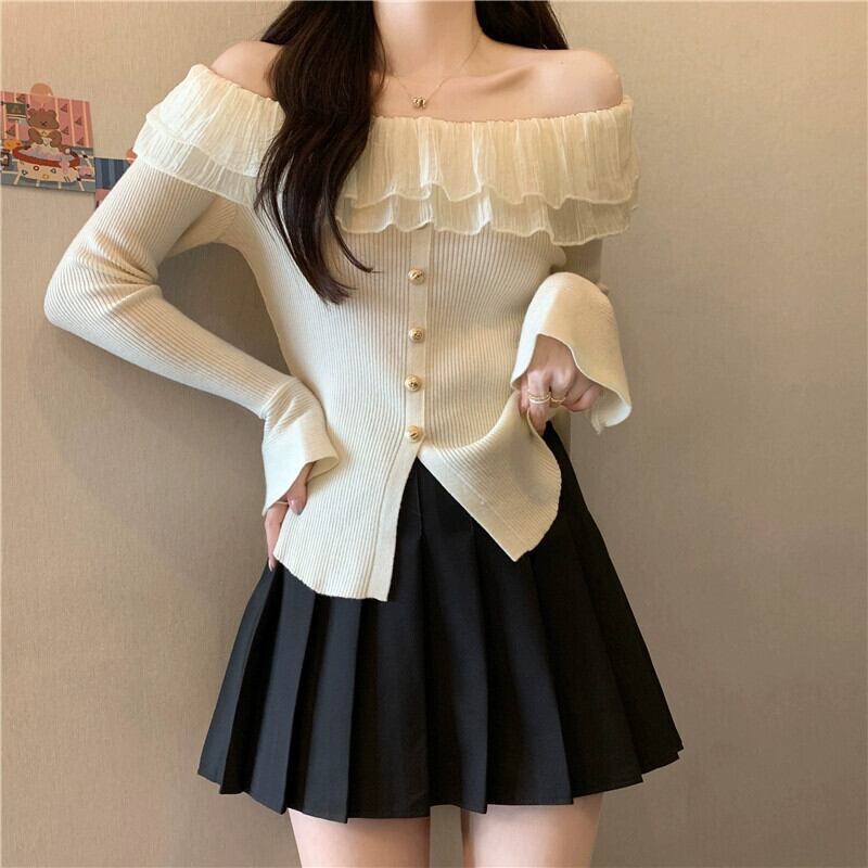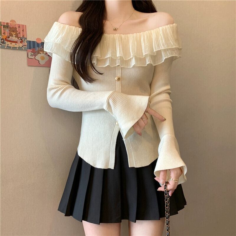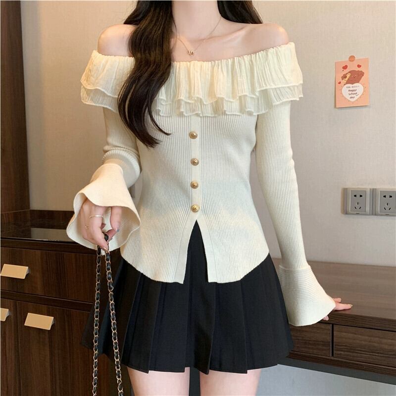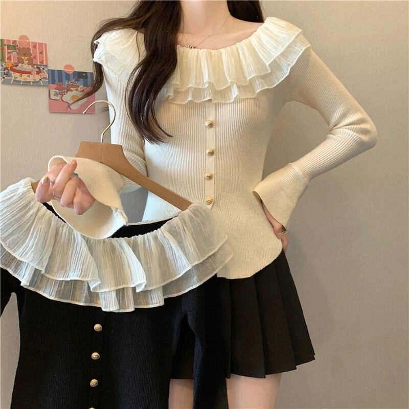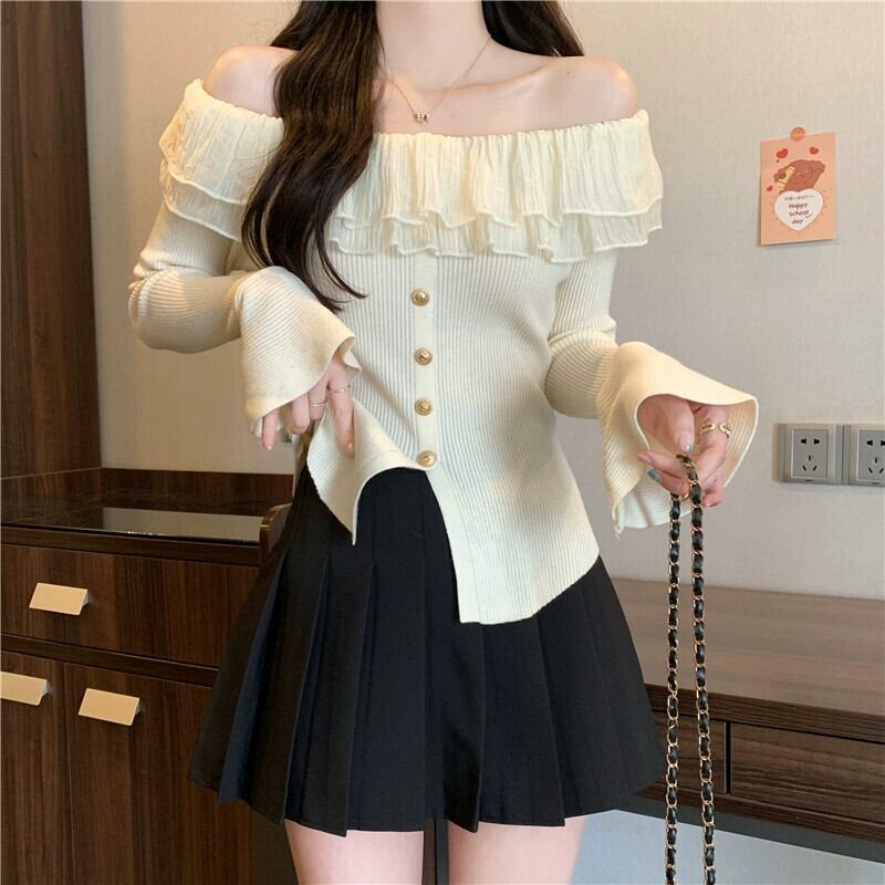 プラスサイズの婦人服 2023 ファットシスター秋の新スタイルフレンチニッチフリルニットボトムシャツワンショルダートップ 大きめサイズ オータム 秋物 8884112158626037