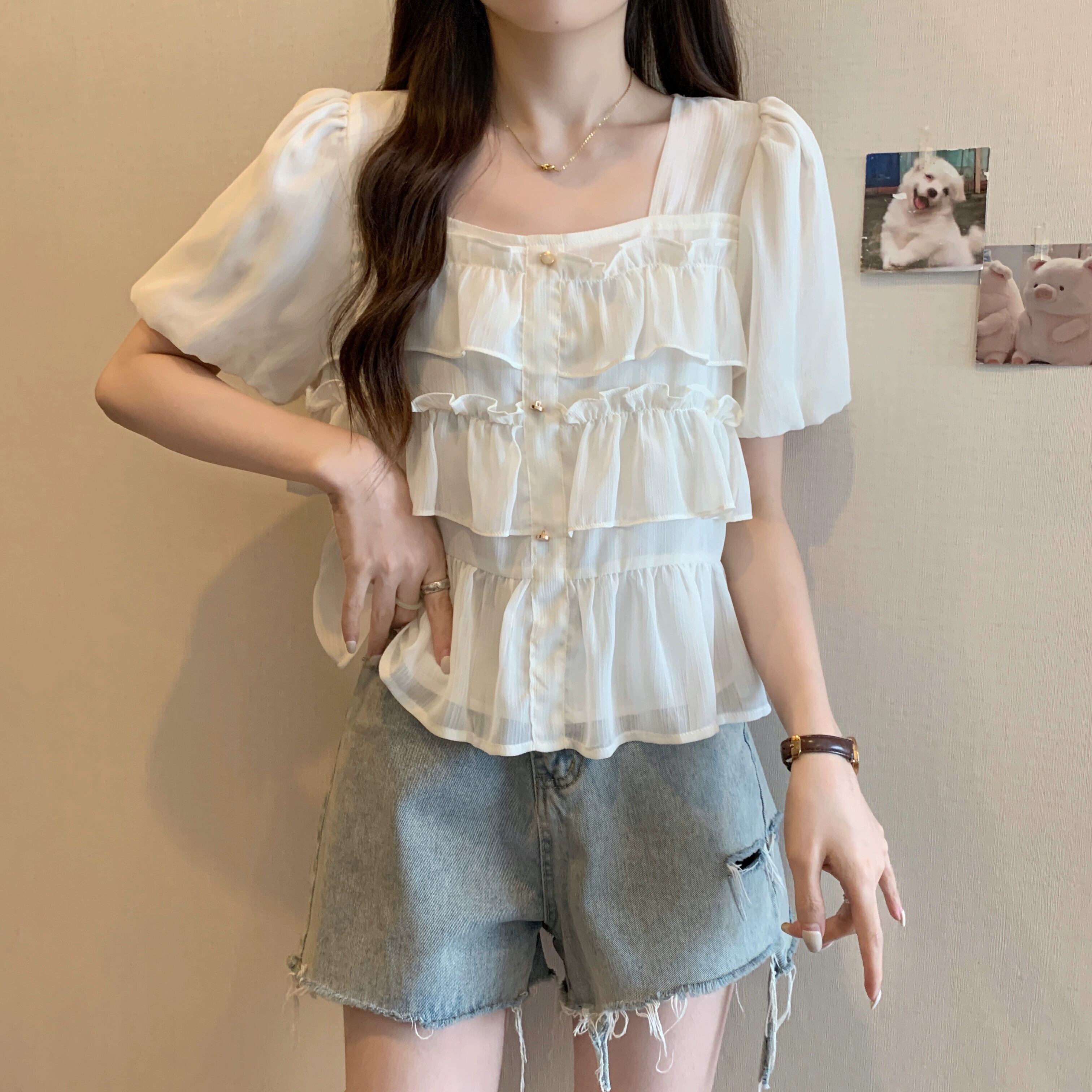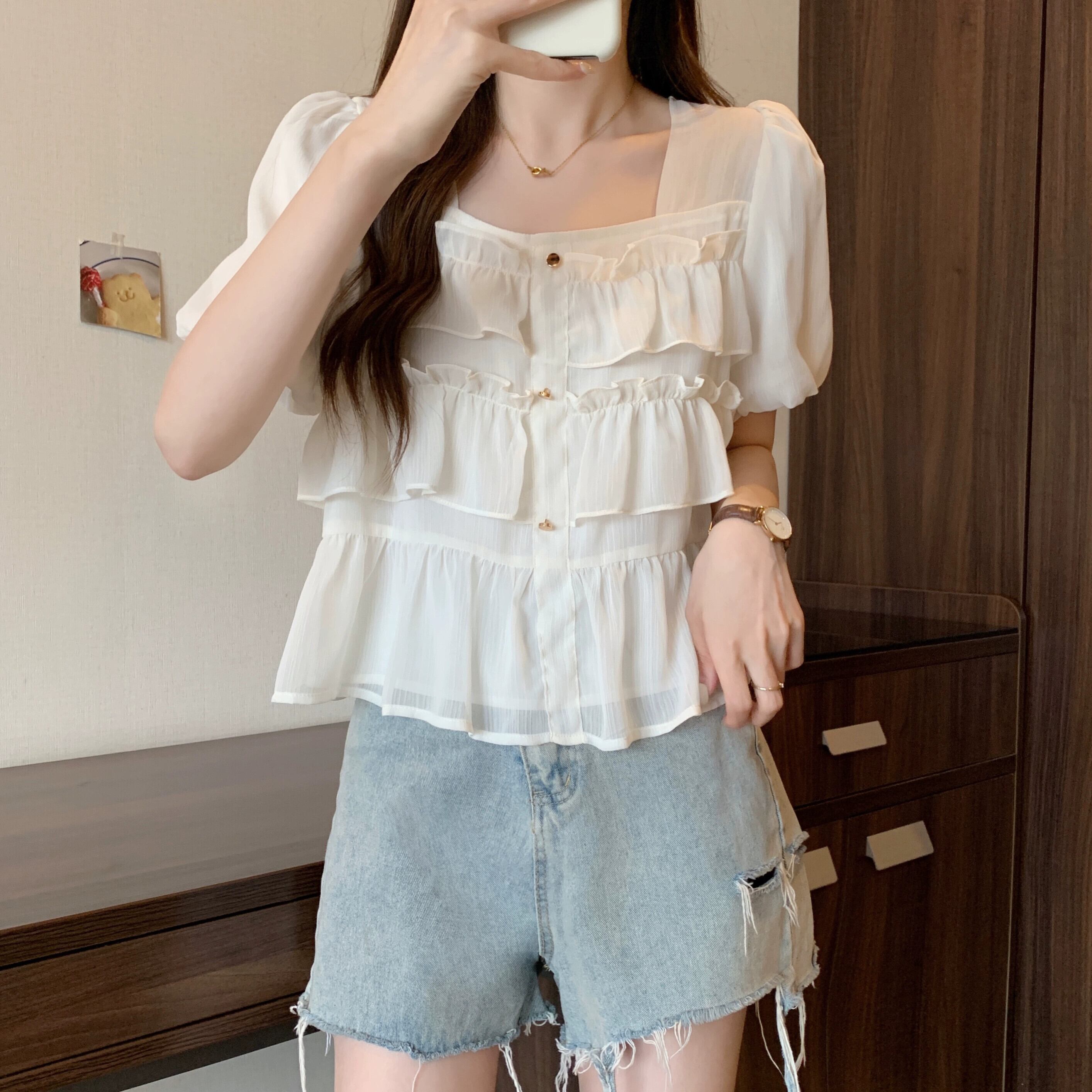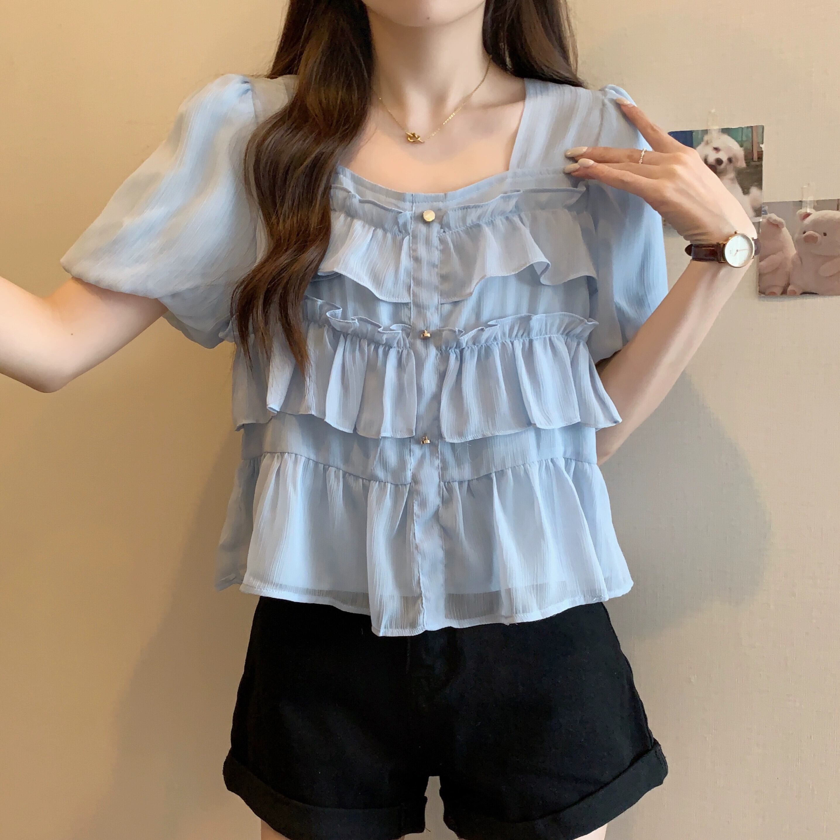 プラスサイズの女性の 2023 ファットシスター夏服スクエアネックシフォン半袖ニッチシャツレトロトップ ショート ハーフスリーブ 大きめサイズ サマー 夏物 スクウェア 8884179663931034