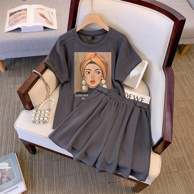 プラスサイズの女性の夏服ファットニッチファッショナブルな多目的 Tシャツハイウエストカジュアルショーツツーピース年齢軽減スーツ ハイウェスト 大きめサイズ サマー 夏物 ブルマー 8884131212197438