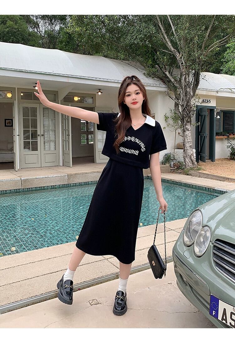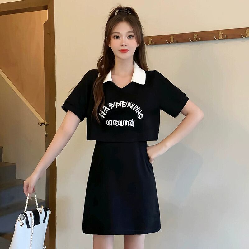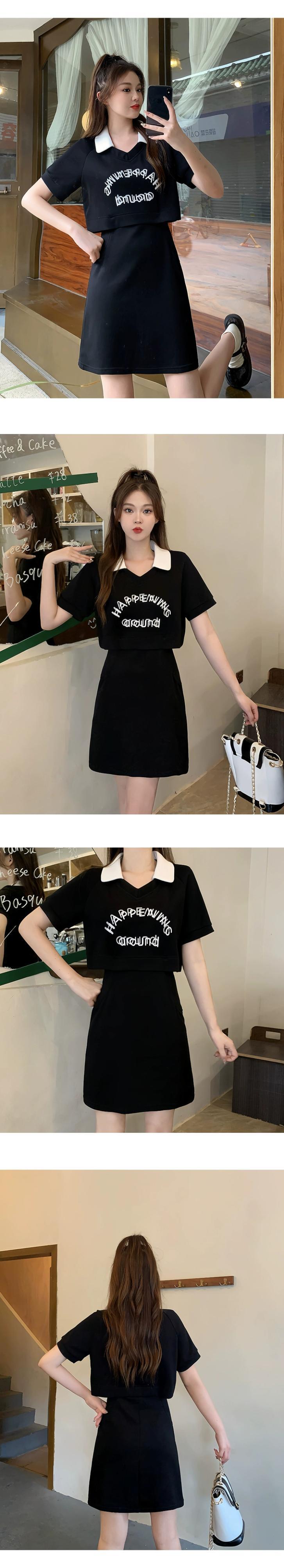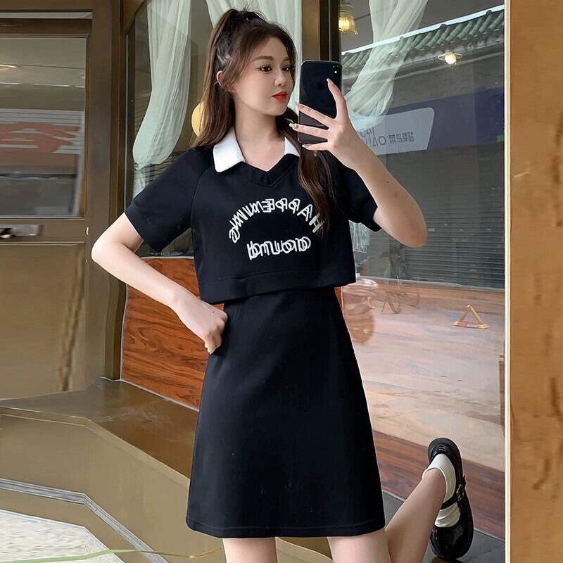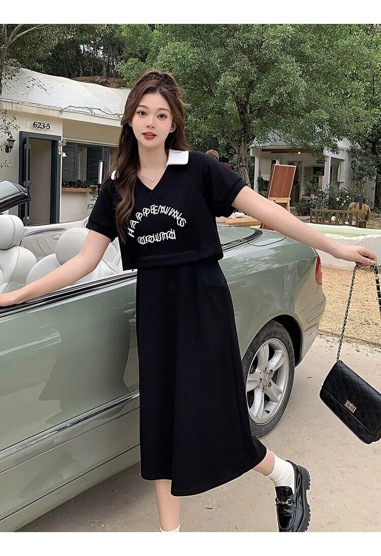 プラスサイズの婦人服 2023 脂肪姉妹夏の新しいカジュアルスリム半袖レタープリントロングとショート偽ツーピースドレス 大きめサイズ サマー 夏物 8884147100942932