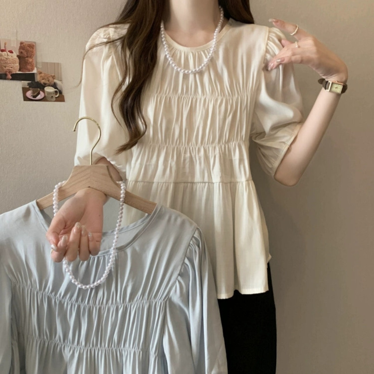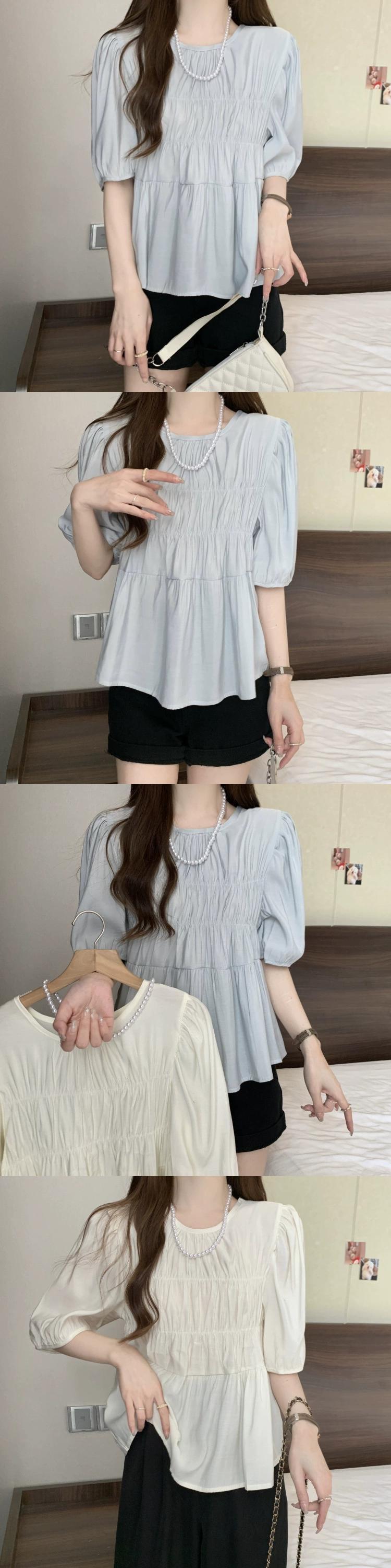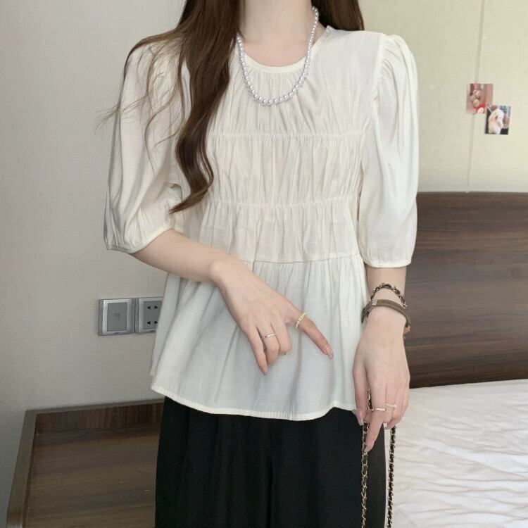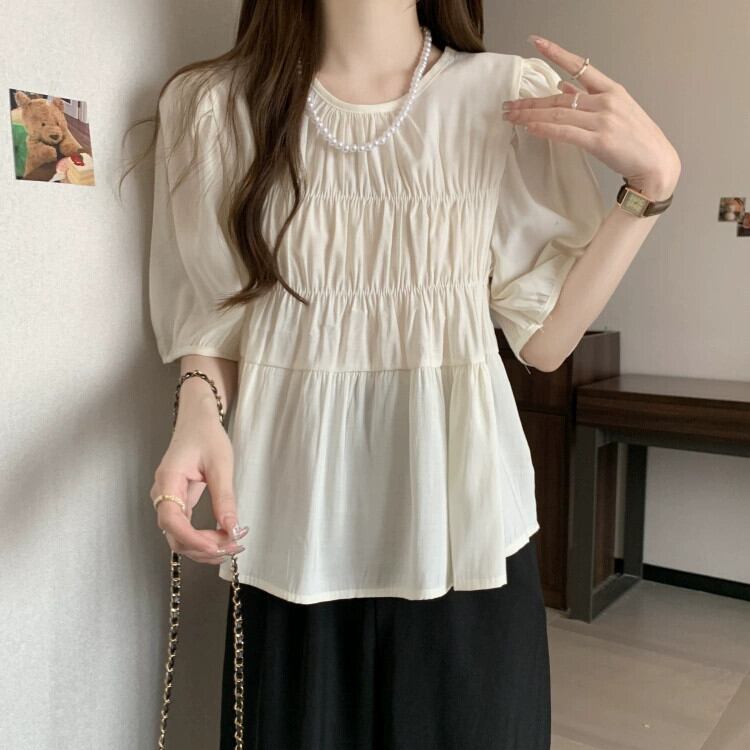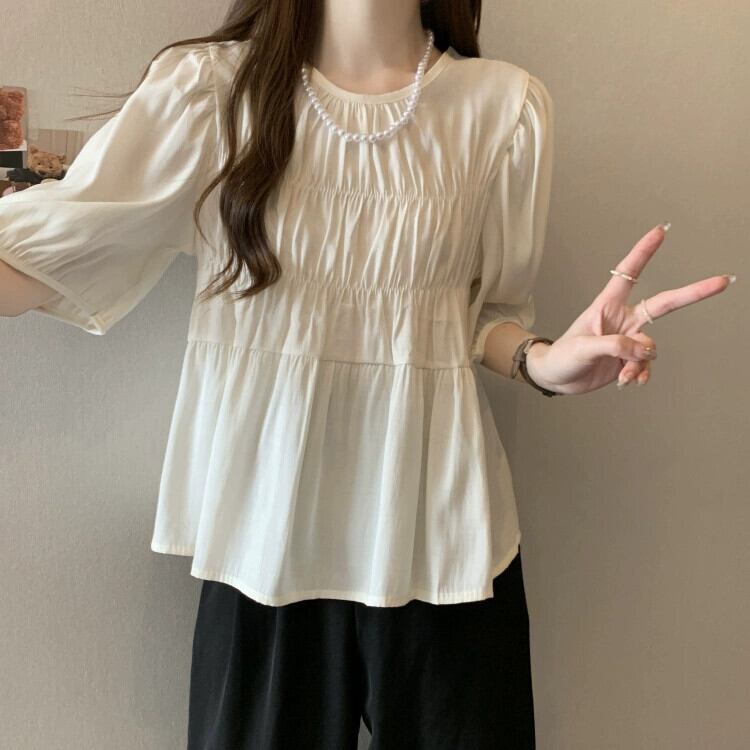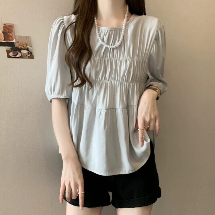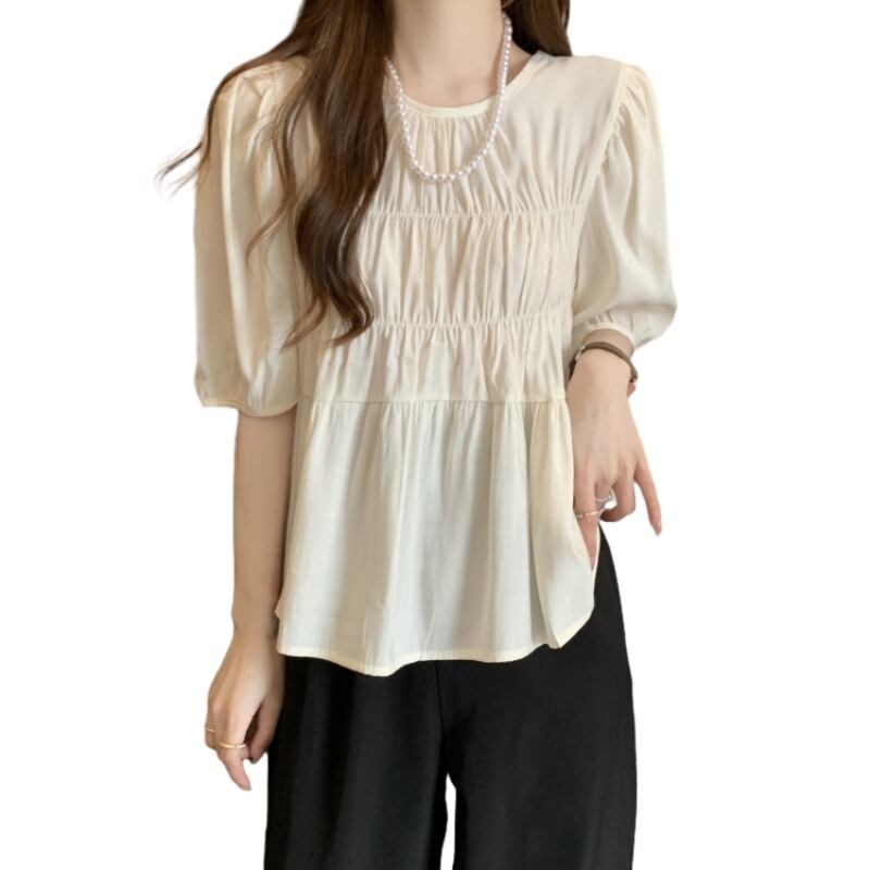 プラスサイズの婦人服 2023 脂肪姉妹夏の新スタイルフレンチジェントルスタイルプリーツラウンドネック半袖ベビードールシャツトップ 大きめサイズ サマー 夏物 Oネック 8884196831986612