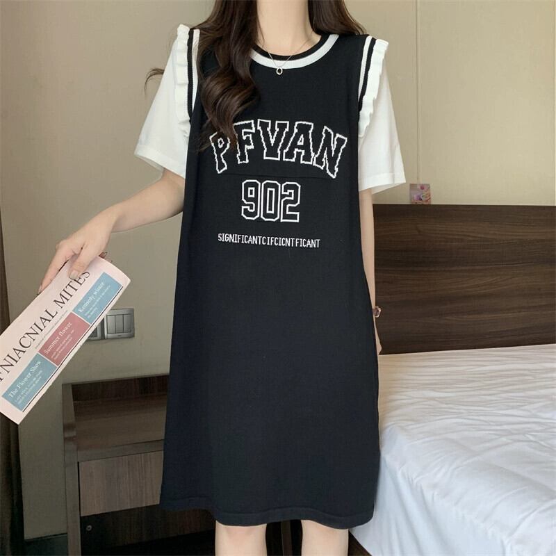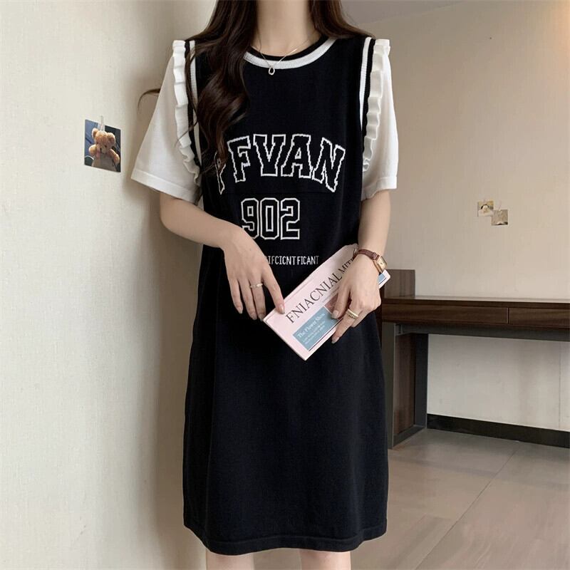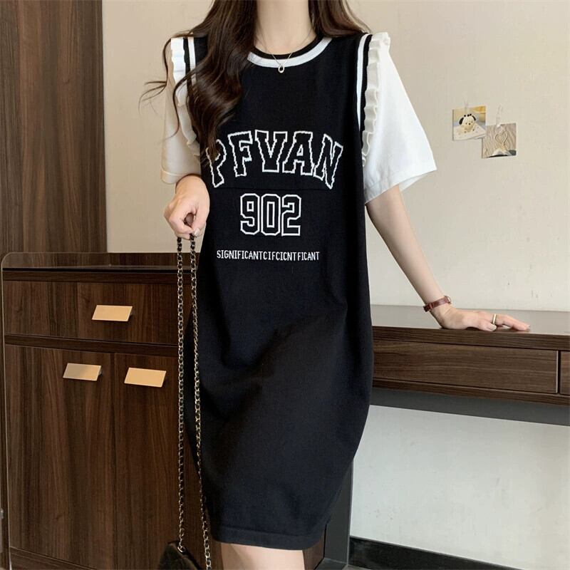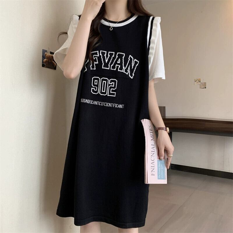 プラスサイズの女性の 2023 夏服ファットスタイルステッチフェイクツーピース A ラインスカートデザイン腹カバードレス 大きめサイズ サマー 夏物 Aライン 8884117102873360