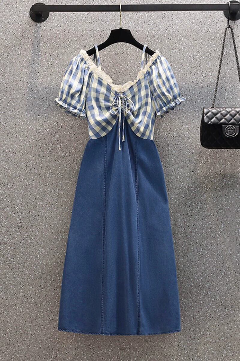 プラスサイズの女性の 2023 夏服脂肪、デザイン、気質、A ラインスカート、フェイクツーピースパフスリーブデニムドレス 大きめサイズ サマー 夏物 Aライン 8884117486819043