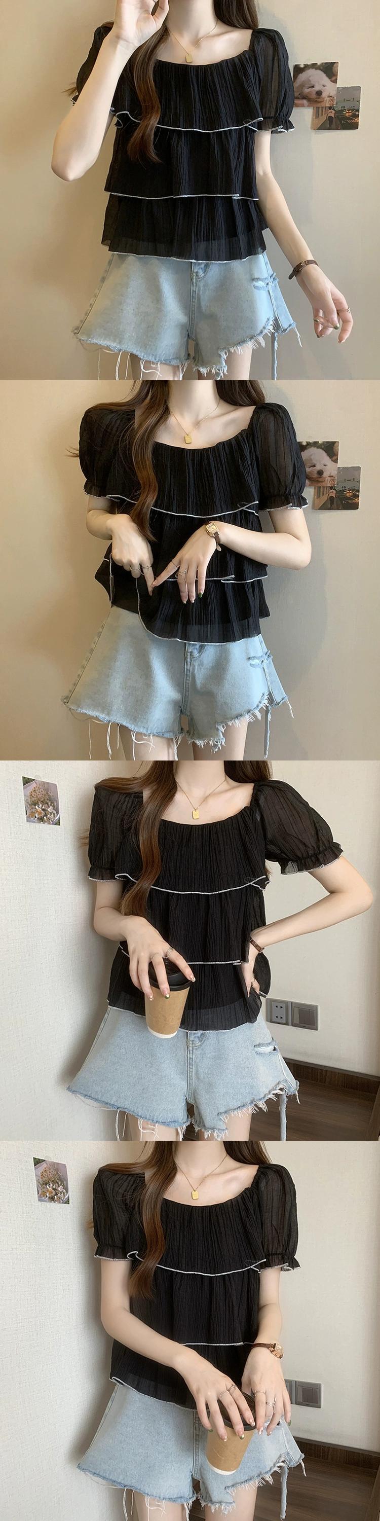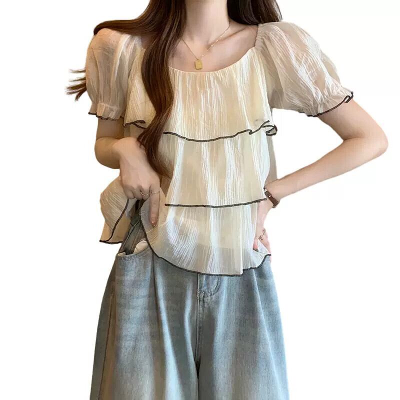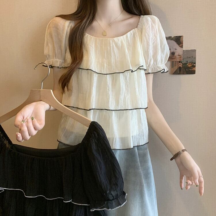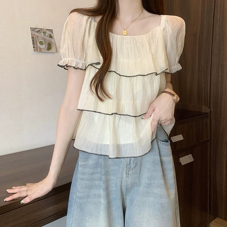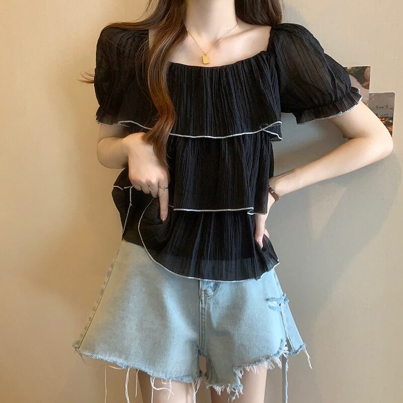 プラスサイズの婦人服 2023 夏服脂肪の新しいファッション痩身スクエアカラーフリルシフォンシャツ 大きめサイズ サマー 夏物 スクウェア 8884119152066137