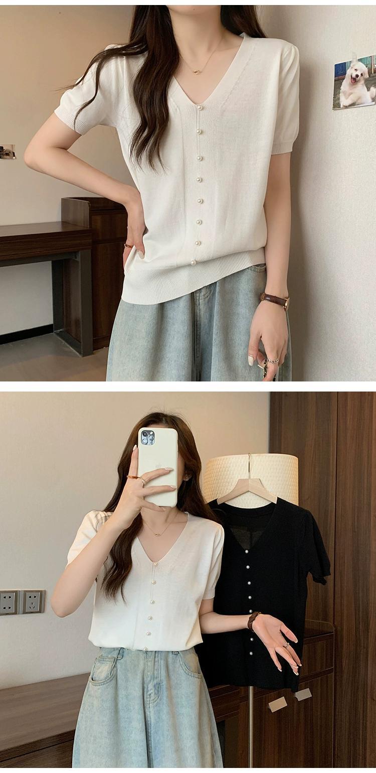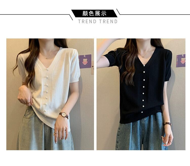 プラスサイズの婦人服 2023 流行の夏の新しいファットシスターファッショナブルな V ネックニット半袖 Tシャツルーズビーズアイスシルクトップ 大きめサイズ サマー 夏物 Vネック 8884124055553056