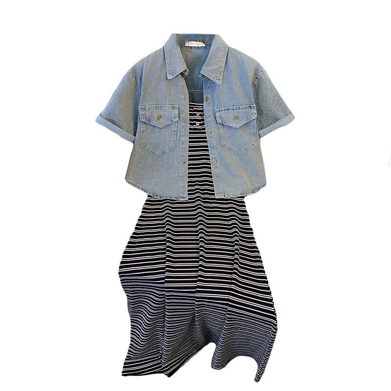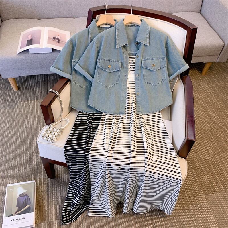 プラスサイズ レディース 2023 夏服 太って見えてお腹もカバー デニム トップス ストライプ フレンチ サスペンダー スカート 2点セット 大きめサイズ サマー 夏物 スリム 8884170942123938