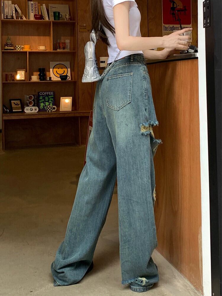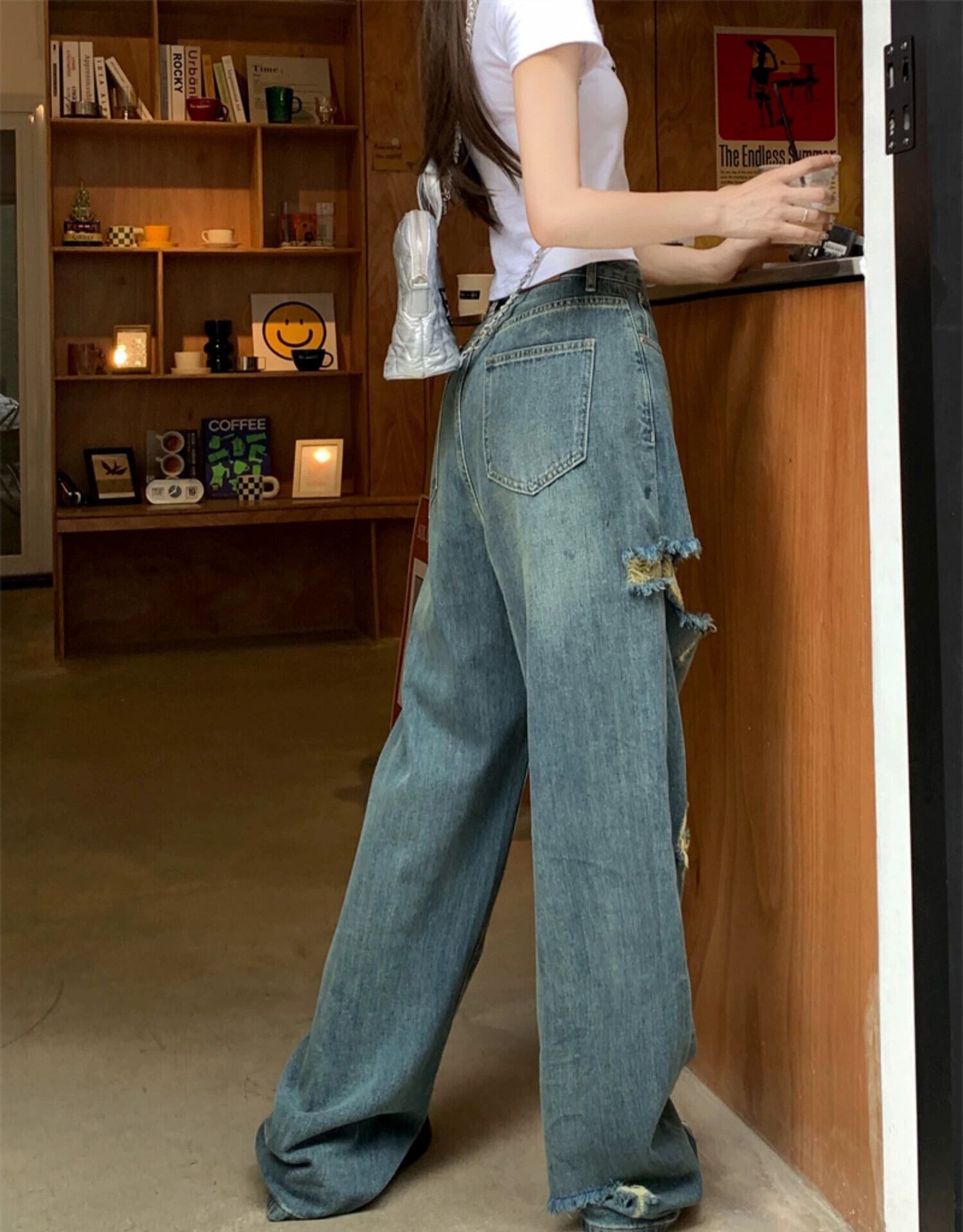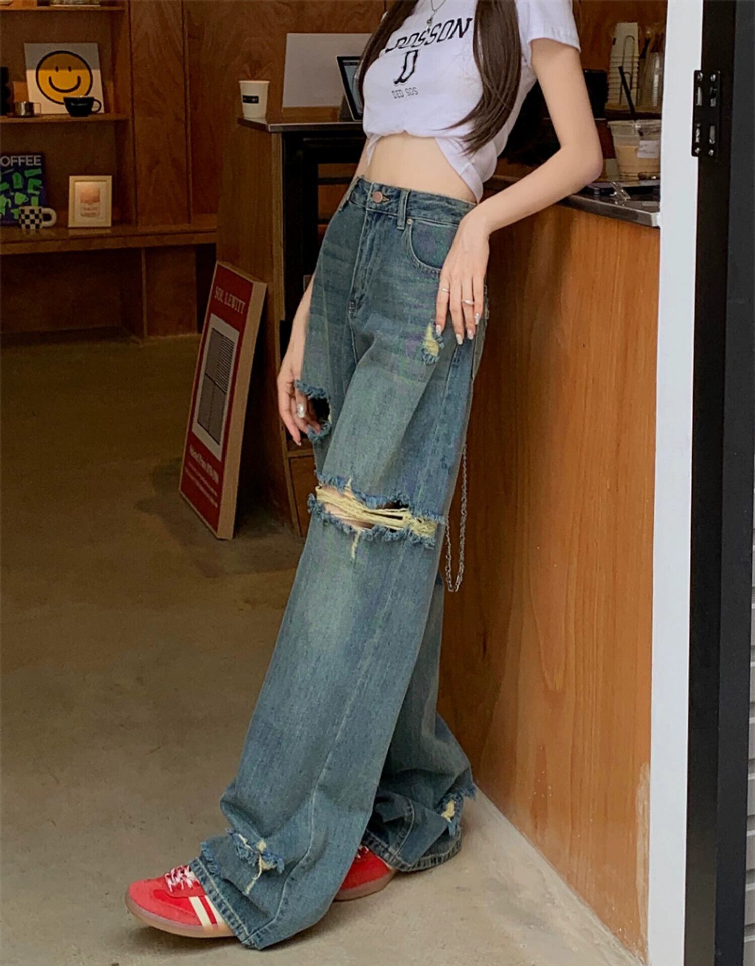 プラスサイズの婦人服 2023 脂肪姉妹夏新スタイルリッピングジーンズレトロストレート痩身ルーズワイドレッグフロアモップパンツ 大きめサイズ サマー 夏物 ワイドパンツ 8884117475739902