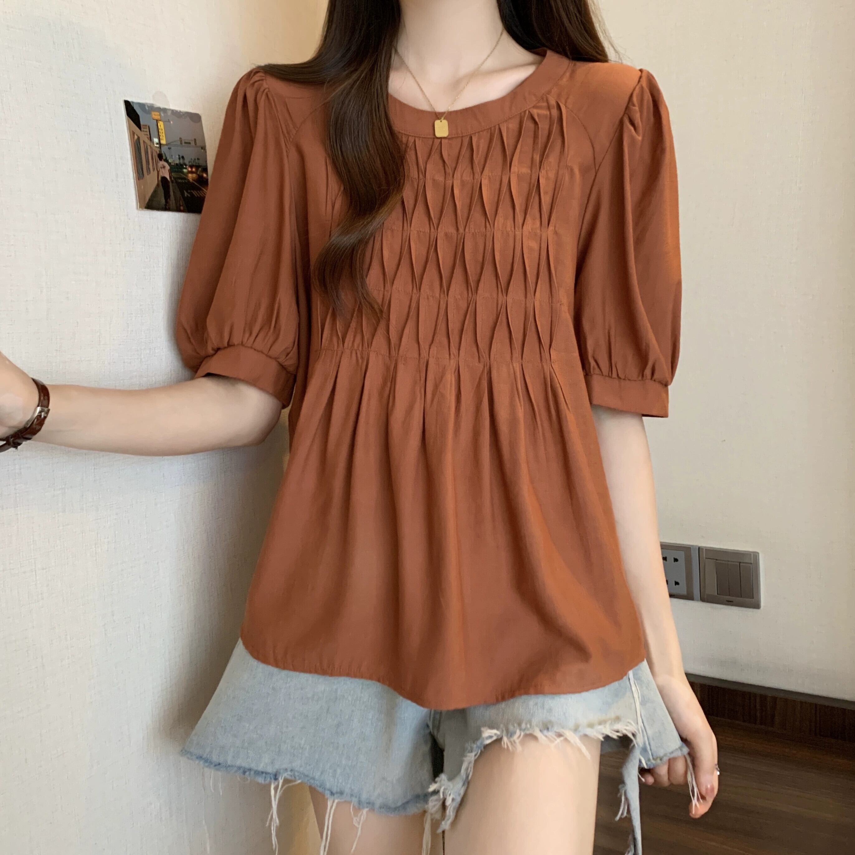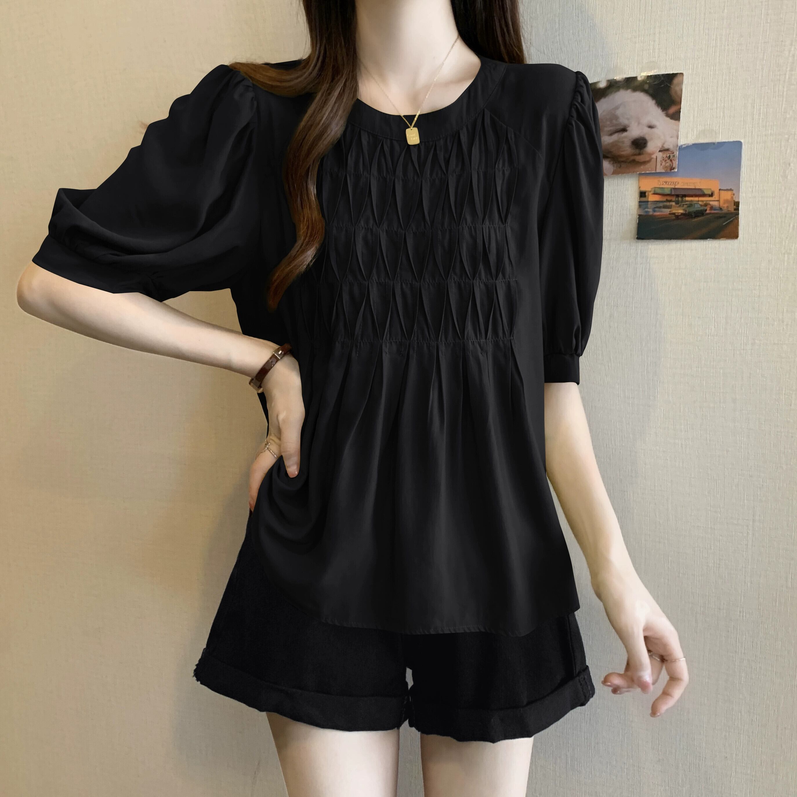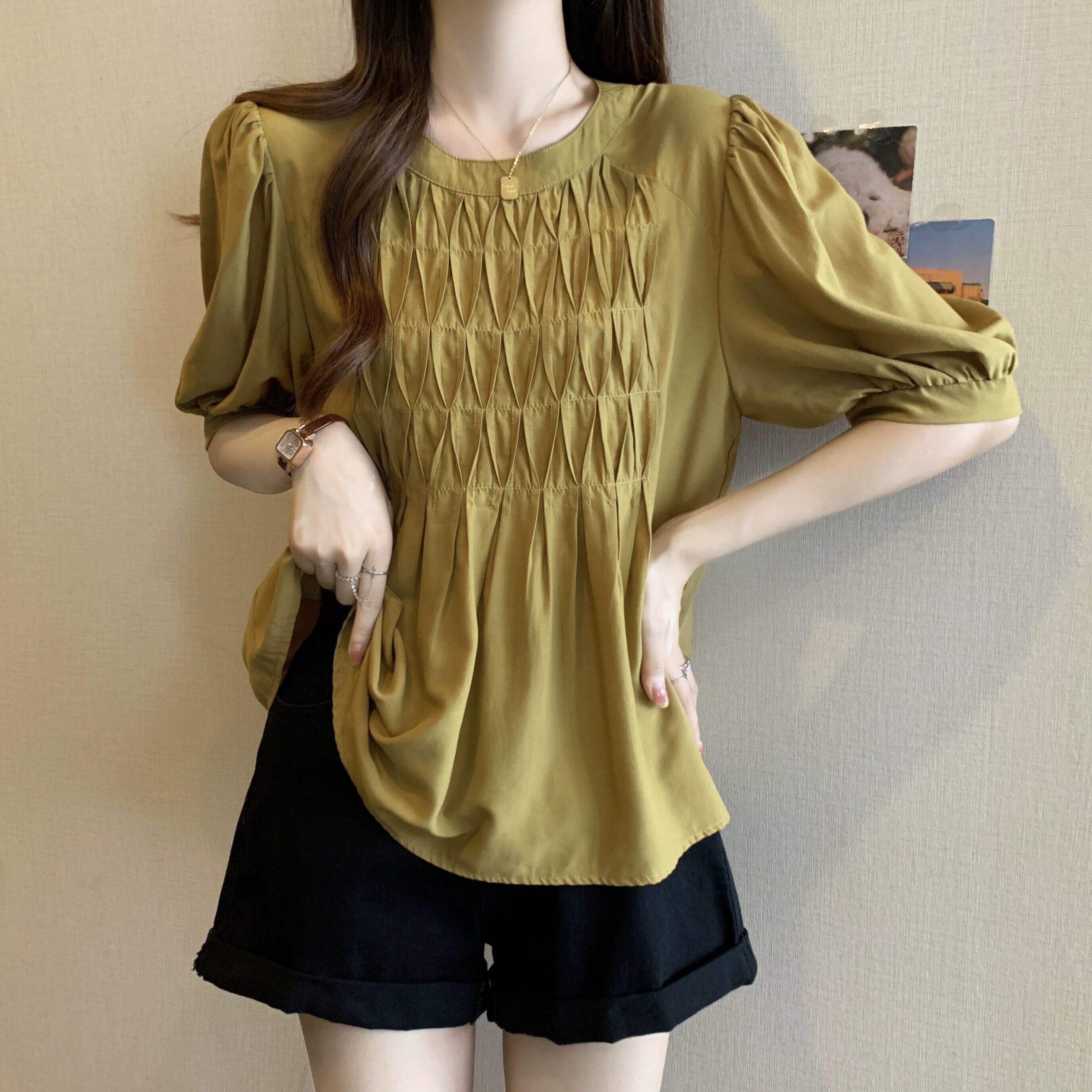 プラスサイズの婦人服 2023 ファットシスター夏服新デザインのフレンチショルダーシャツは肉をカバーし、スリムに見えるニッチトップス 大きめサイズ サマー 夏物 8884152192182705