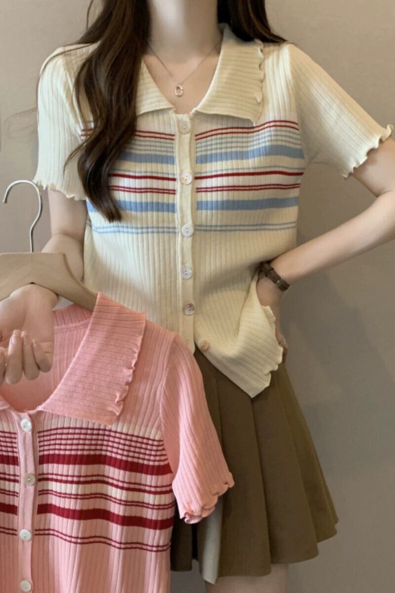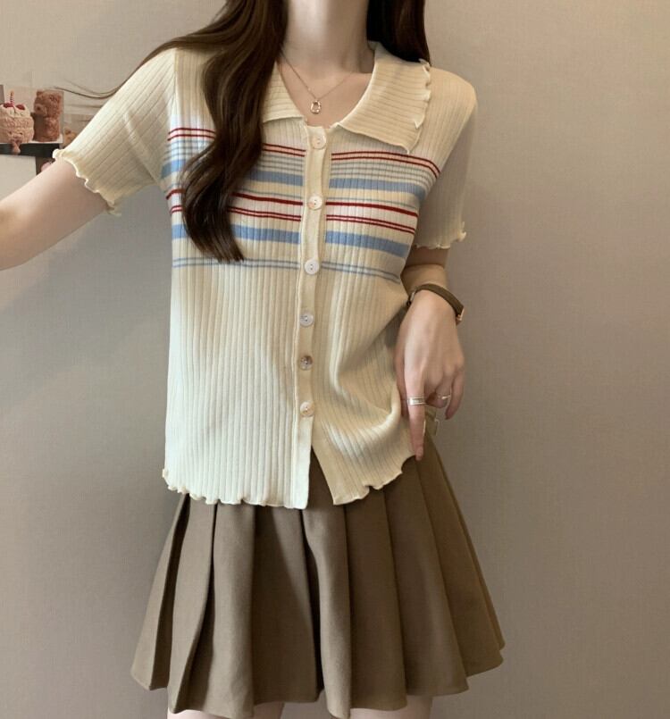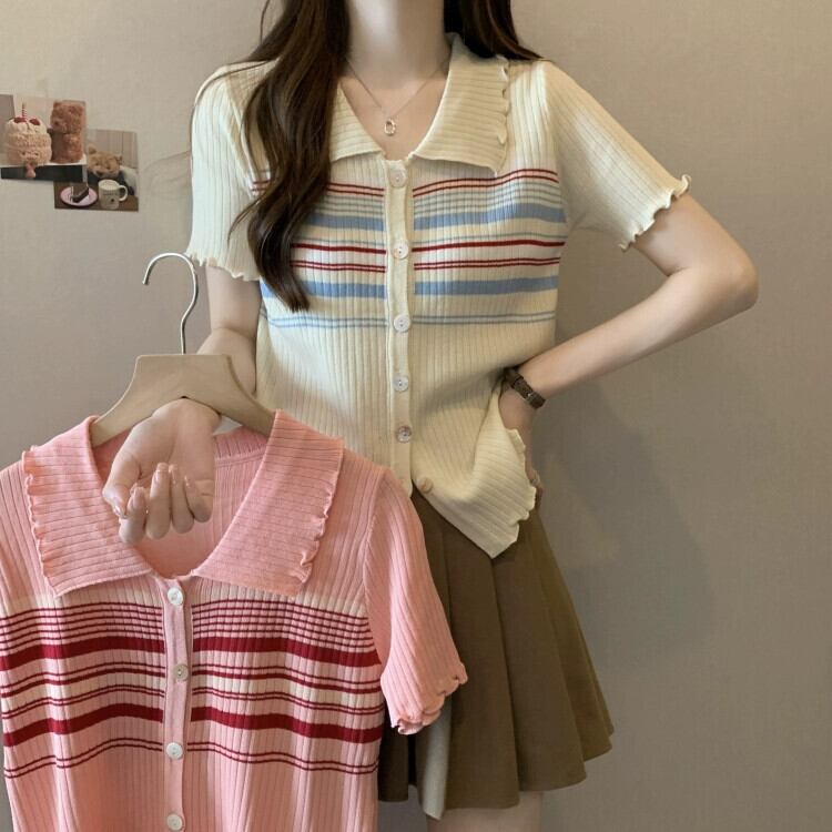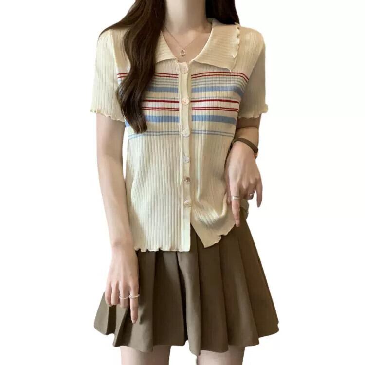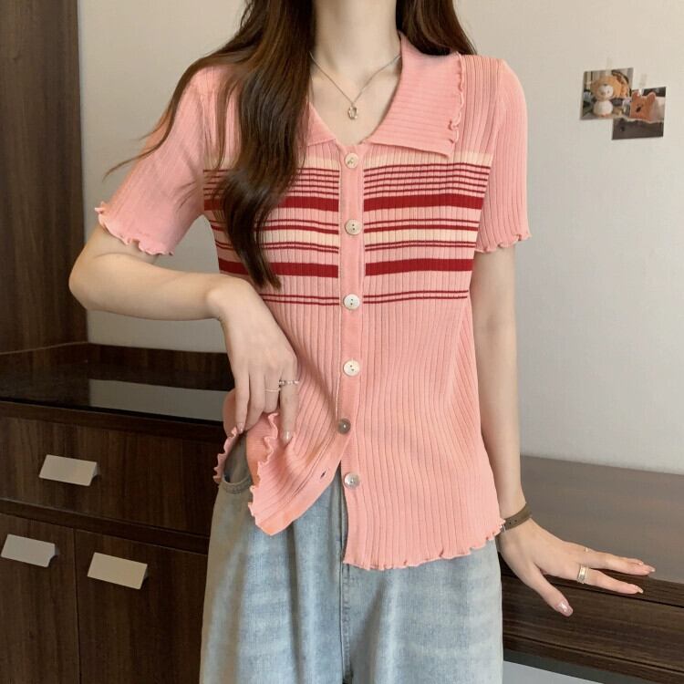 プラスサイズの婦人服 2023 脂肪姉妹夏服新しいニット半袖ストライプ右肩ポロ襟薄いアイスシルクトップ 大きめサイズ サマー 夏物 8884191497220817