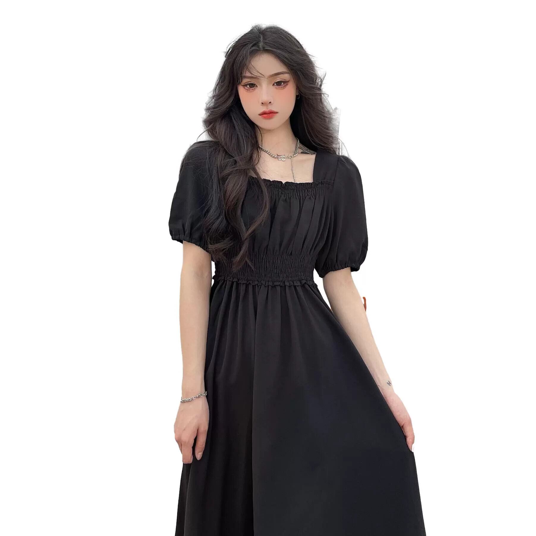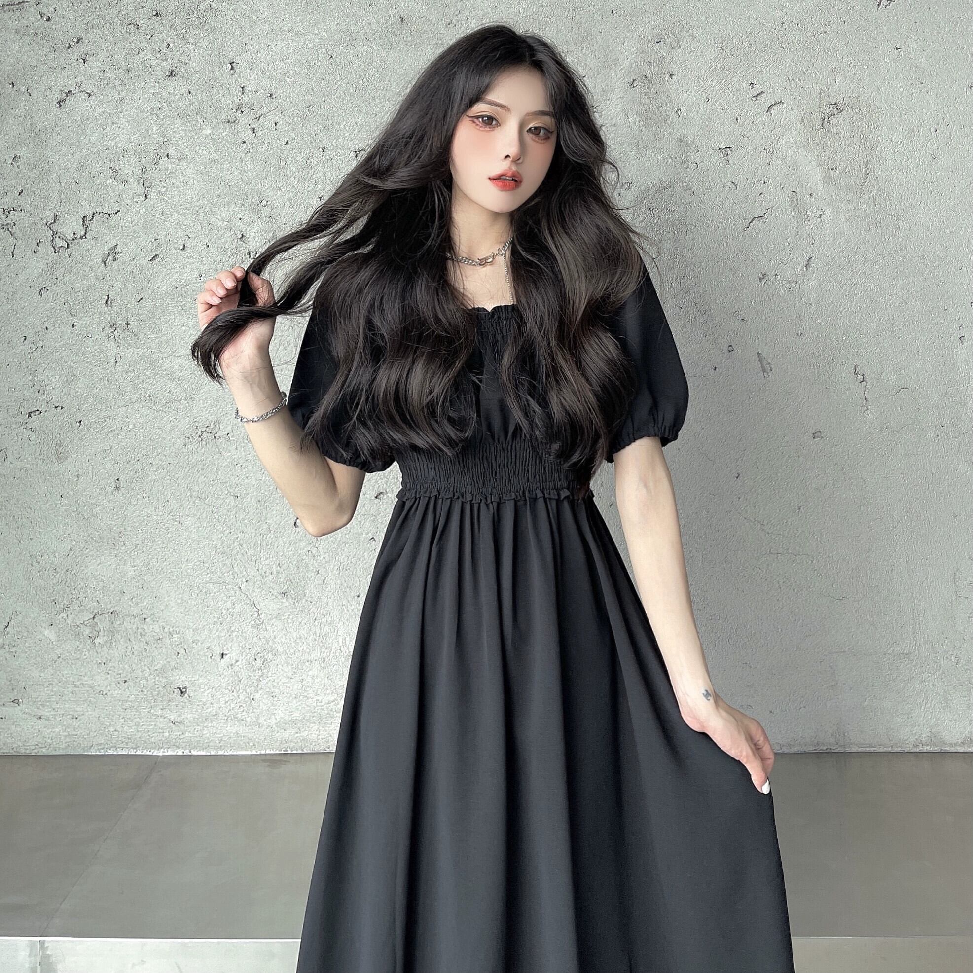 プラスサイズの婦人服 2023 脂肪姉妹夏の新スタイルハイウエストスクエアカラースリムロングスカートレトロ弾性黒ドレス ハイウェスト ブラック エラスティック 伸縮 大きめサイズ サマー 夏物 スクウェア 8884180650545717