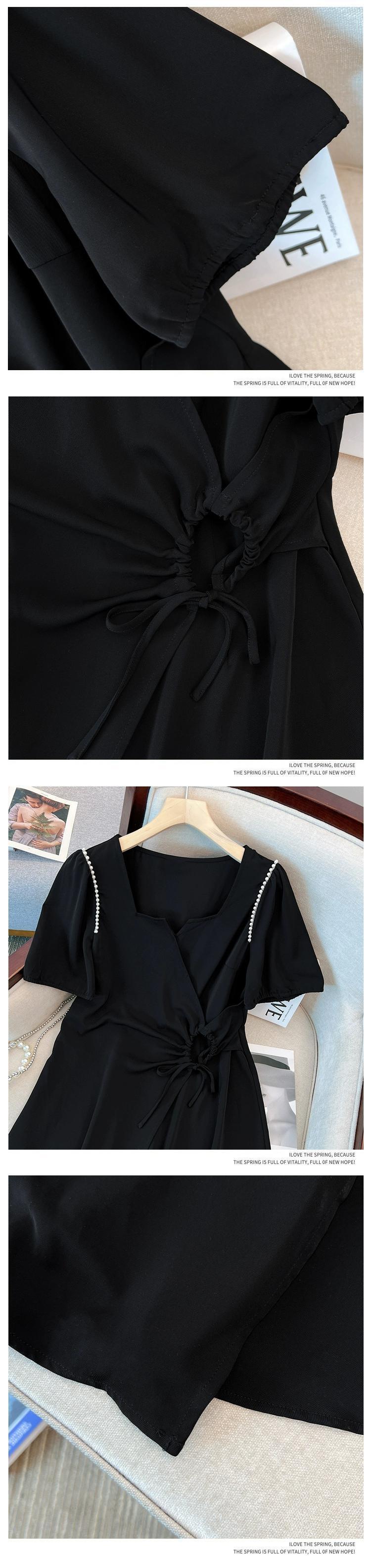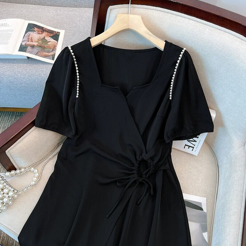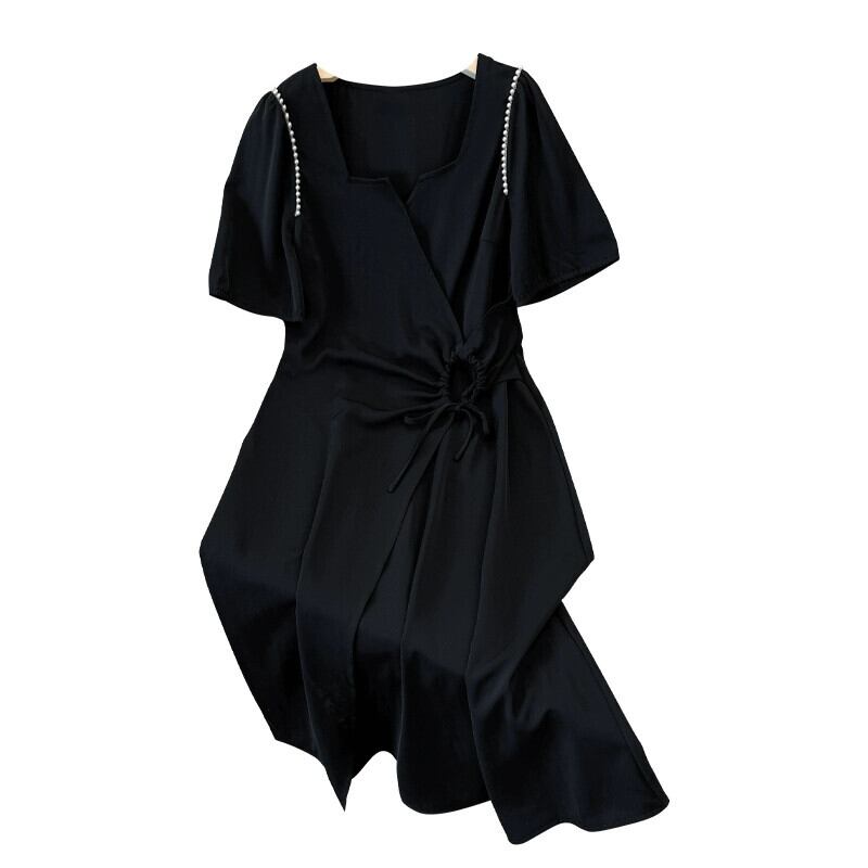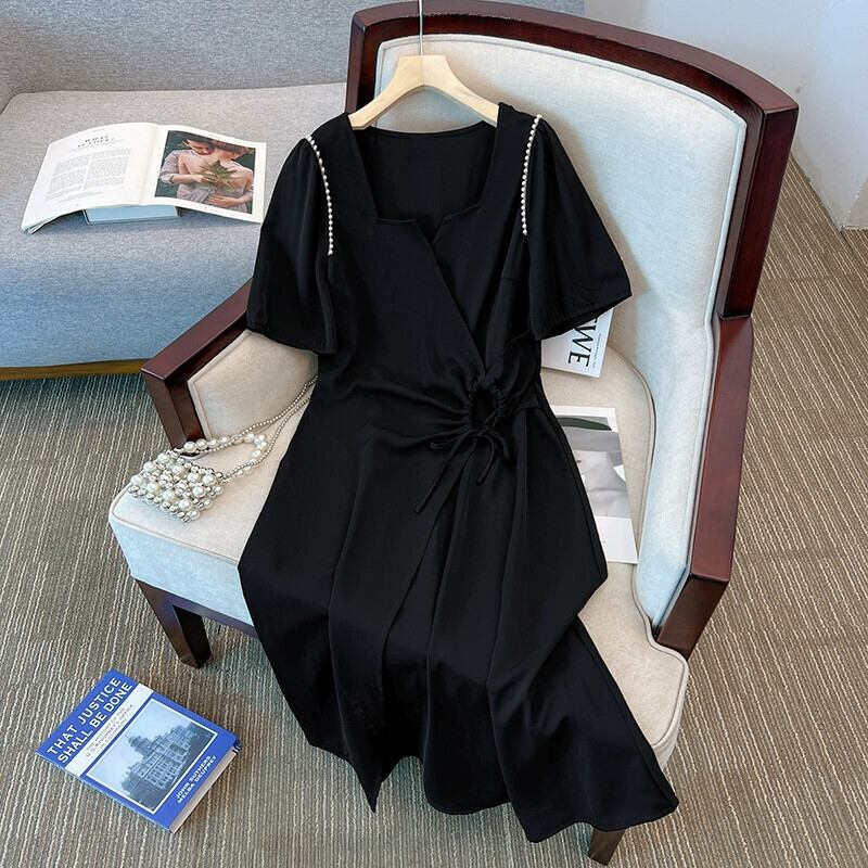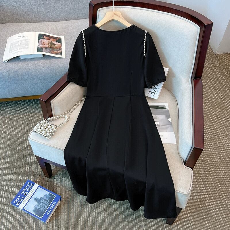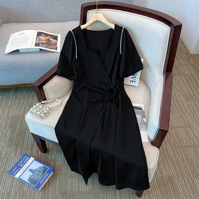 プラスサイズの女性の 2023 ファットシスター夏服ヘップバーンスタイルロングスカートパフスリーブスリム半袖ドレス ショート ハーフスリーブ 大きめサイズ サマー 夏物 8884137473571331
