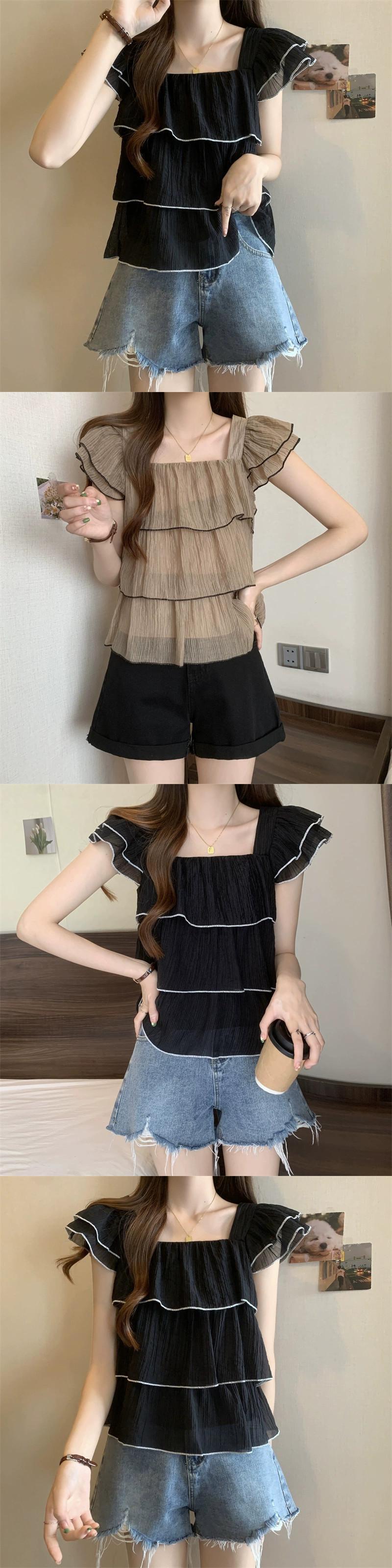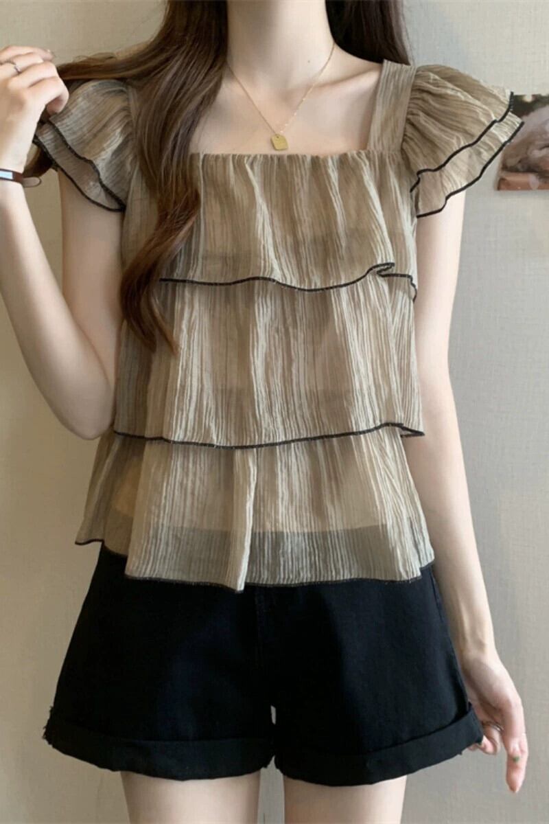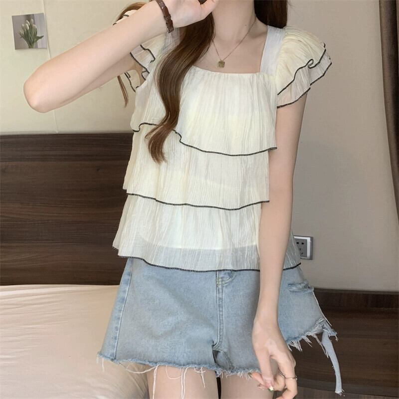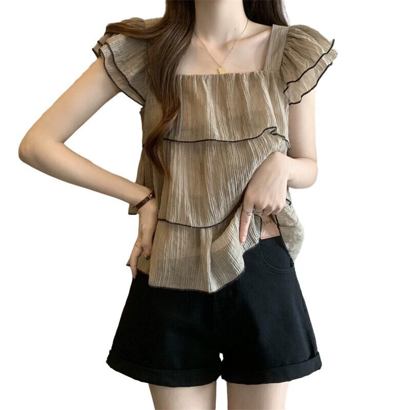 プラスサイズの女性の 2023 夏服ファット mm フレンチデザインフリルシフォンシャツ半袖シックカジュアルトップ 大きめサイズ サマー 夏物 8884143819052969