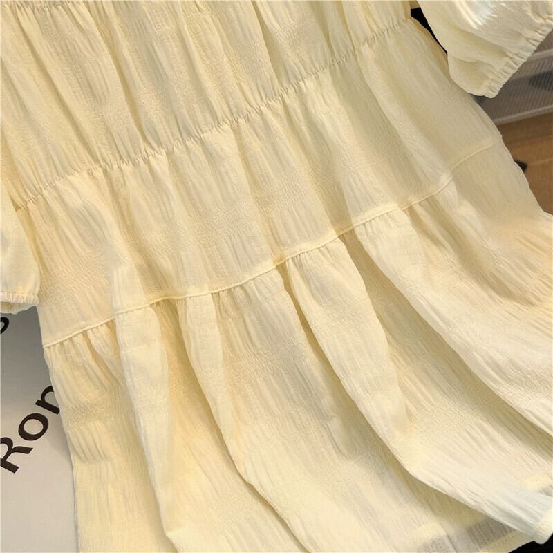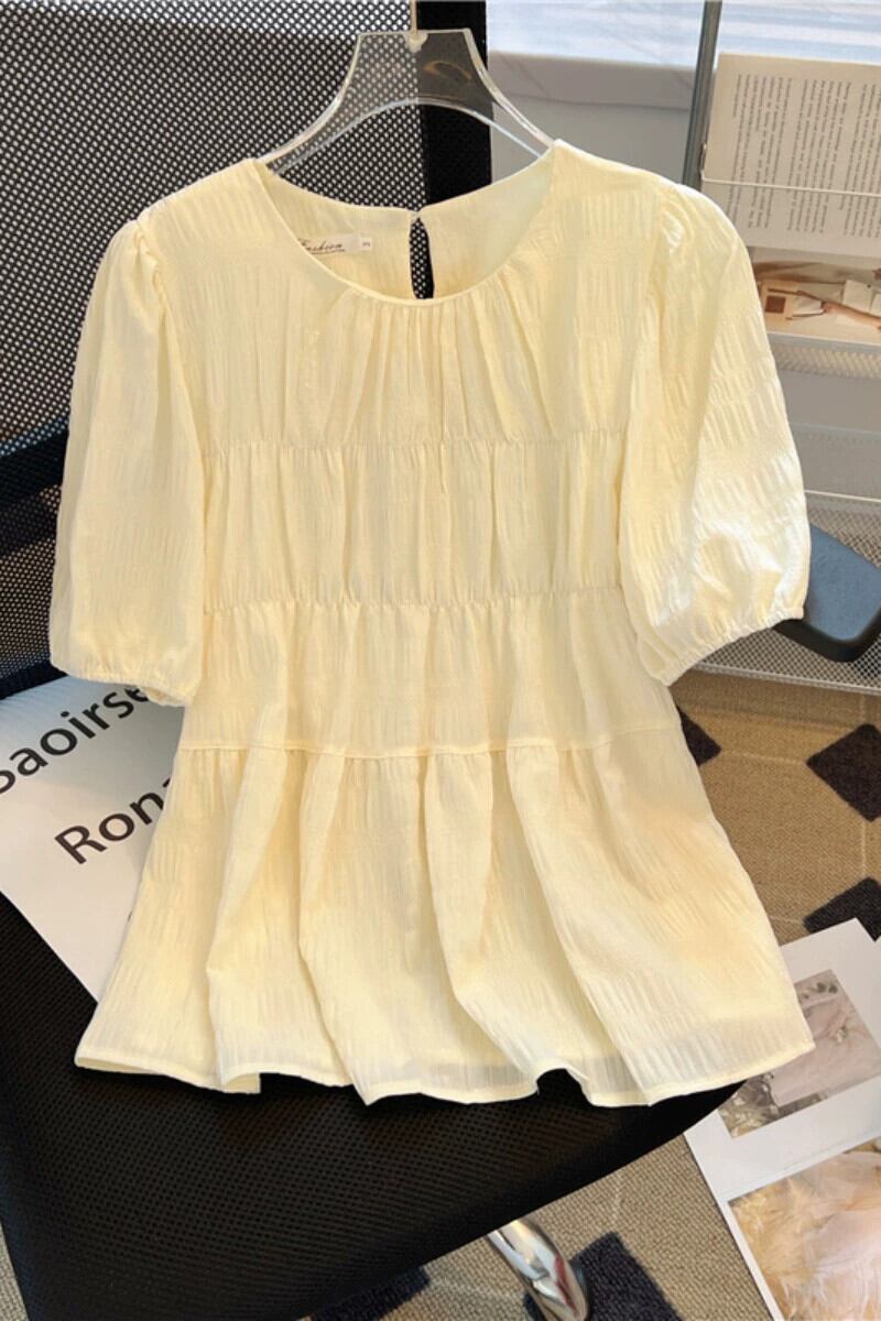 プラスサイズの女性の 2023 夏服脂肪年齢を減らすために緩い肉をカバーするシフォン シャツプリーツ ラウンド ネック半袖シックなトップ 大きめサイズ サマー 夏物 Oネック 8884115931909428