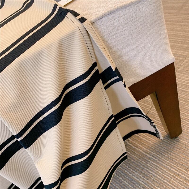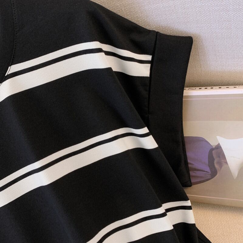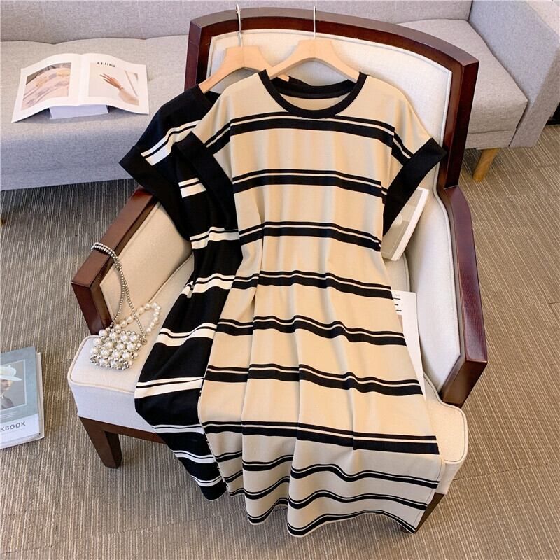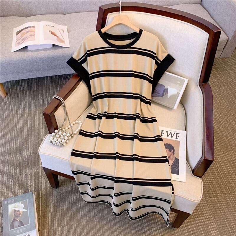 プラスサイズの女性の 2023 夏服脂肪ニッチ年齢軽減半袖ラウンドネック A ラインスカートストライプデザインドレス 大きめサイズ サマー 夏物 Oネック Aライン 8884166675136083