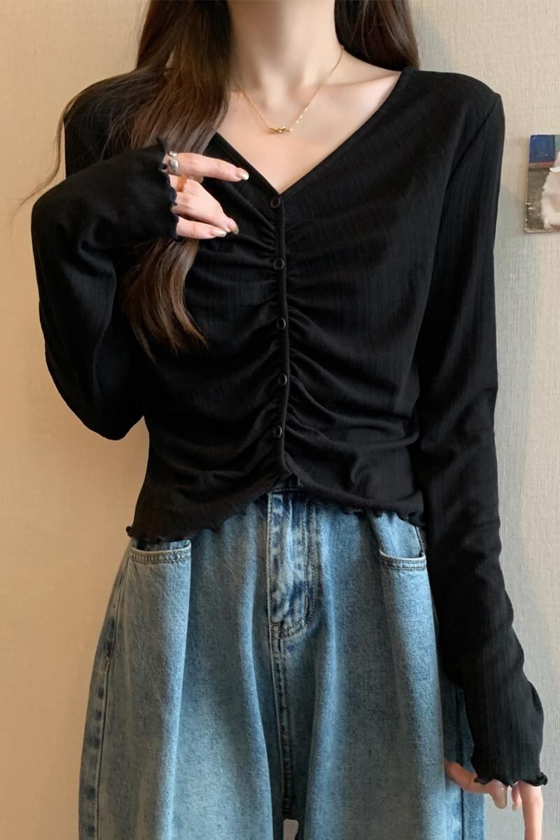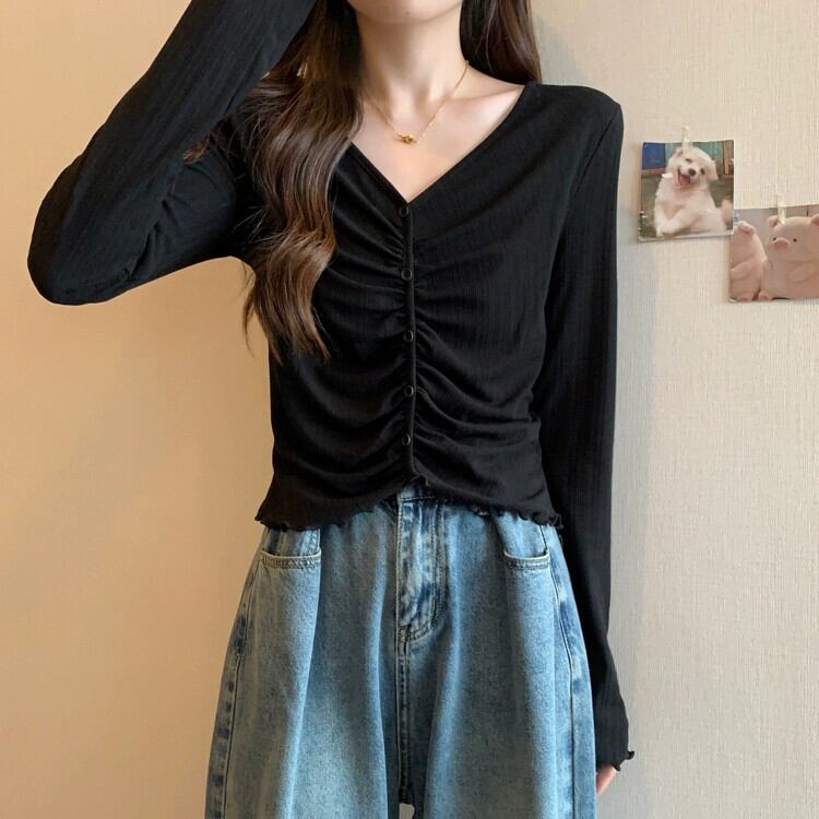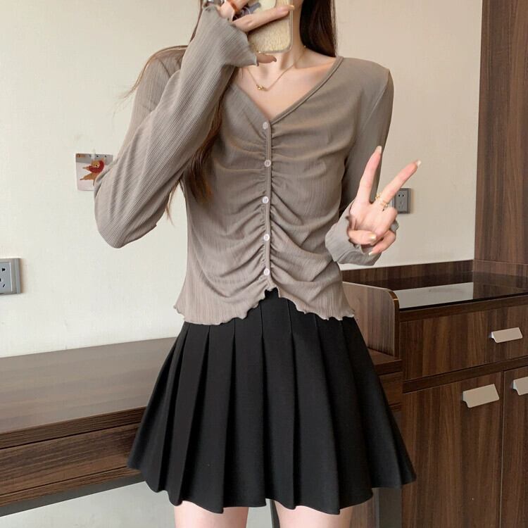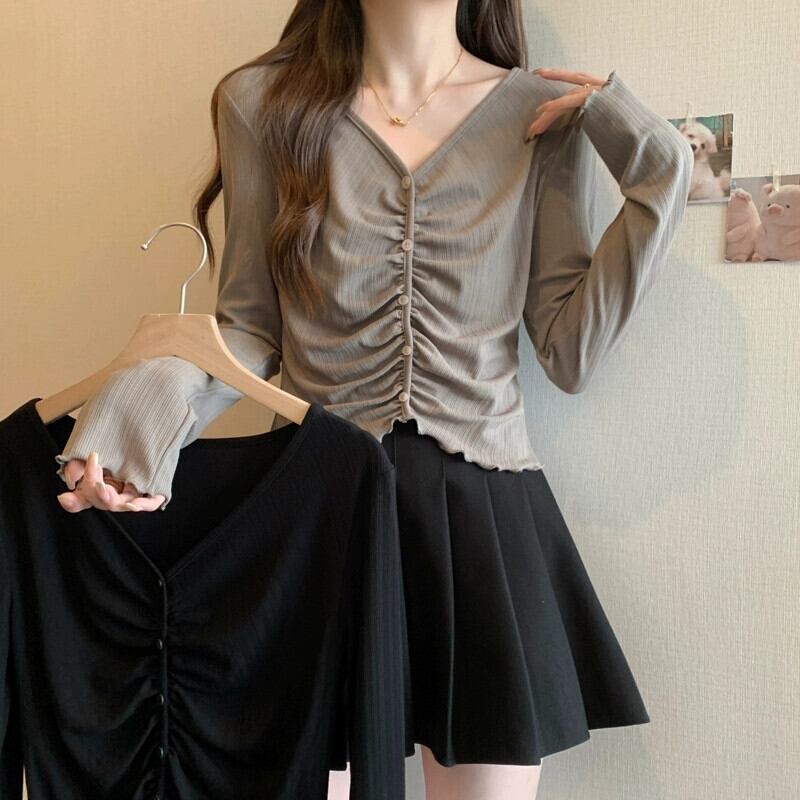 プラスサイズの婦人服 2023 秋服脂肪長袖右肩 Tシャツ多用途痩身菌プリーツファッショントップ ロング 大きめサイズ オータム 秋物 8884160578800839