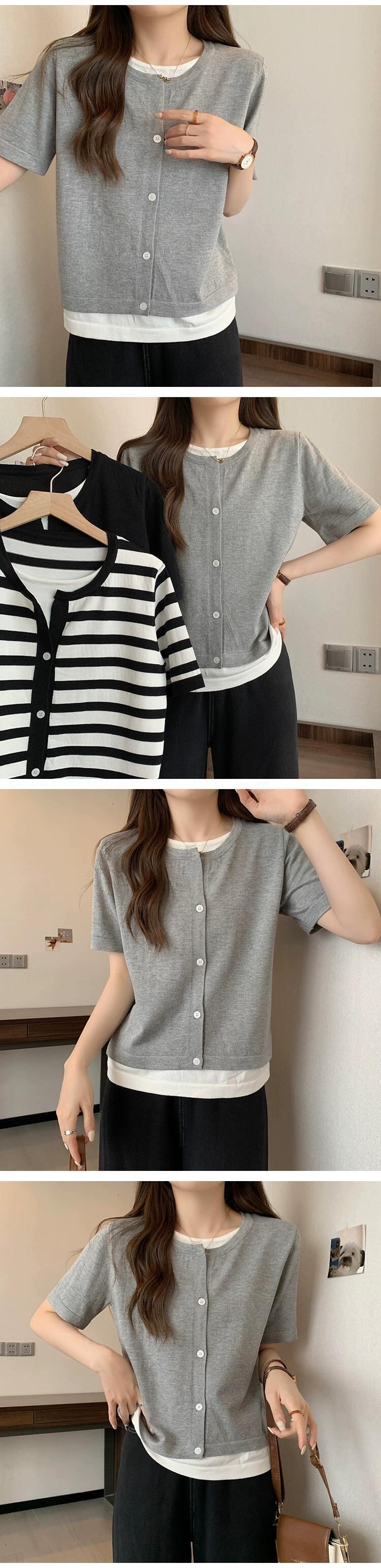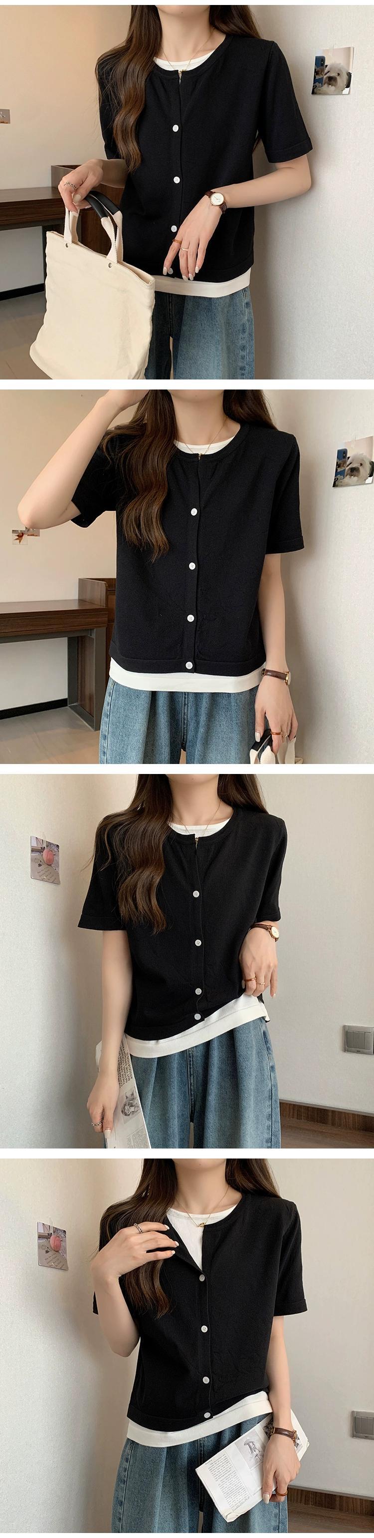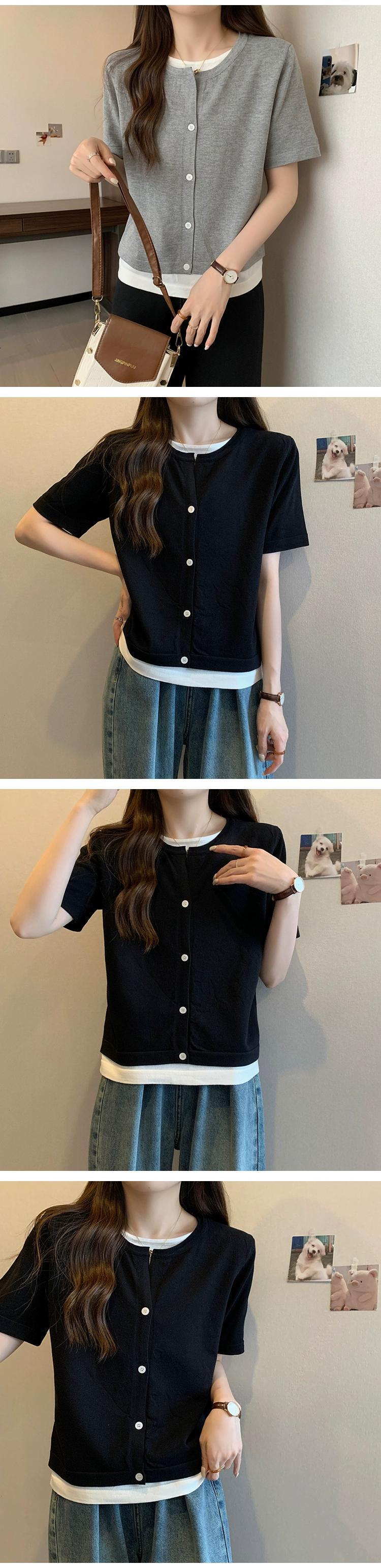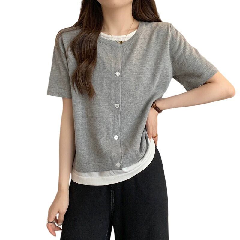 プラスサイズの婦人服 2023 トレンディな夏の新しいファットシスタールーズフェイクツーピースニット半袖 T シャツ多用途年齢軽減トップ 大きめサイズ サマー 夏物 Tシャツ 8884153383451330