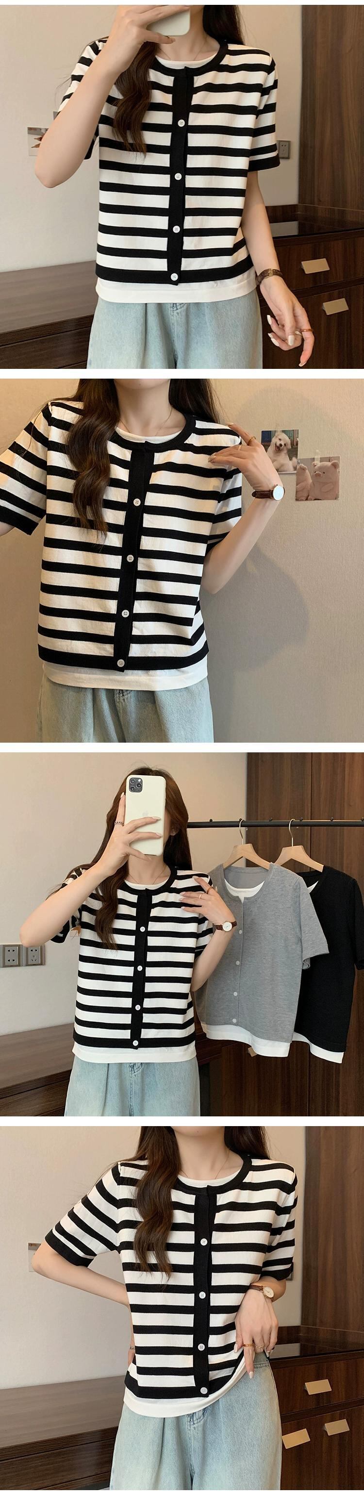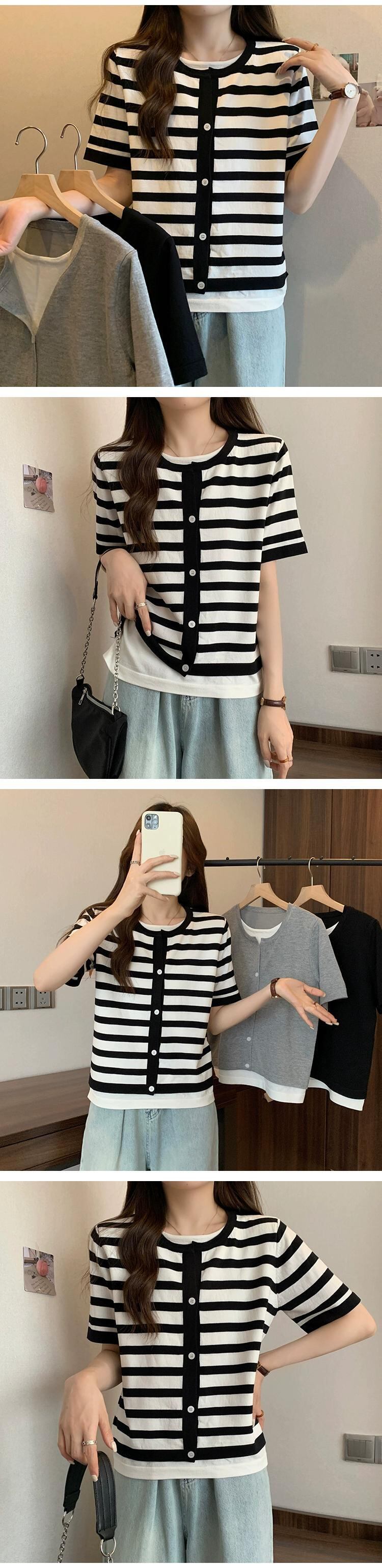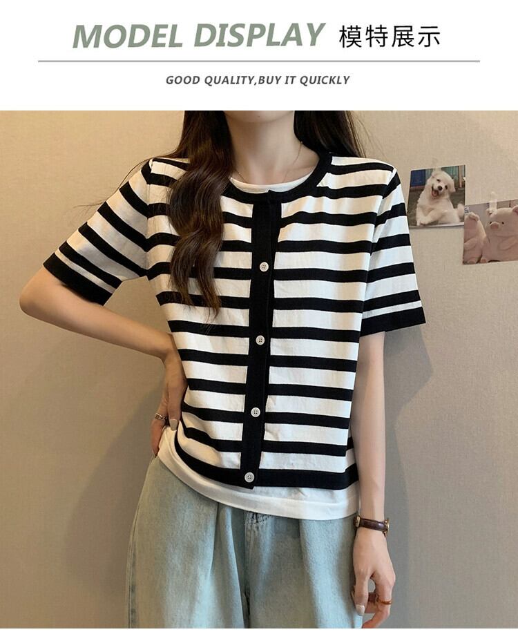 プラスサイズの婦人服 2023 トレンディな夏の新しいファットシスタールーズフェイクツーピースニット半袖 T シャツ多用途年齢軽減トップ 大きめサイズ サマー 夏物 Tシャツ 8884153383451330