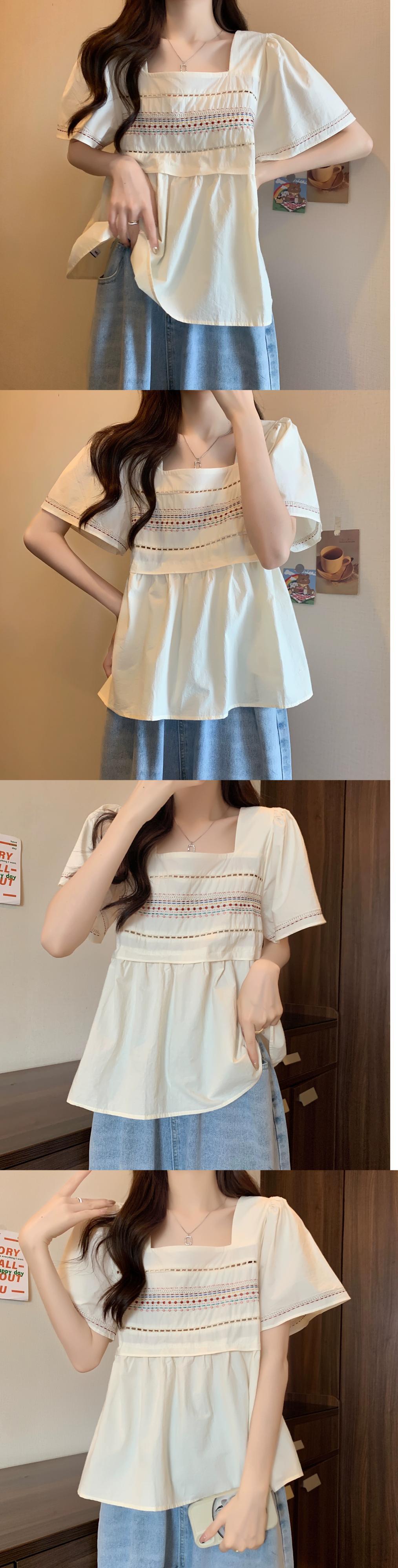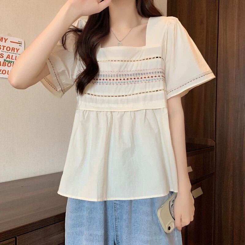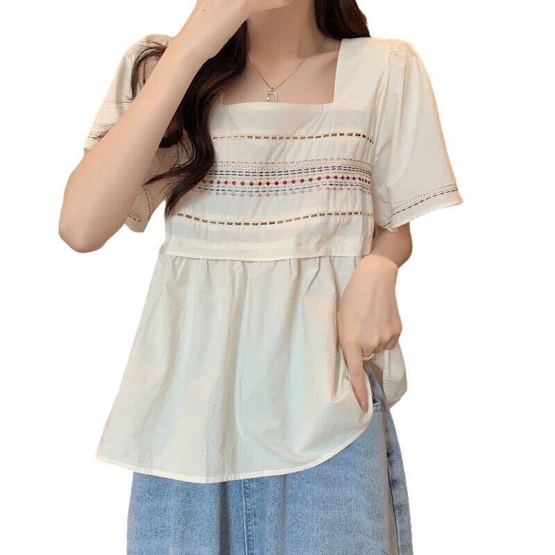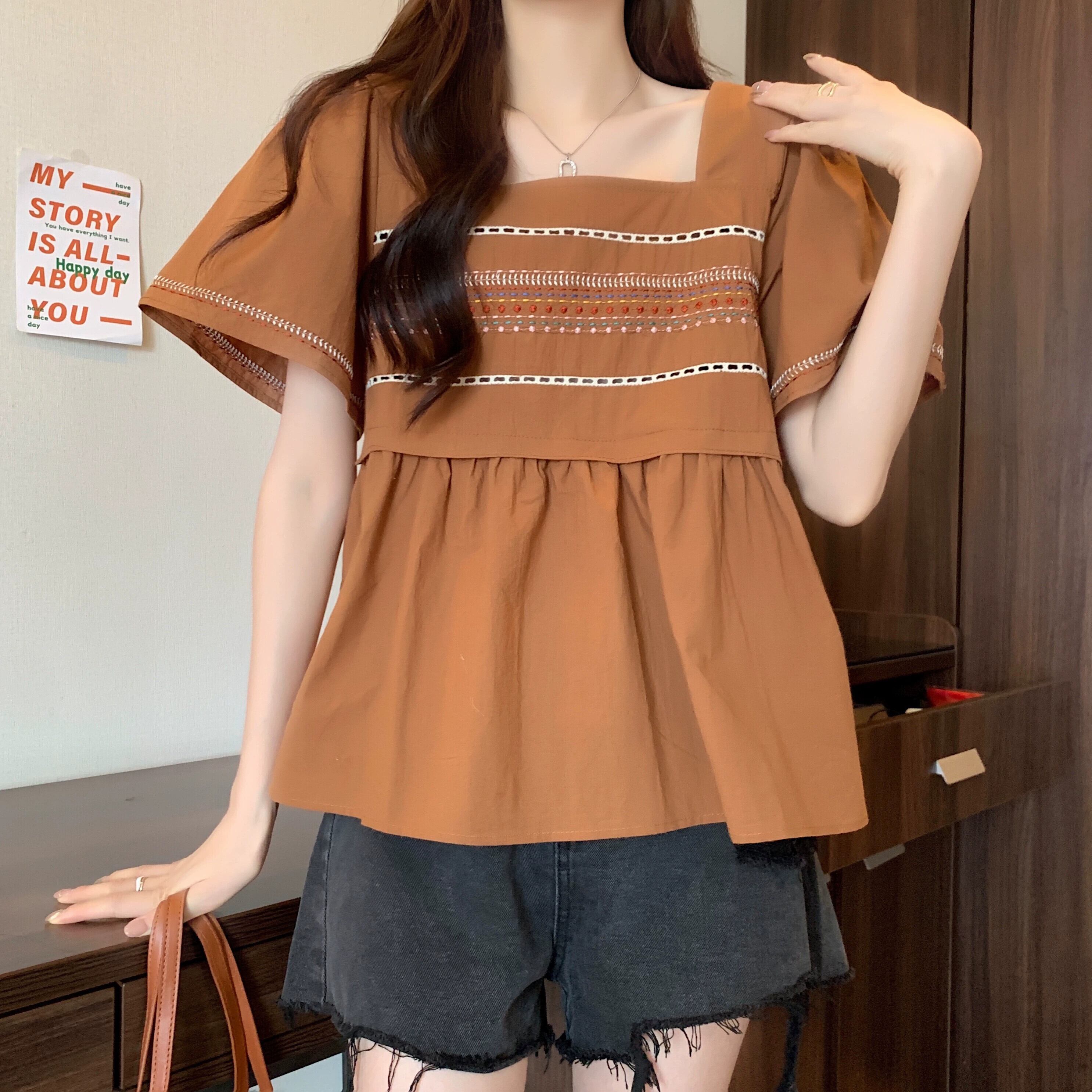 プラスサイズの婦人服 2023 トレンディな夏の新しいスタイル脂肪ファッションスリムシャツ刺繍ハイエンドスクエアカラー年齢軽減トップ レッド 大きめサイズ サマー 夏物 スクウェア 8884182923517543