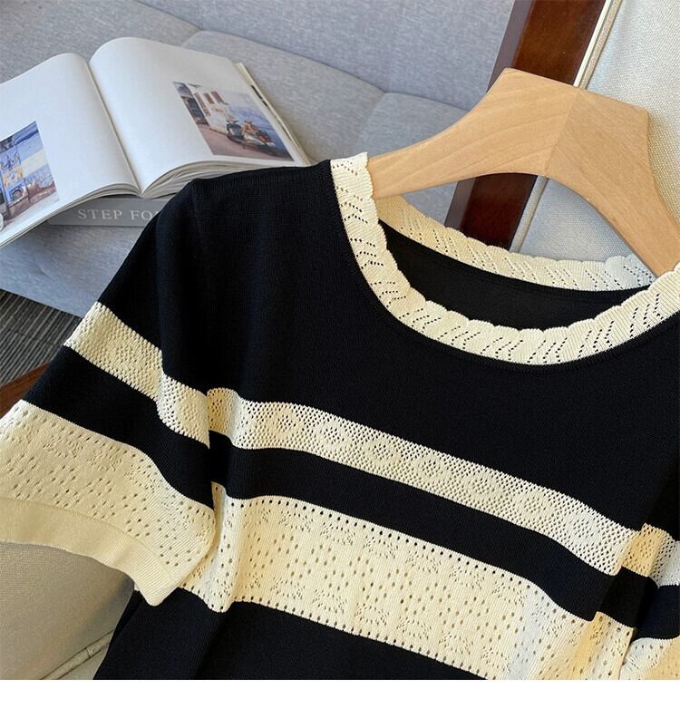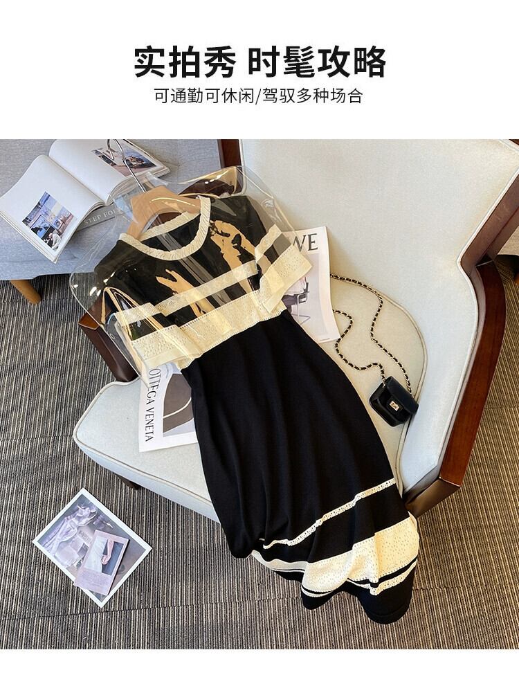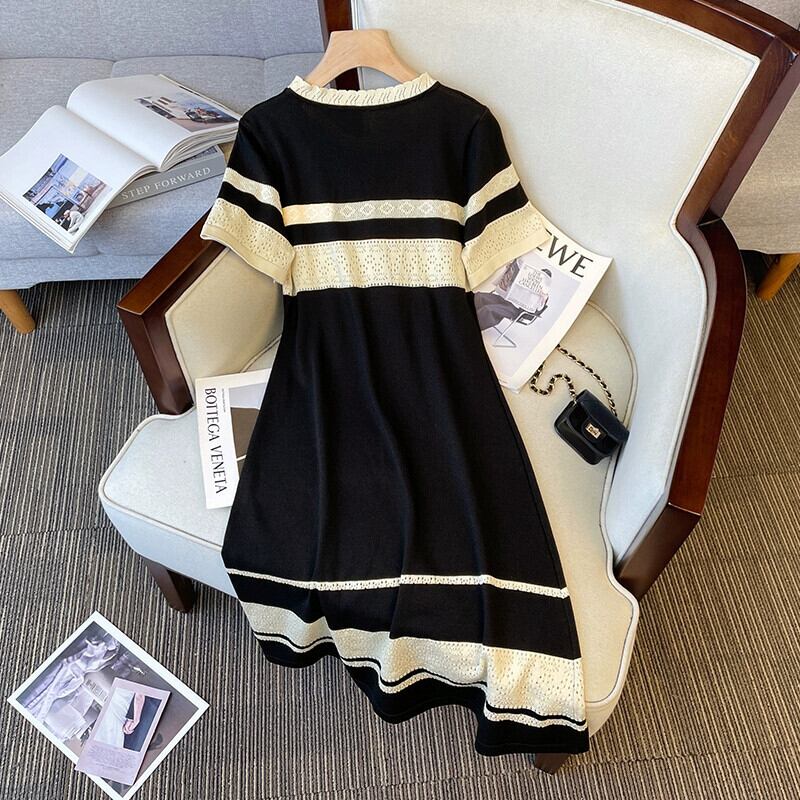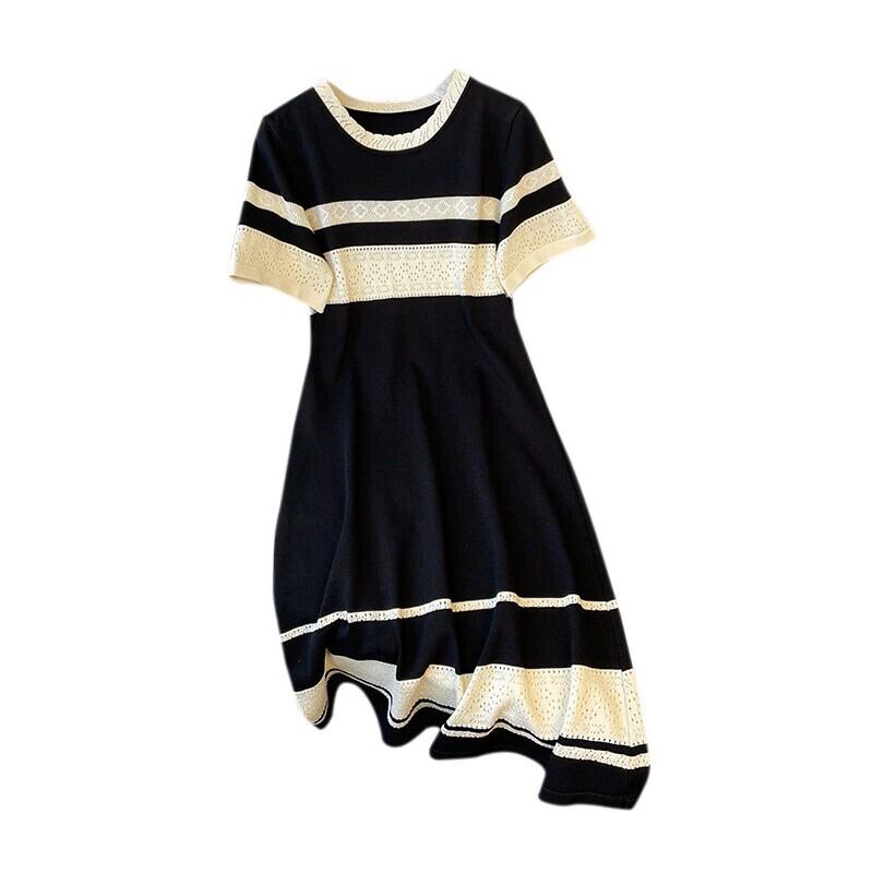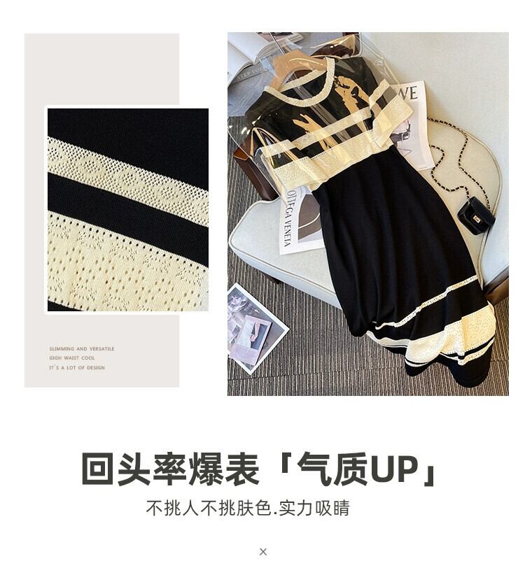 プラスサイズの女性の 2023 夏服脂肪女の子コントラストカラーフレンチ中空 A ラインスカートラウンドネックニットドレス 大きめサイズ サマー 夏物 Oネック Aライン 888418309182824