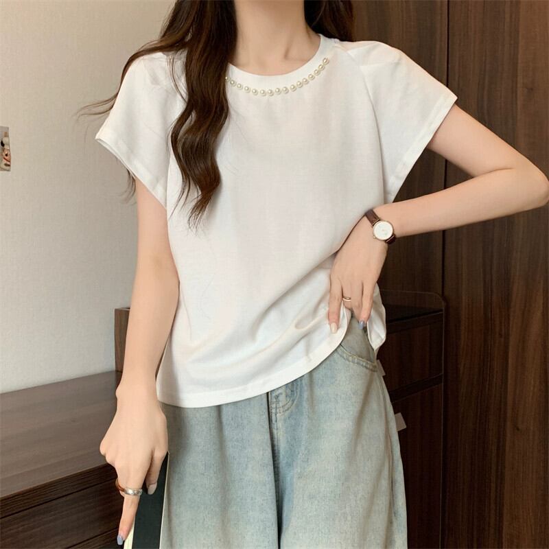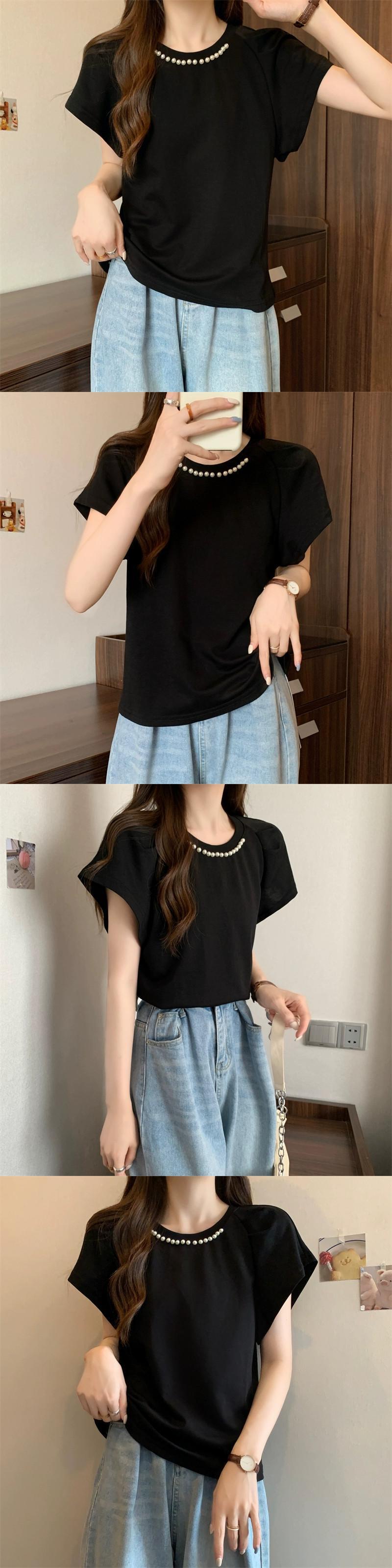 プラスサイズの婦人服 2023 ファットシスター夏服新デザインニッチプリーツビーズ痩身半袖 Tシャツトップ 大きめサイズ サマー 夏物 8884167307589583