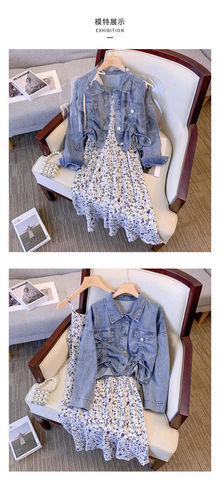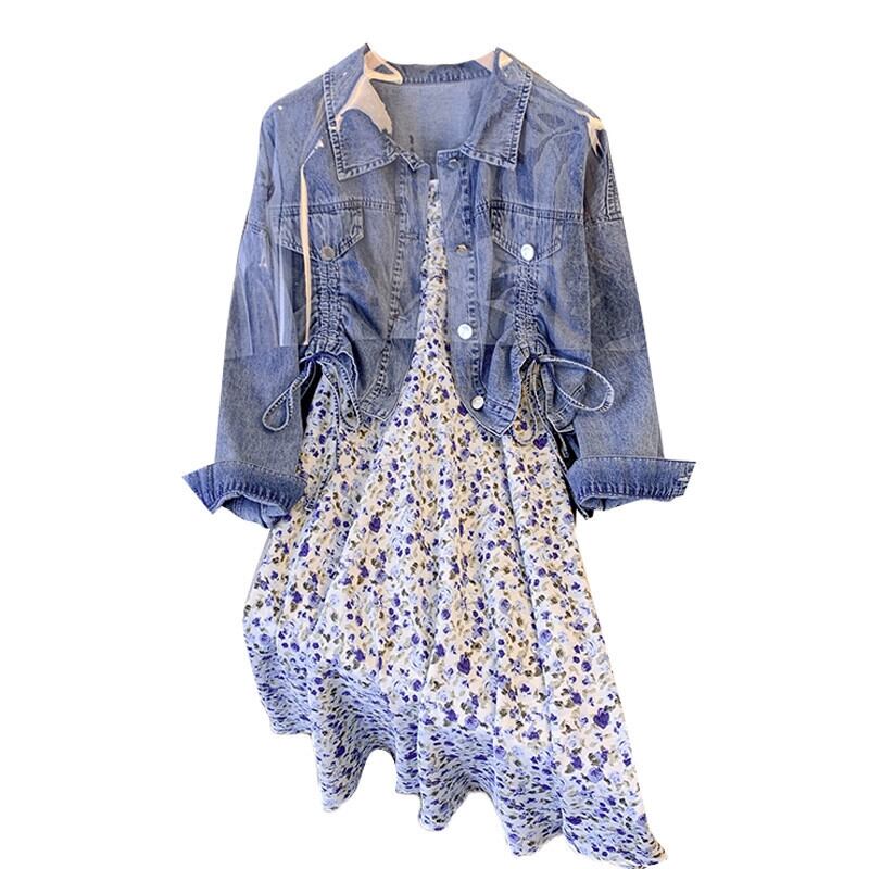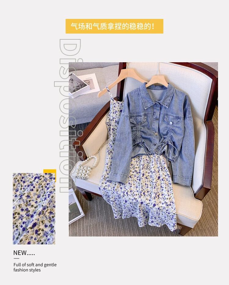 プラスサイズの女性の 2023 ファットシスター秋服新しいスタイル巾着デニムジャケット花柄サスペンダースカート 2 点セット 大きめサイズ オータム 秋物 8884121712980688