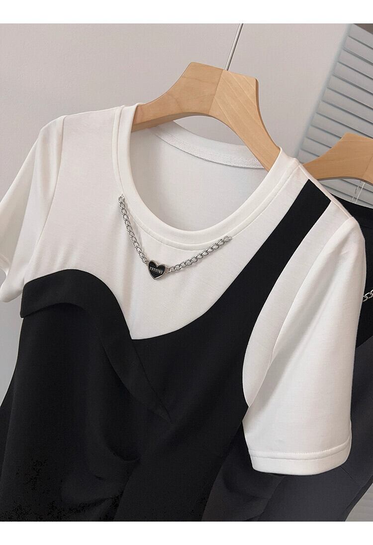 プラスサイズの婦人服 2023 流行の夏の新しいファットシスターフレンチフェイクツーピーススカート非対称プリーツスリムドレス 大きめサイズ サマー 夏物 8884121593038997