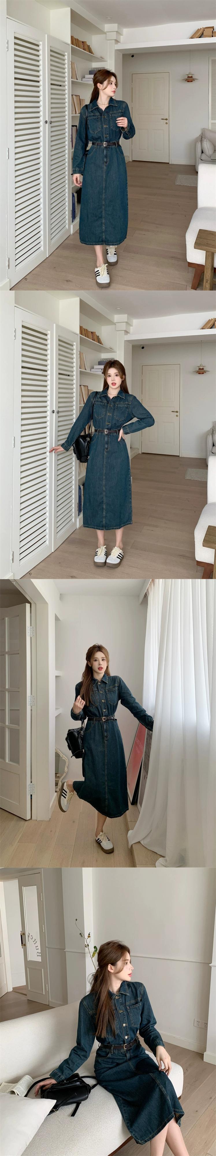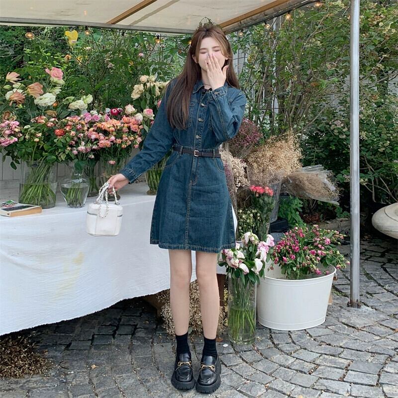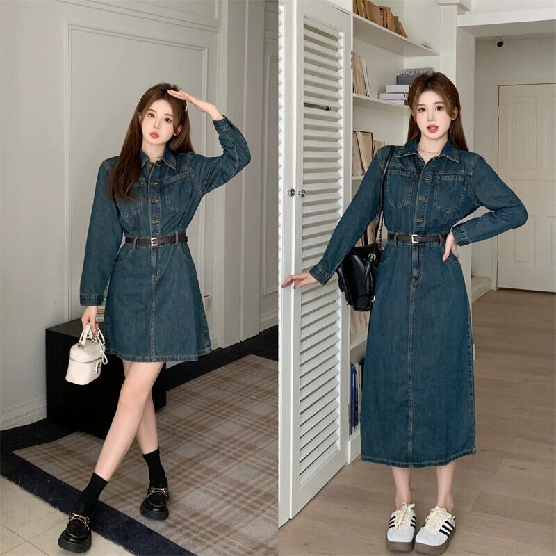 プラスサイズの婦人服 2023 秋服の脂肪を軽減し、年齢、気質、デザインセンスを軽減する A ラインスカートが股間をカバーする長袖デニムドレス ロング 大きめサイズ オータム 秋物 Aライン 8884178928047545