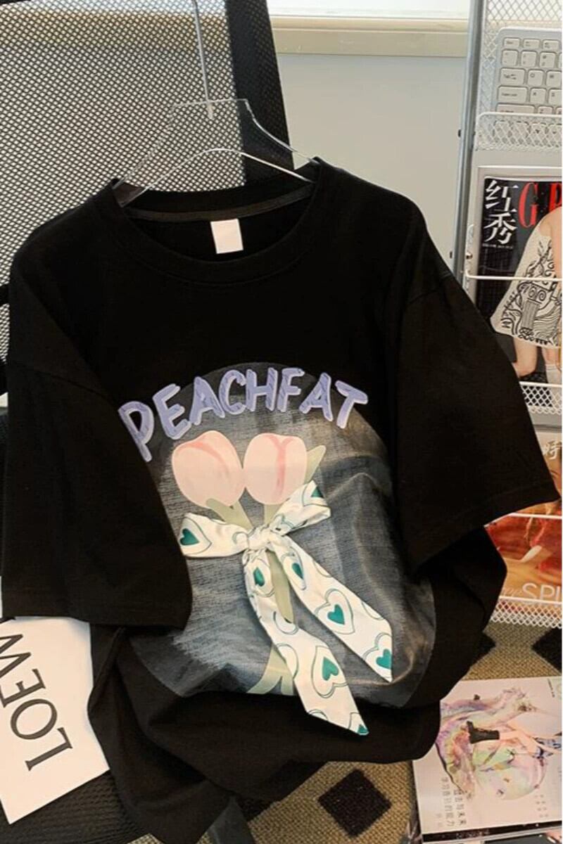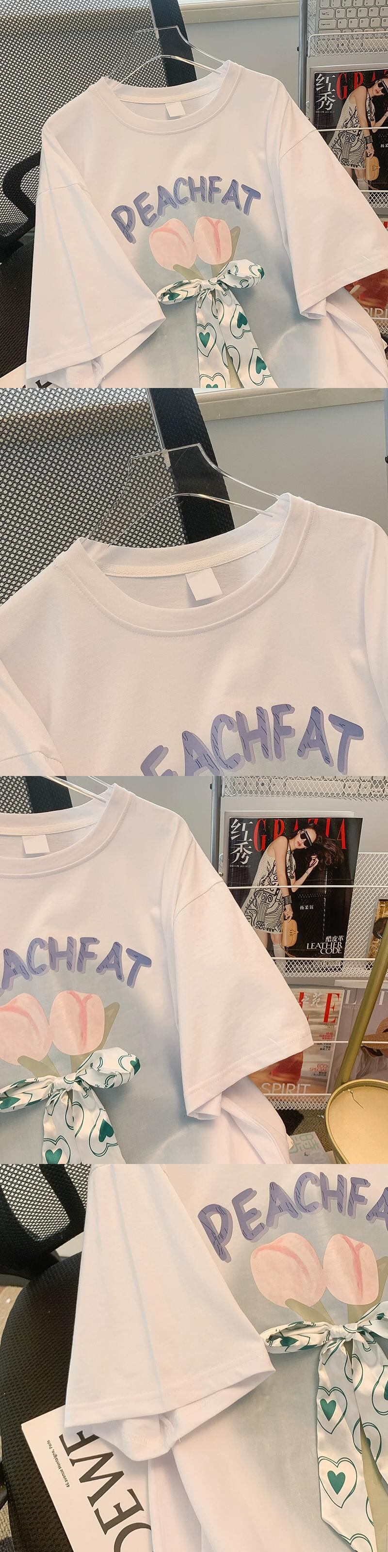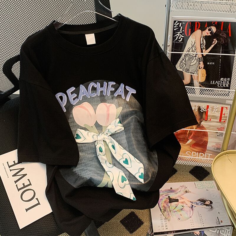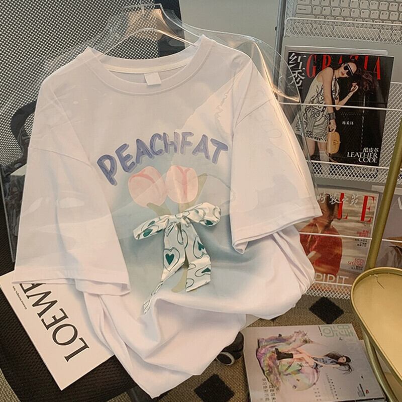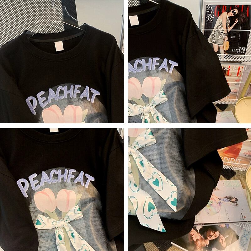 プラスサイズの女性の 2023 ファットシスター夏服デザインプリントリボン立体装飾半袖 Tシャツトップ 大きめサイズ サマー 夏物 888416171621966