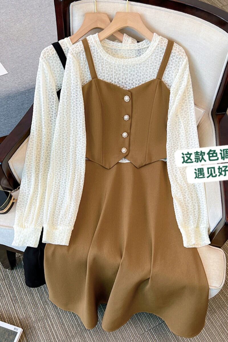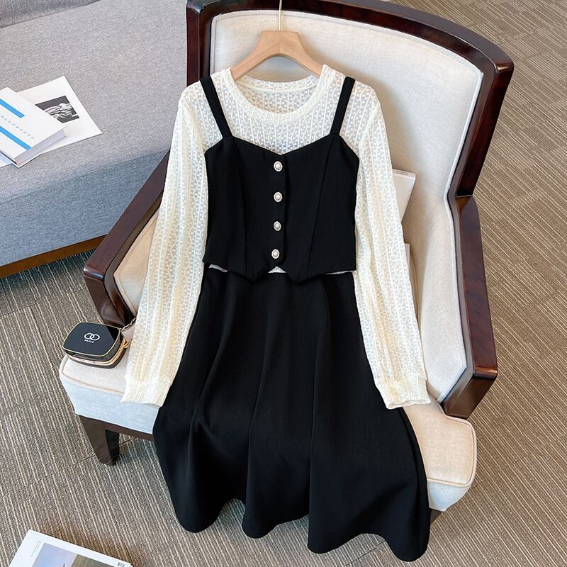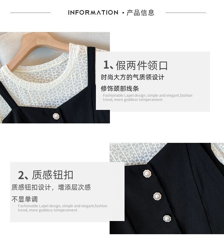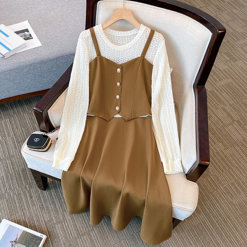 プラスサイズの婦人服 2023 秋服脂肪ニッチフランスの気質偽ツーピース A ラインスカートレース痩身ドレス 大きめサイズ オータム 秋物 Aライン 888413120794869