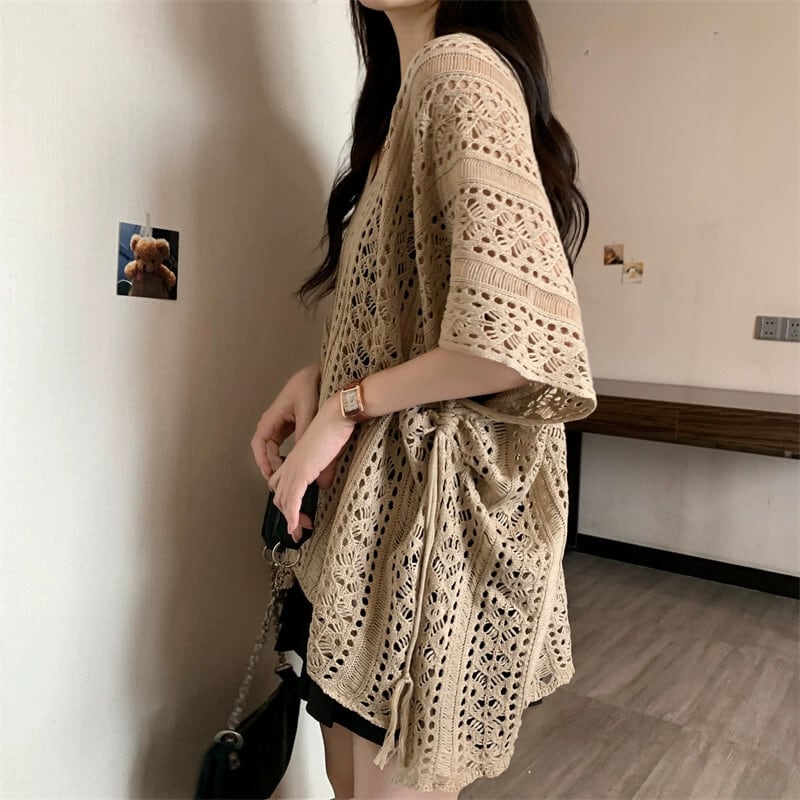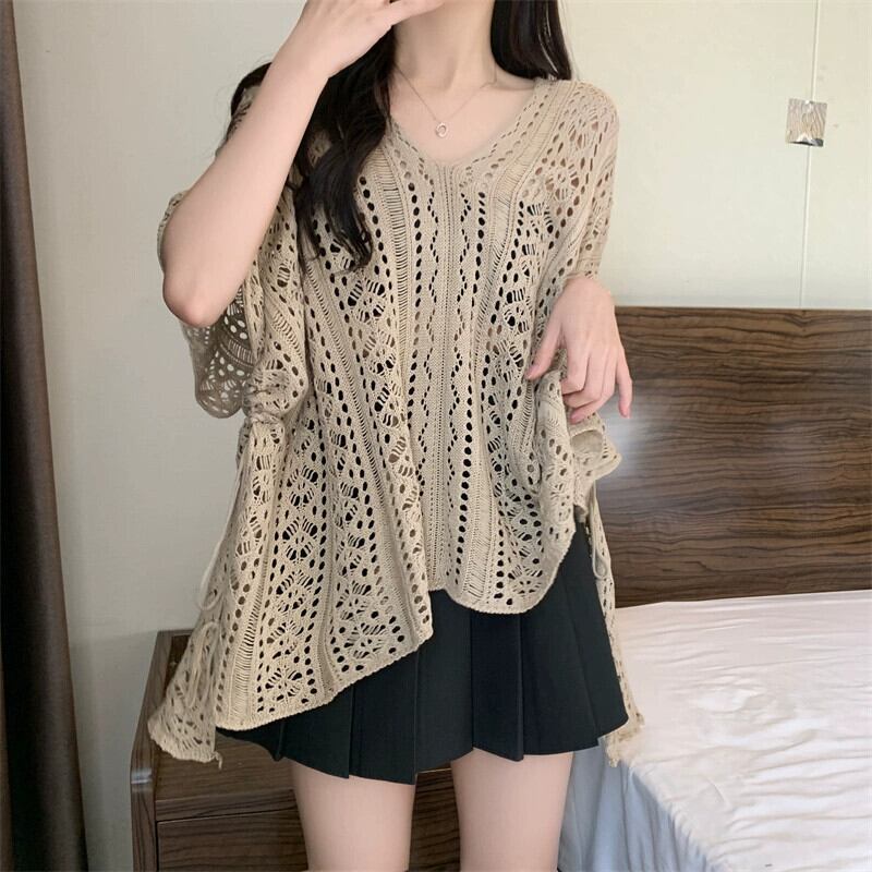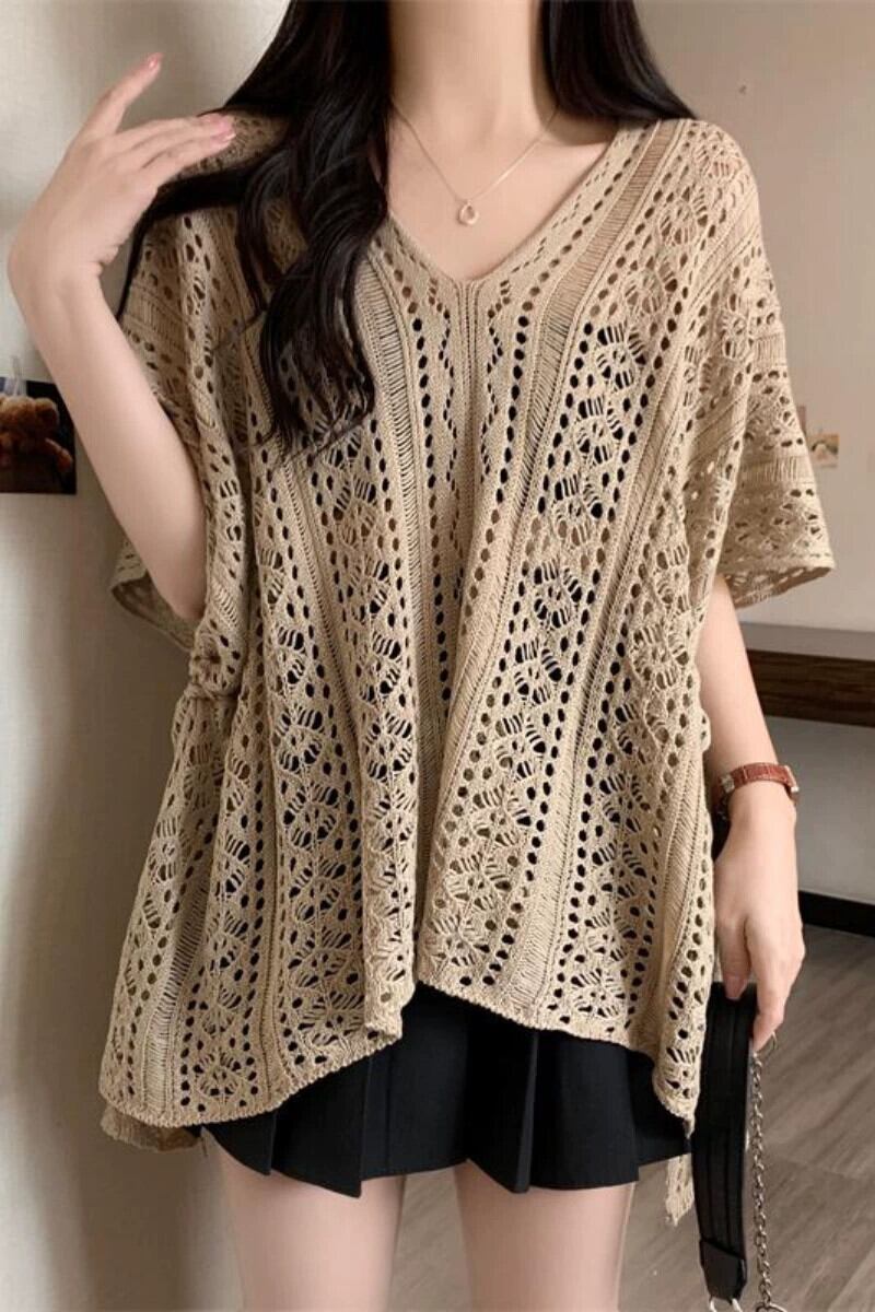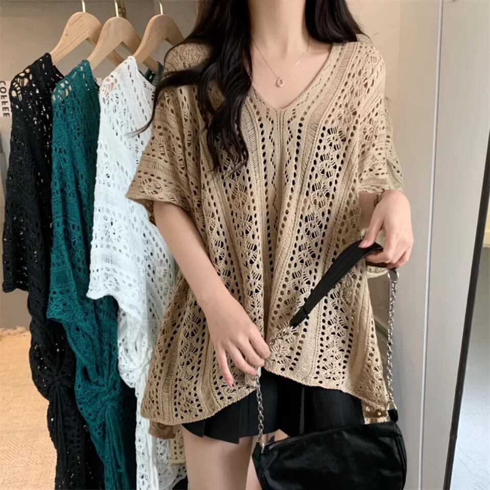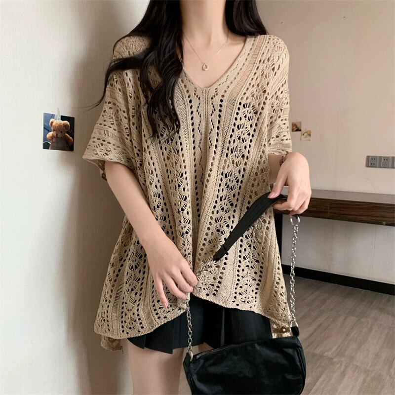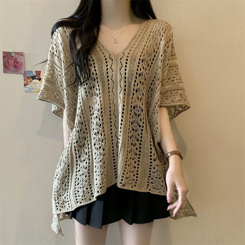 プラスサイズの婦人服 2023 脂肪姉妹夏の新スタイル eign スタイルルーズレースニットウール中空半袖ブラウストップ 大きめサイズ サマー 夏物 8884180447623099