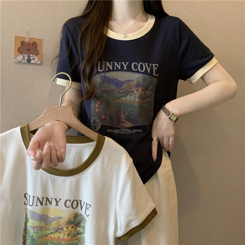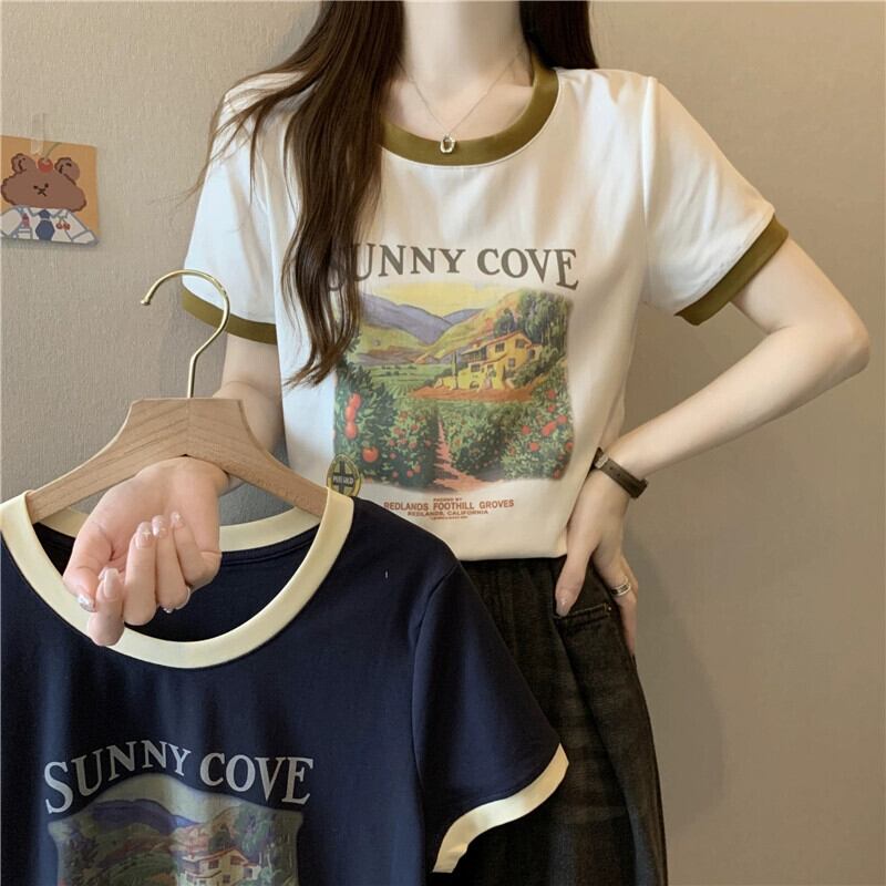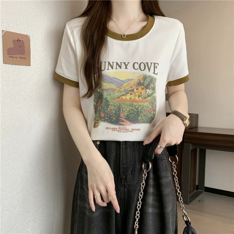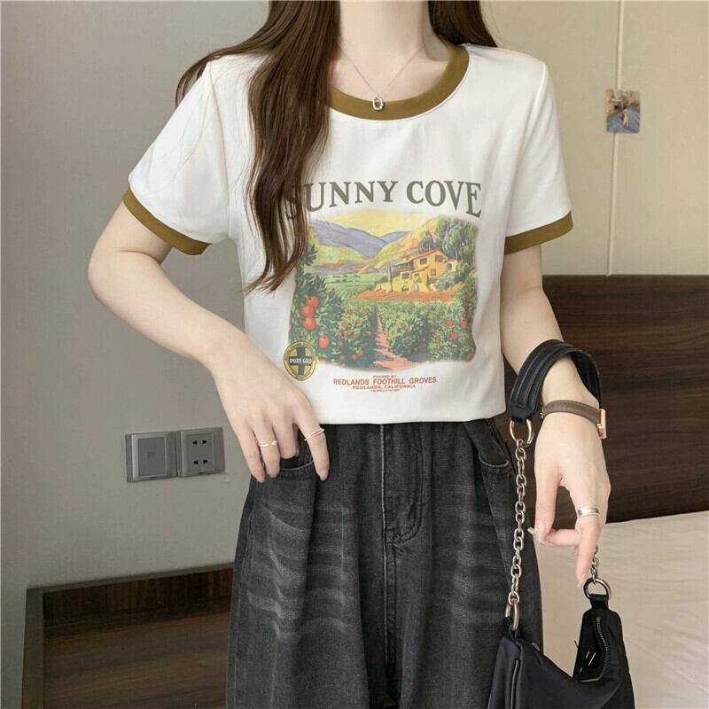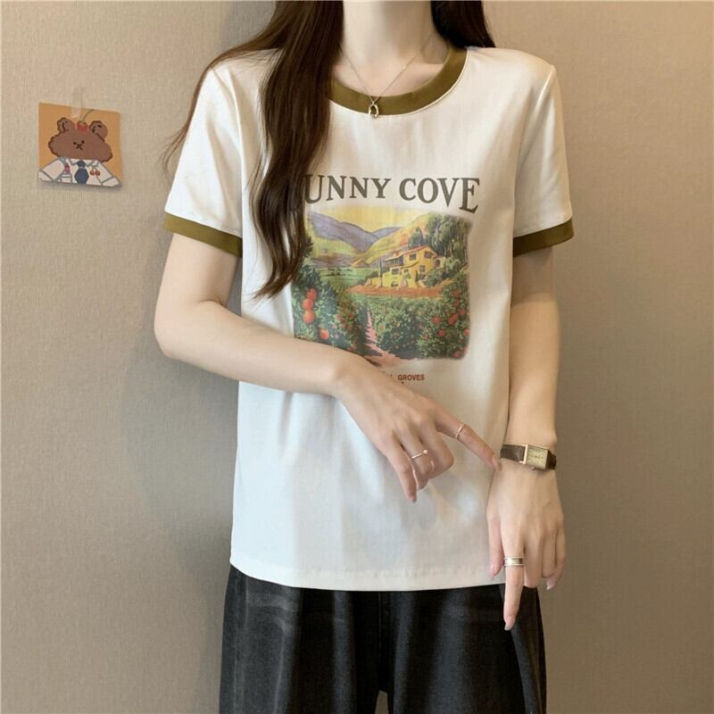 プラスサイズの婦人服 2023 ファットシスター夏新カジュアル半袖カジュアル痩身油絵カラーマッチング年齢低減 Tシャツトップ 大きめサイズ サマー 夏物 8884138388702416