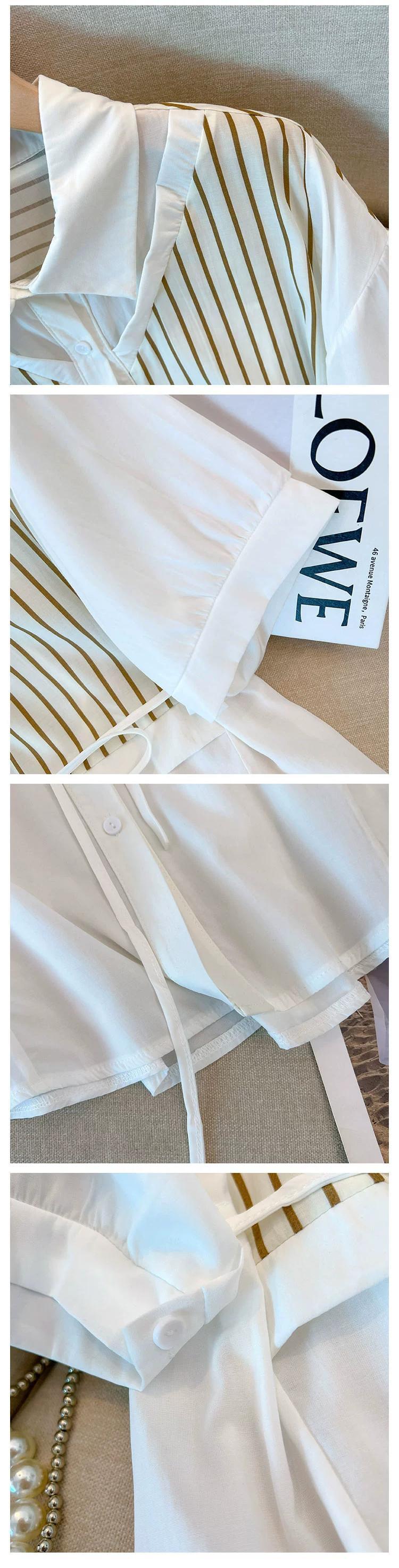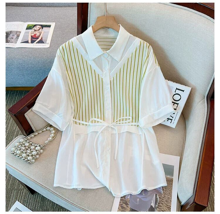 プラスサイズの女性の 2023 夏服ファットフェイクツーピースストライプシャツ、ファッショナブル、年齢軽減、痩身、お腹カバー、多用途トップス 大きめサイズ サマー 夏物 8884129890952863