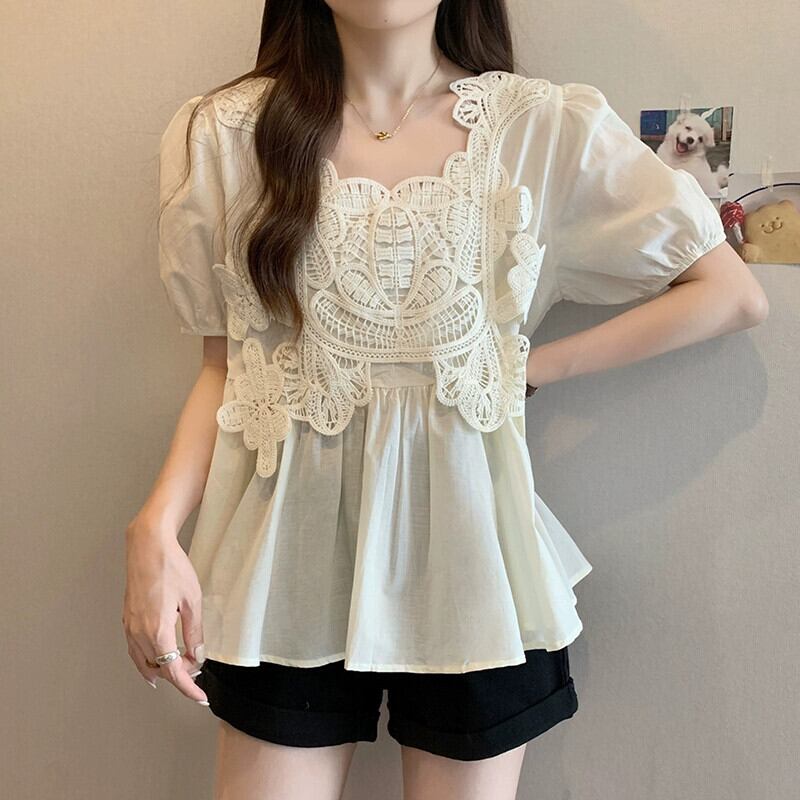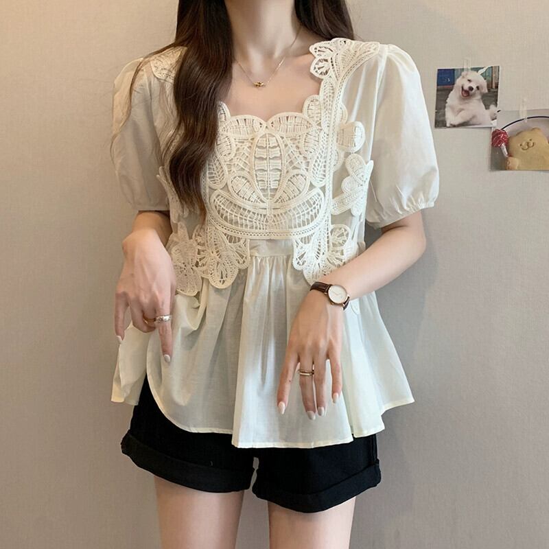 プラスサイズの婦人服 2023 脂肪姉妹夏新スタイル痩身ウェア巾着重工業レース刺繍シャツシャツ レッド 大きめサイズ サマー 夏物 8884117009129159