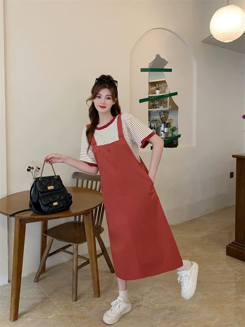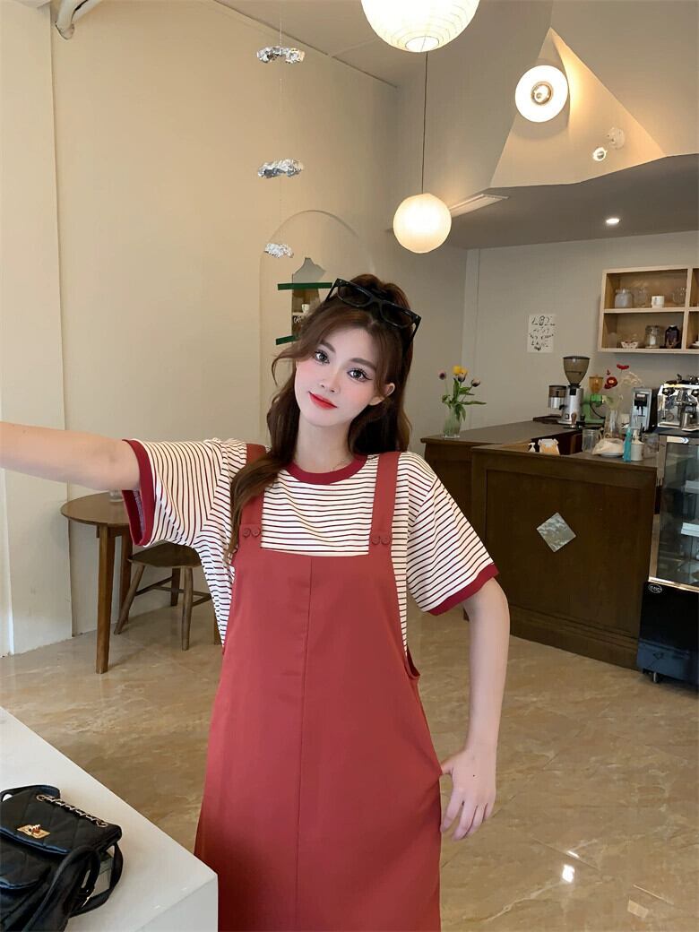 プラスサイズの女性の 2023 夏服脂肪ニッチ年齢軽減ルーズ T シャツデザイン無地サスペンダースカート 2 点セット 大きめサイズ サマー 夏物 Tシャツ ソリッドカラー 8884120738781069